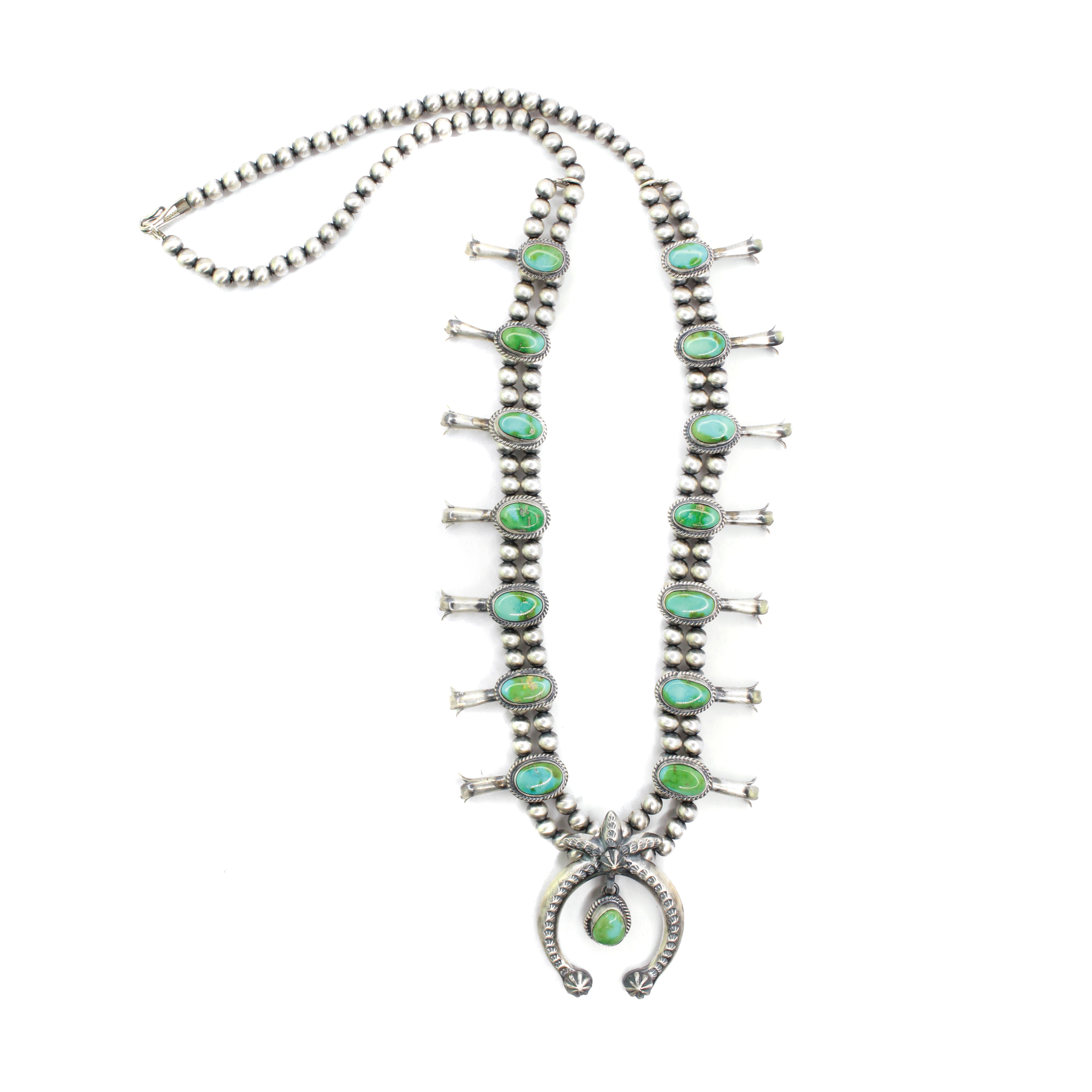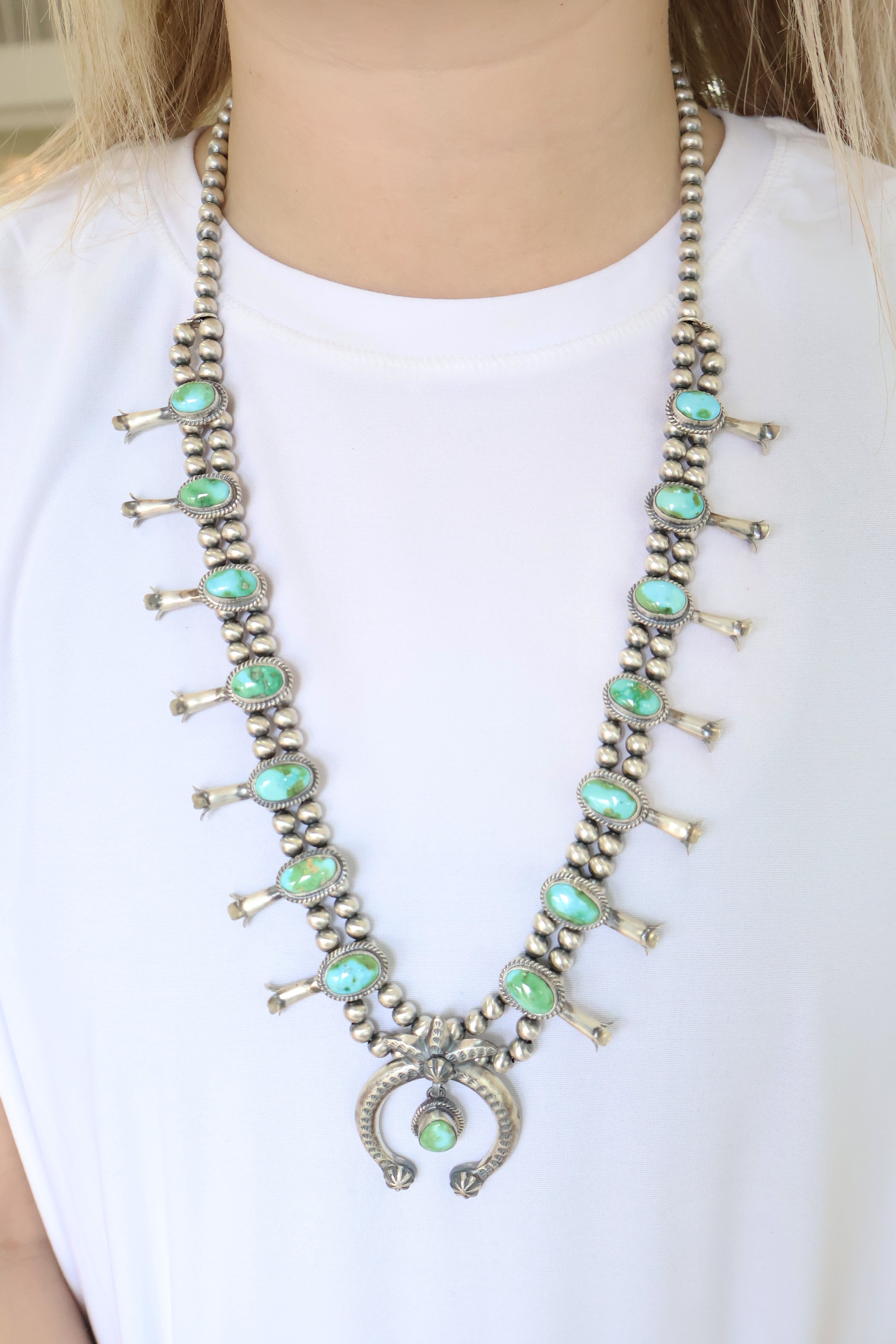 The 'end to end' length listed for Squash Blossom necklaces is measured from clasp to hook and does not include the 'drop' of the Naja. For a more accurate length reference, model photos are provided. Additionally, Naja measurements are also included to give a complete view of the necklace's dimensions.