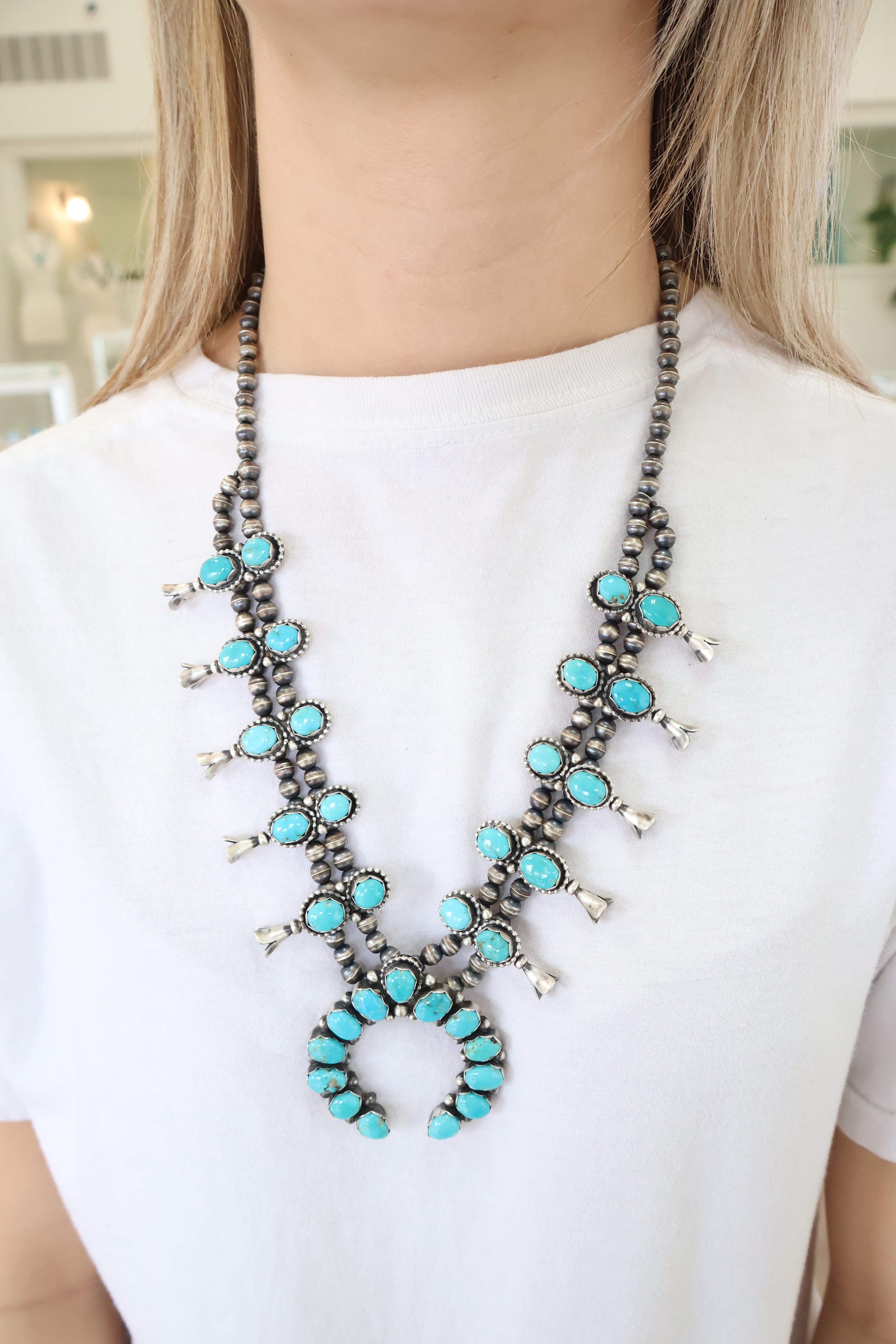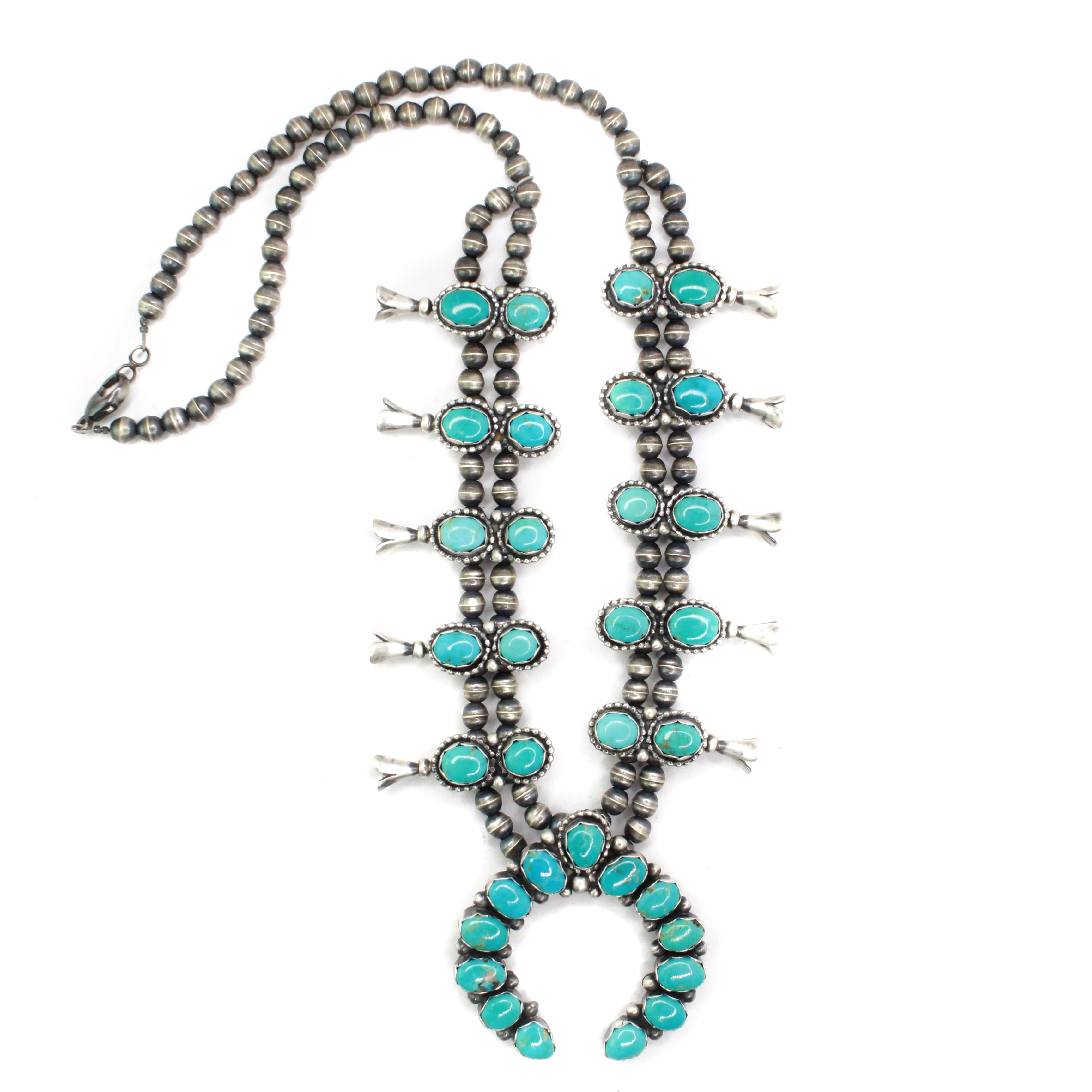 The 'end to end' length listed for Squash Blossom necklaces is measured from clasp to hook and does not include the 'drop' of the Naja. For a more accurate length reference, model photos are provided. Additionally, Naja measurements are also included to give a complete view of the necklace's dimensions.