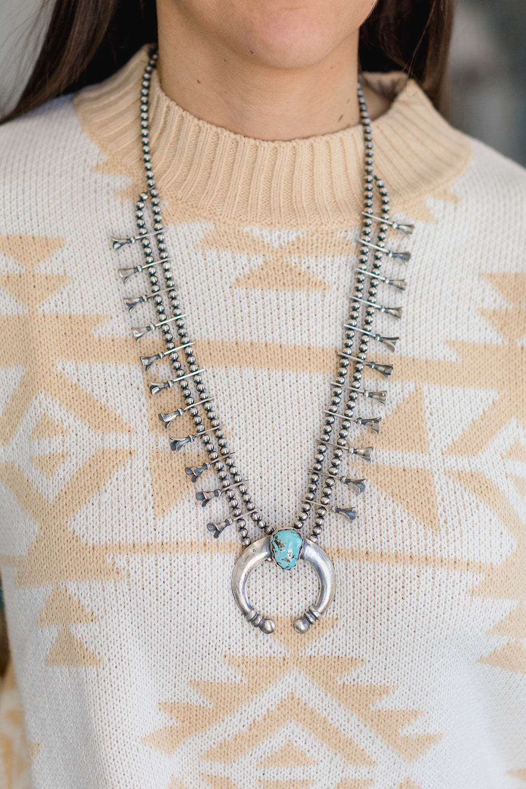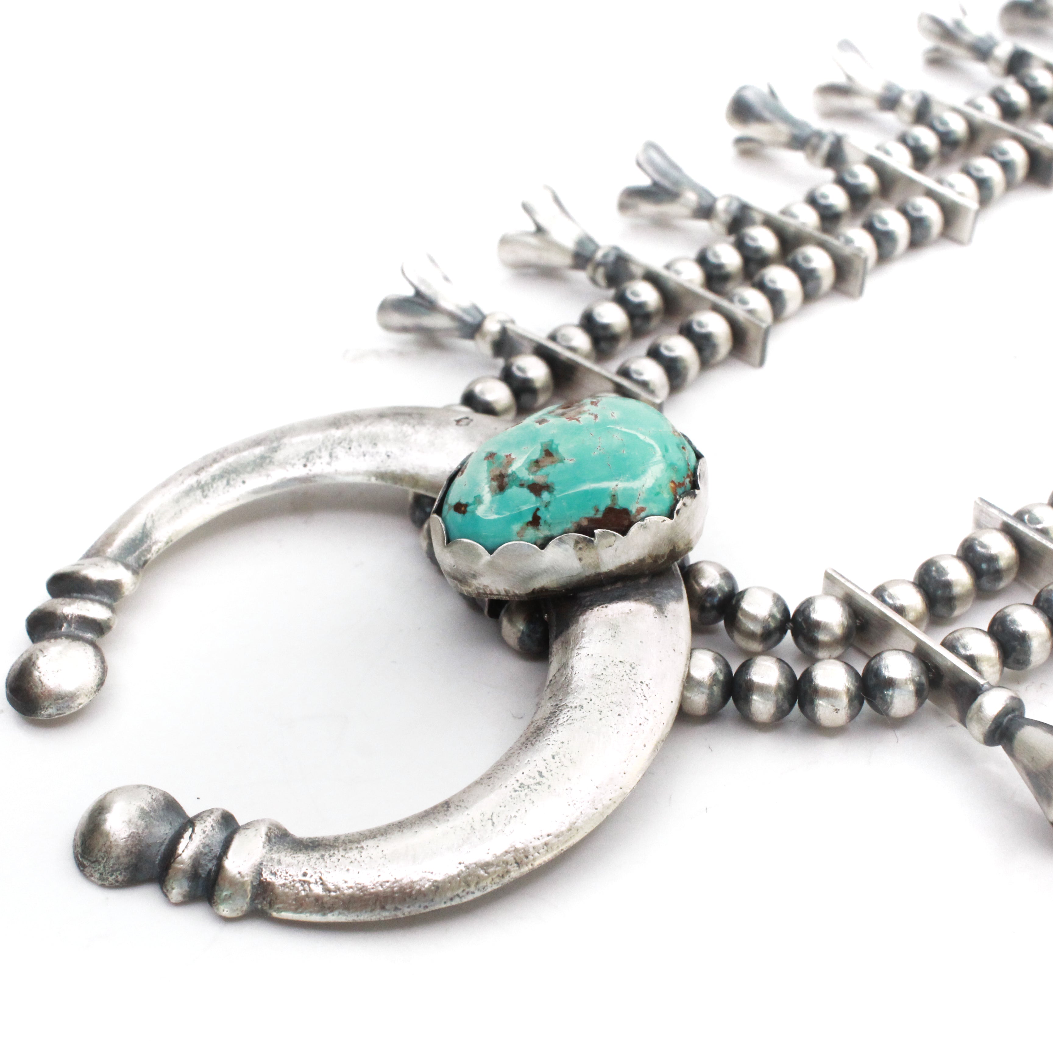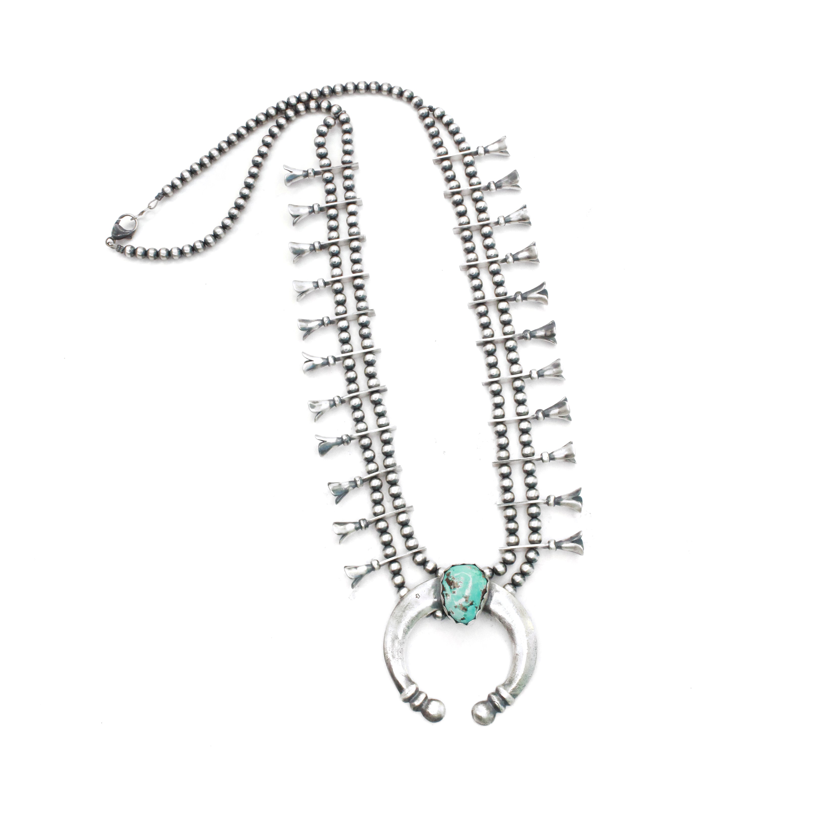The 'end to end' length listed for Squash Blossom necklaces is measured from clasp to hook and does not include the 'drop' of the Naja. For a more accurate length reference, model photos are provided. Additionally, Naja measurements are also included to give a complete view of the necklace's dimensions.