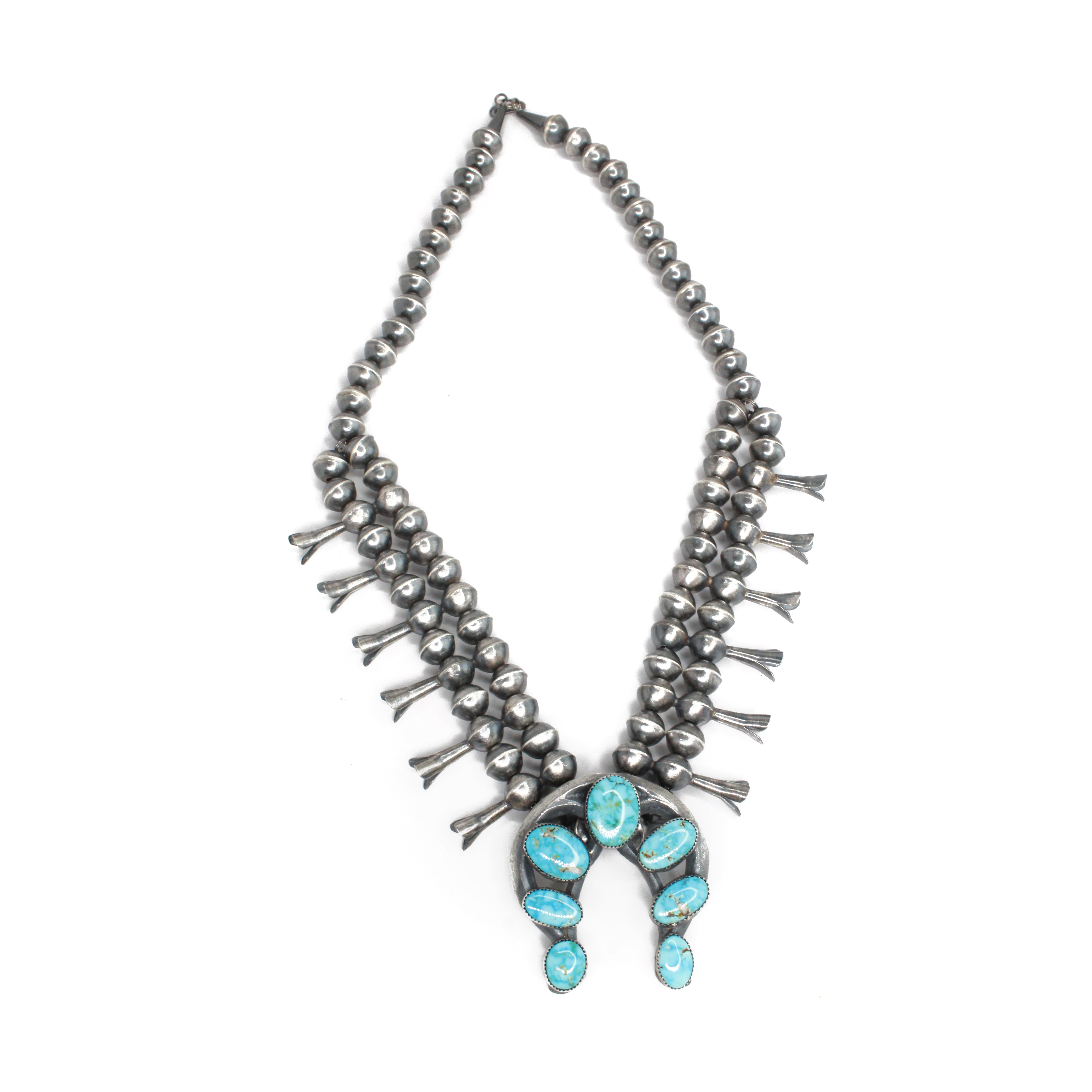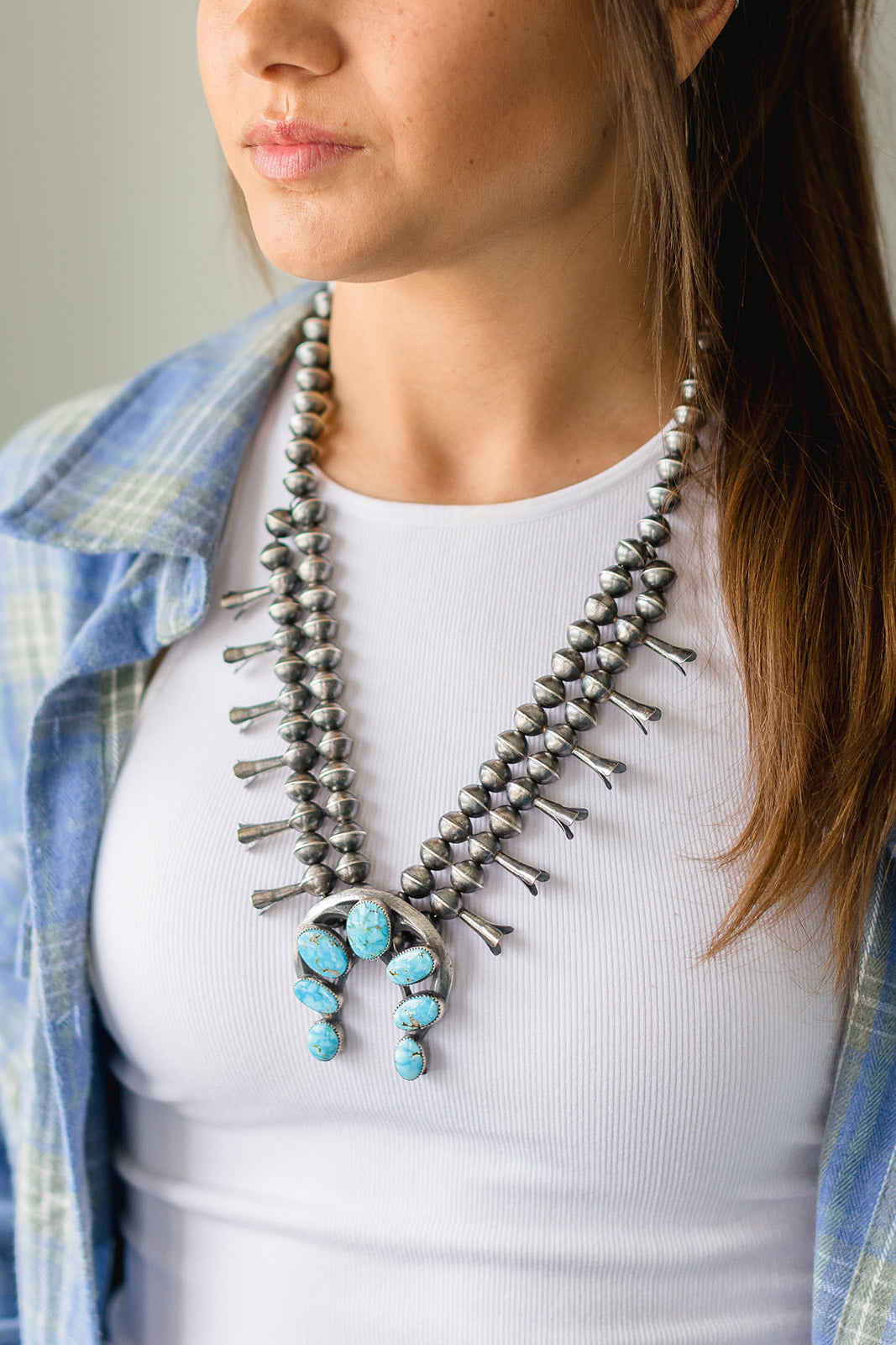 The 'end to end' length listed for Squash Blossom necklaces is measured from clasp to hook and does not include the 'drop' of the Naja. For a more accurate length reference, model photos are provided. Additionally, Naja measurements are also included to give a complete view of the necklace's dimensions.