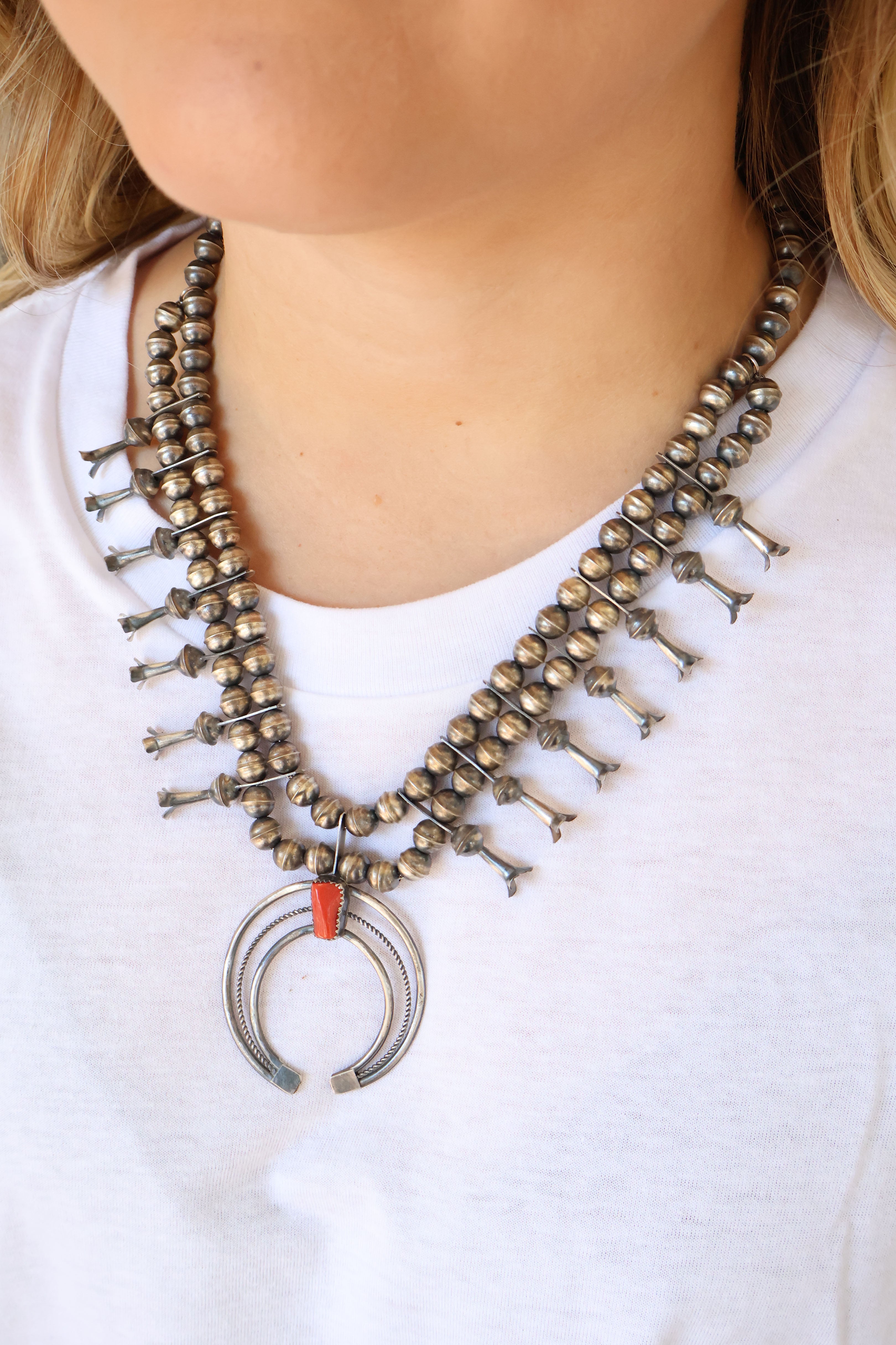 The 'end to end' length listed for Squash Blossom necklaces is measured from clasp to hook and does not include the 'drop' of the Naja. For a more accurate length reference, model photos are provided. Additionally, Naja measurements are also included to give a complete view of the necklace's dimensions.