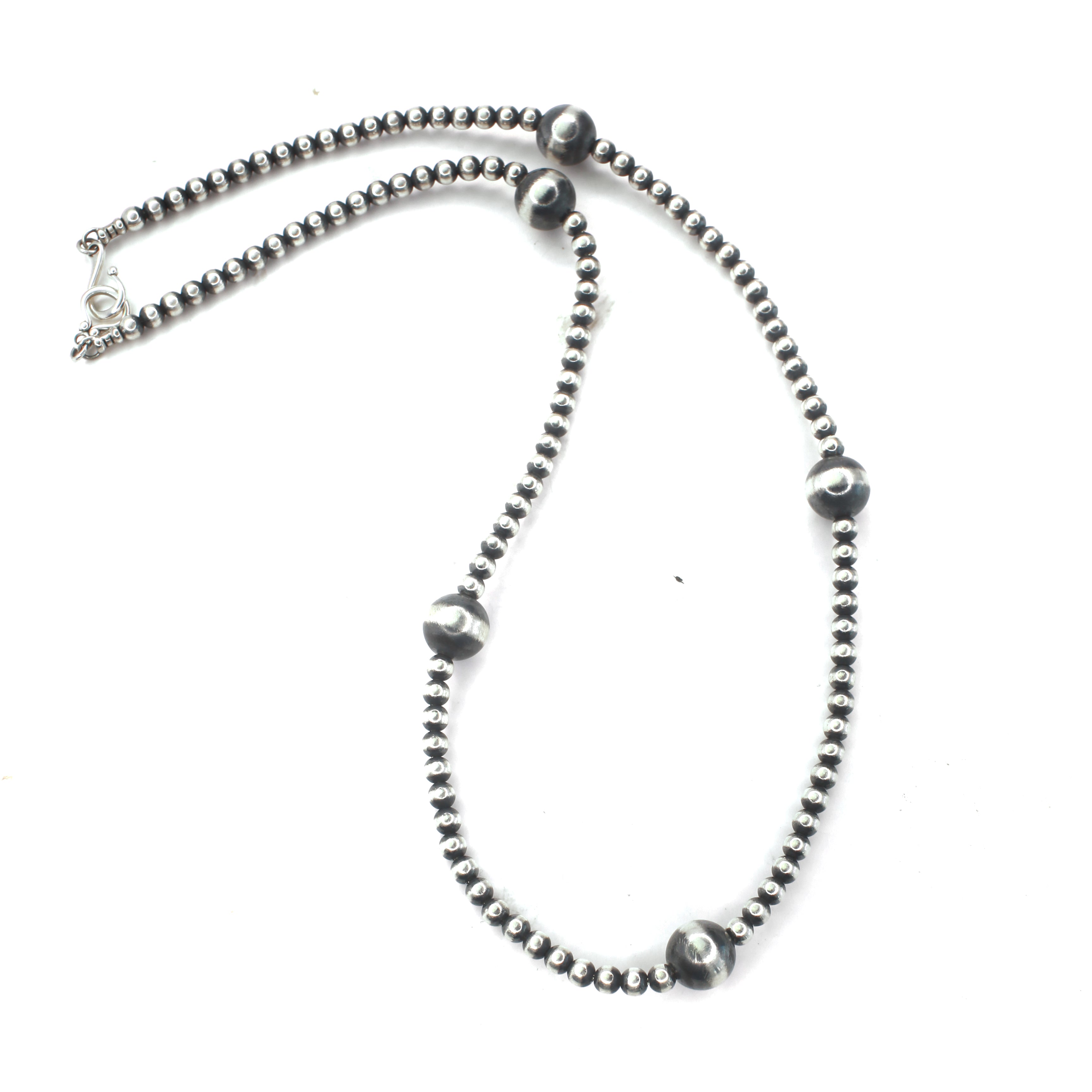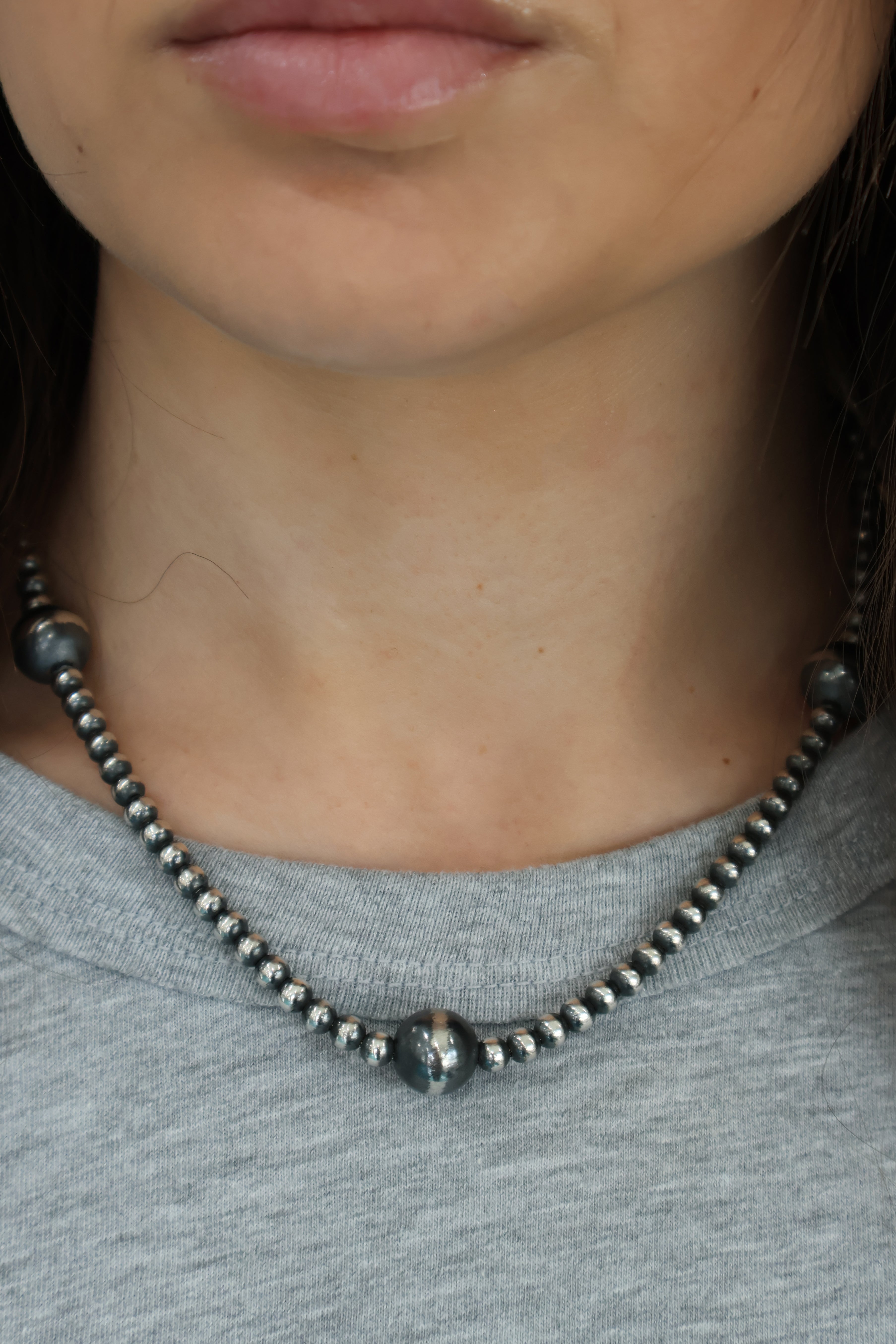 Navajo pearls by Marilyn Platero are a stunning blend of traditional style and contemporary craftsmanship. Known for her impeccable attention to detail, Marilyn strings her pearls on foxtail chain and finishes the ends with soldered clasps for added durability. Her use of machine-made beads provides a uniform and consistent appearance compared to handmade options. The use of machines also allows her to create pearls that range in size from 4mm. Unlike other machine-made beads, Marilyn's have a substantial weight and feel, adding to their quality and appearance. Her beads are oxidized and buffed by hand by Navajo artist Bronson Belone.