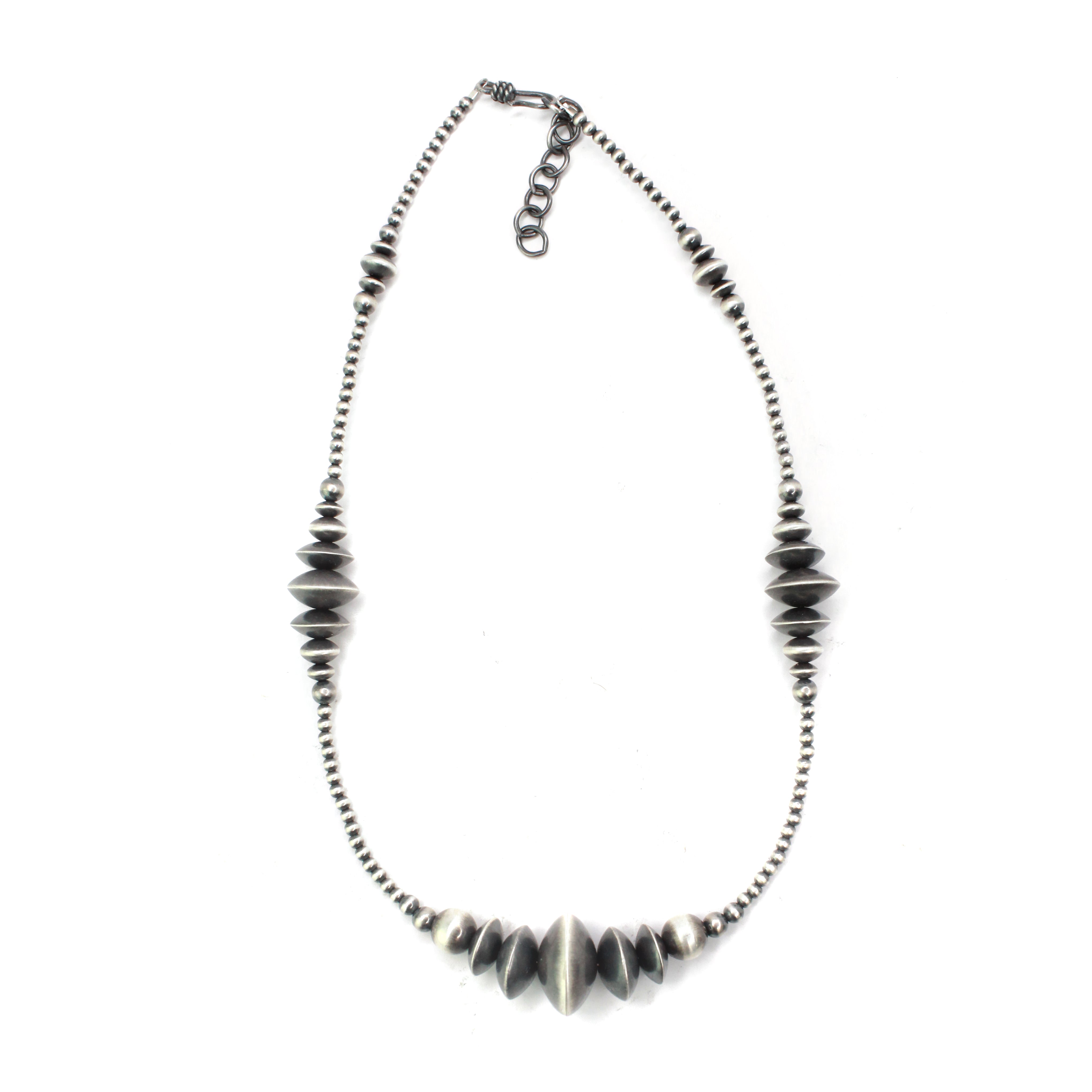 Creating hand-rolled silver beads is a celebrated tradition among Navajo silversmiths and an icon of Navajo jewelry. Handmade beads are meticulously crafted, with each bead being the result of an extremely labor-intensive process. These beads are shaped by hand using tools such as hammers, pliers, and files. The lengthy process includes melting, rolling, cutting, shaping, soldering & filing each sterling silver bead by BY HAND. This meticulous time honored method is a highly skilled trade that few artists have mastered.