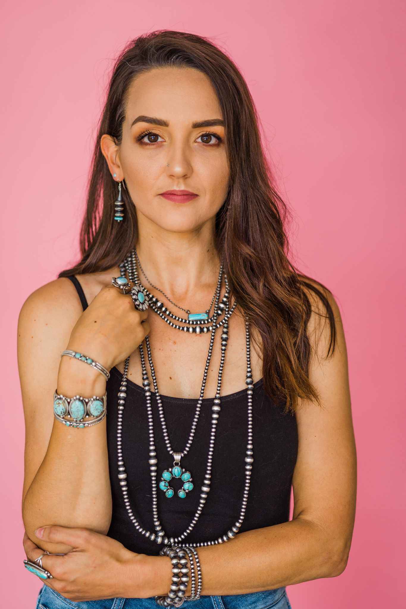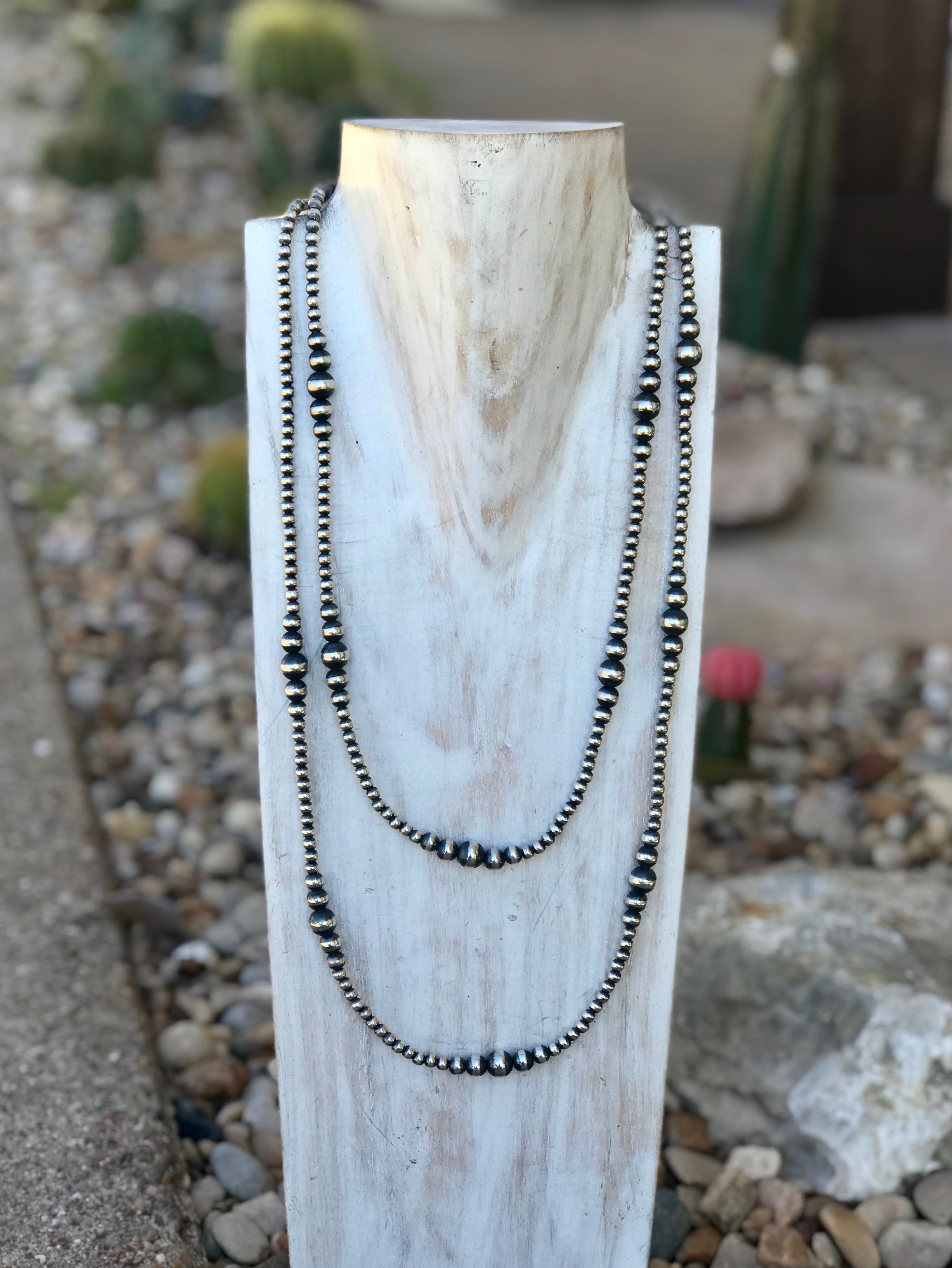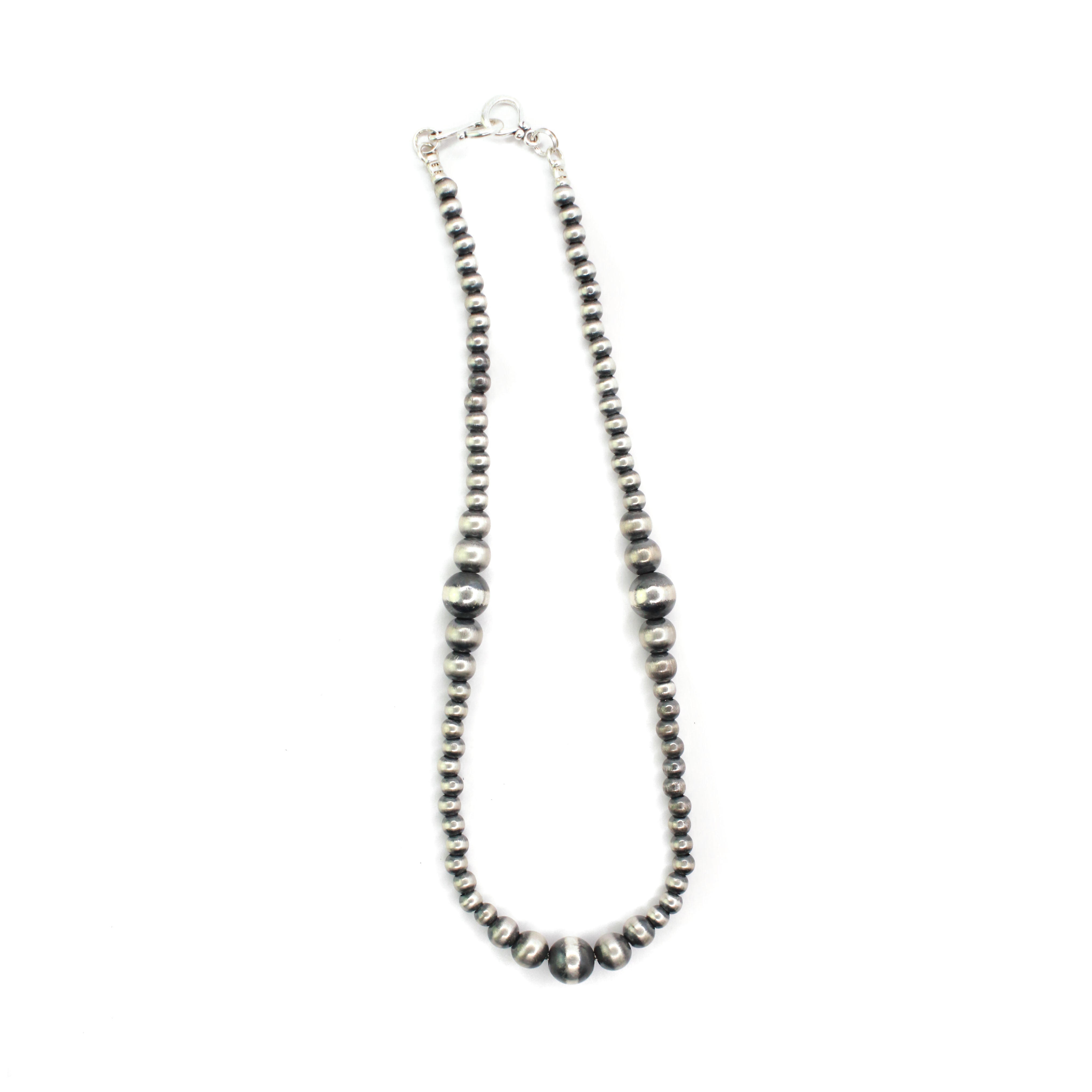 Navajo pearls by Marilyn Platero are a stunning blend of traditional style and contemporary craftsmanship. Known for her impeccable attention to detail, Marilyn strings her pearls on foxtail chain and finishes the ends with soldered clasps for added durability. Her use of machine-made beads provides a uniform and consistent appearance compared to handmade options. The use of machines also allows her to create pearls that range in size from 4mm. Unlike other machine-made beads, Marilyn's have a substantial weight and feel, adding to their quality and appearance. Her beads are oxidized and buffed by hand by Navajo artist Bronson Belone.