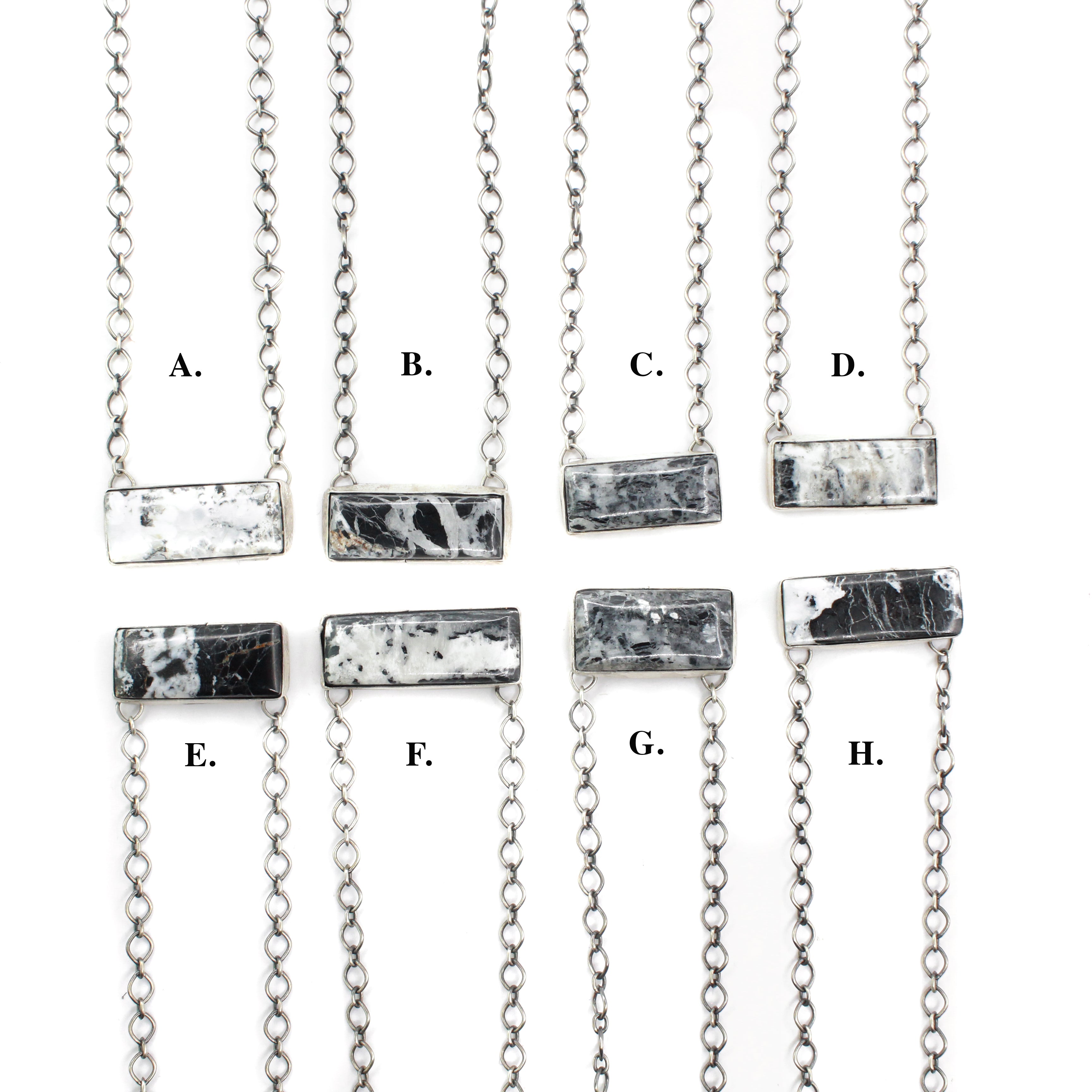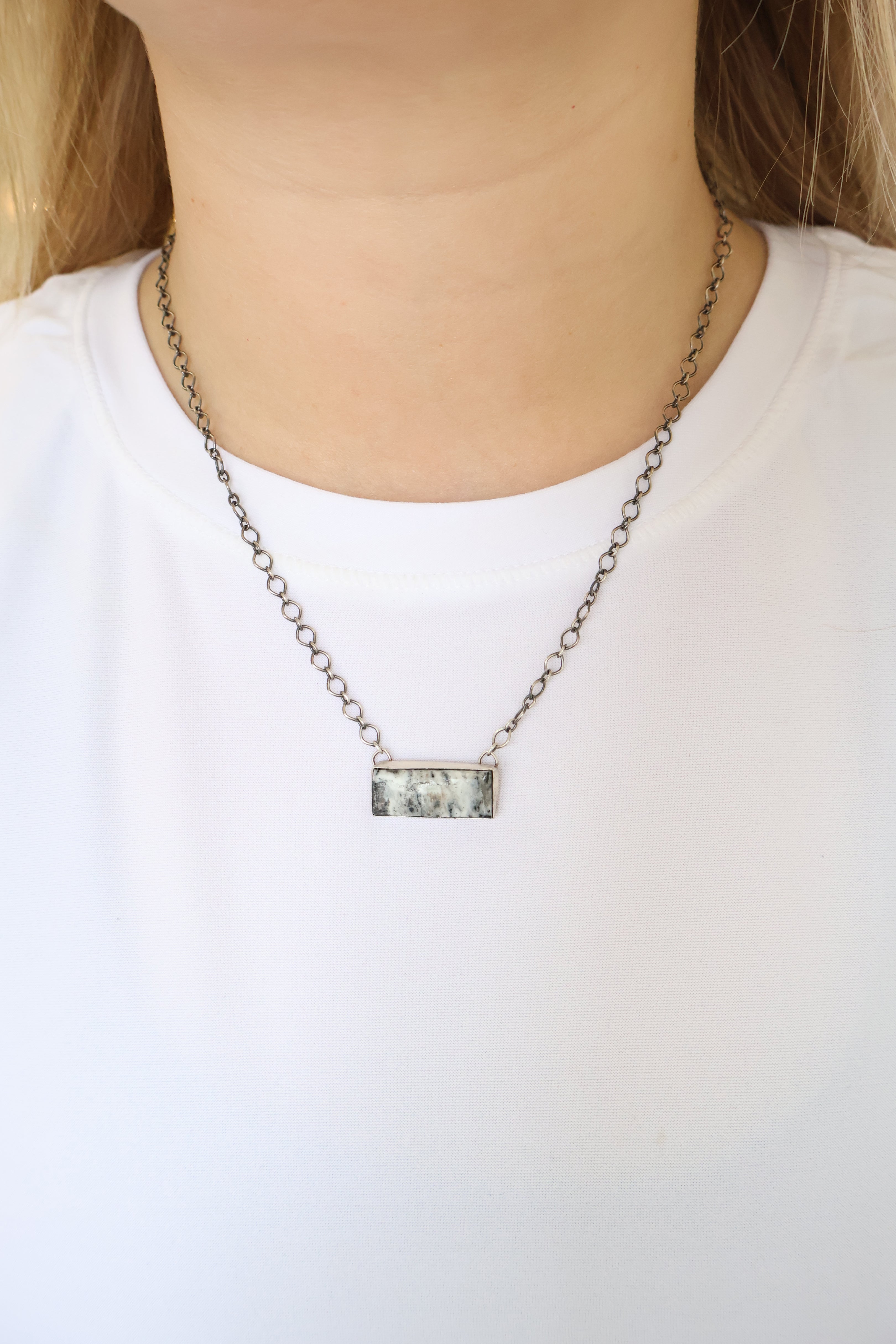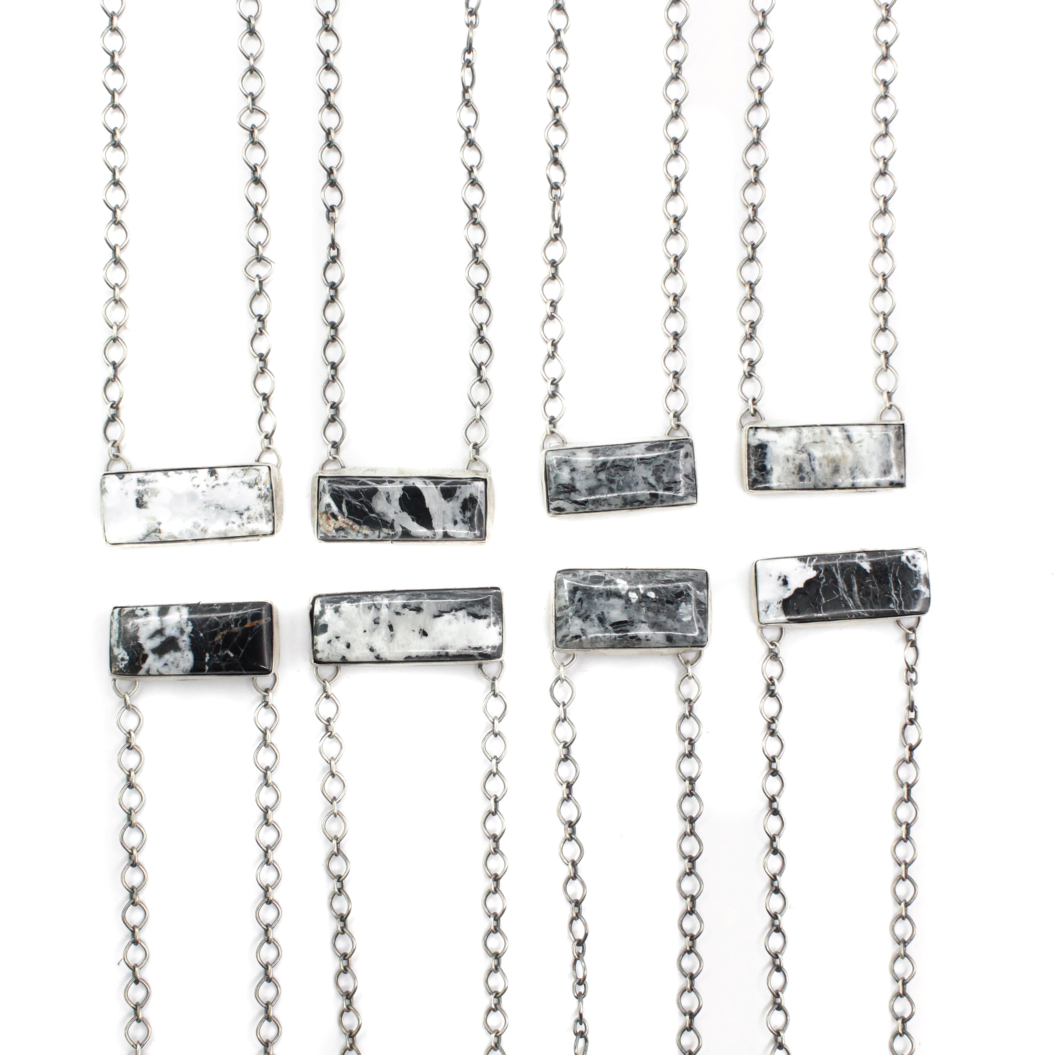 The length listed for bar necklaces is measured from clasp to hook, including the width of the bar. This total length does not directly reflect how the necklace will sit when worn. To more accurately determine where the necklace will sit, subtract the 'bar width' measurement from the 'length end to end" measurement.