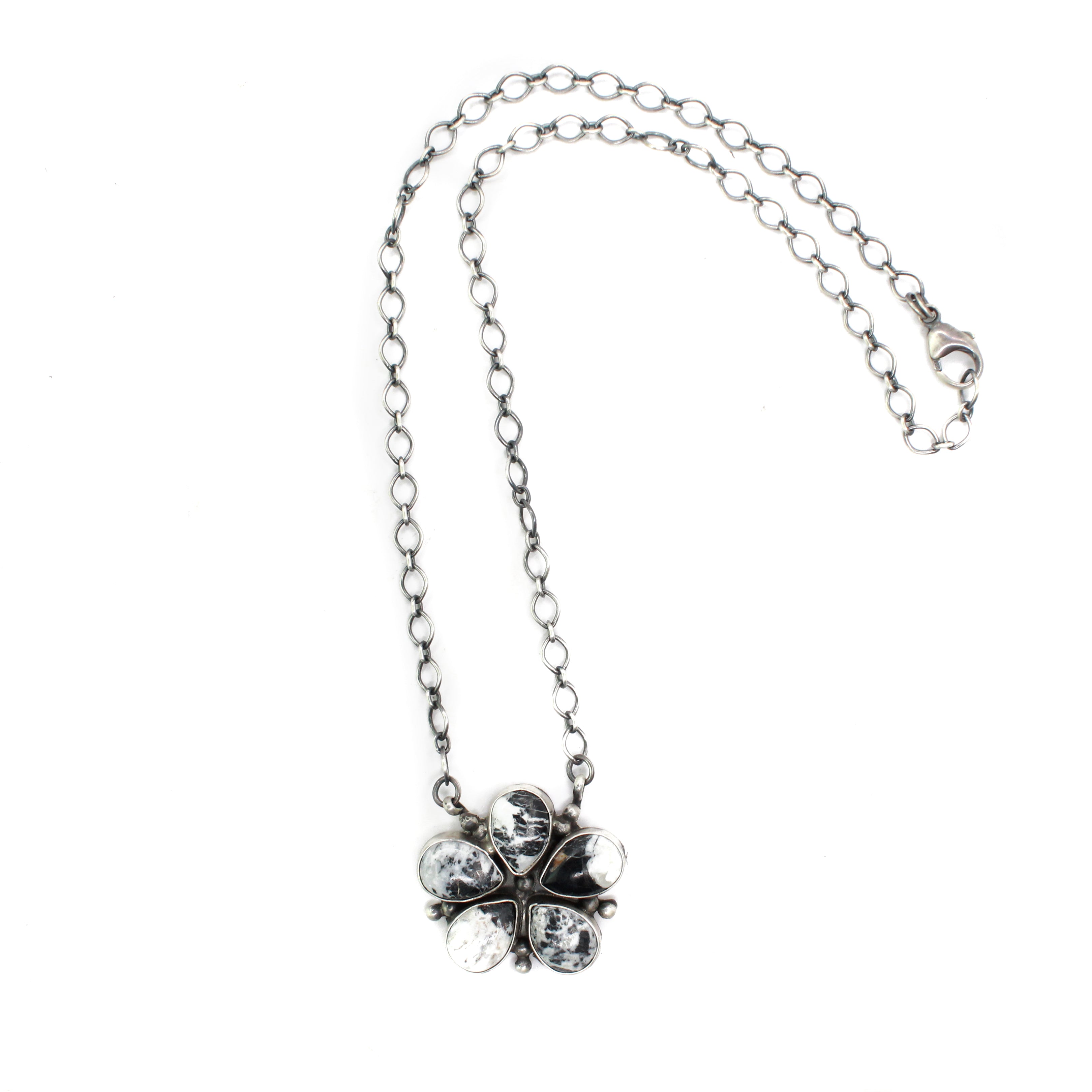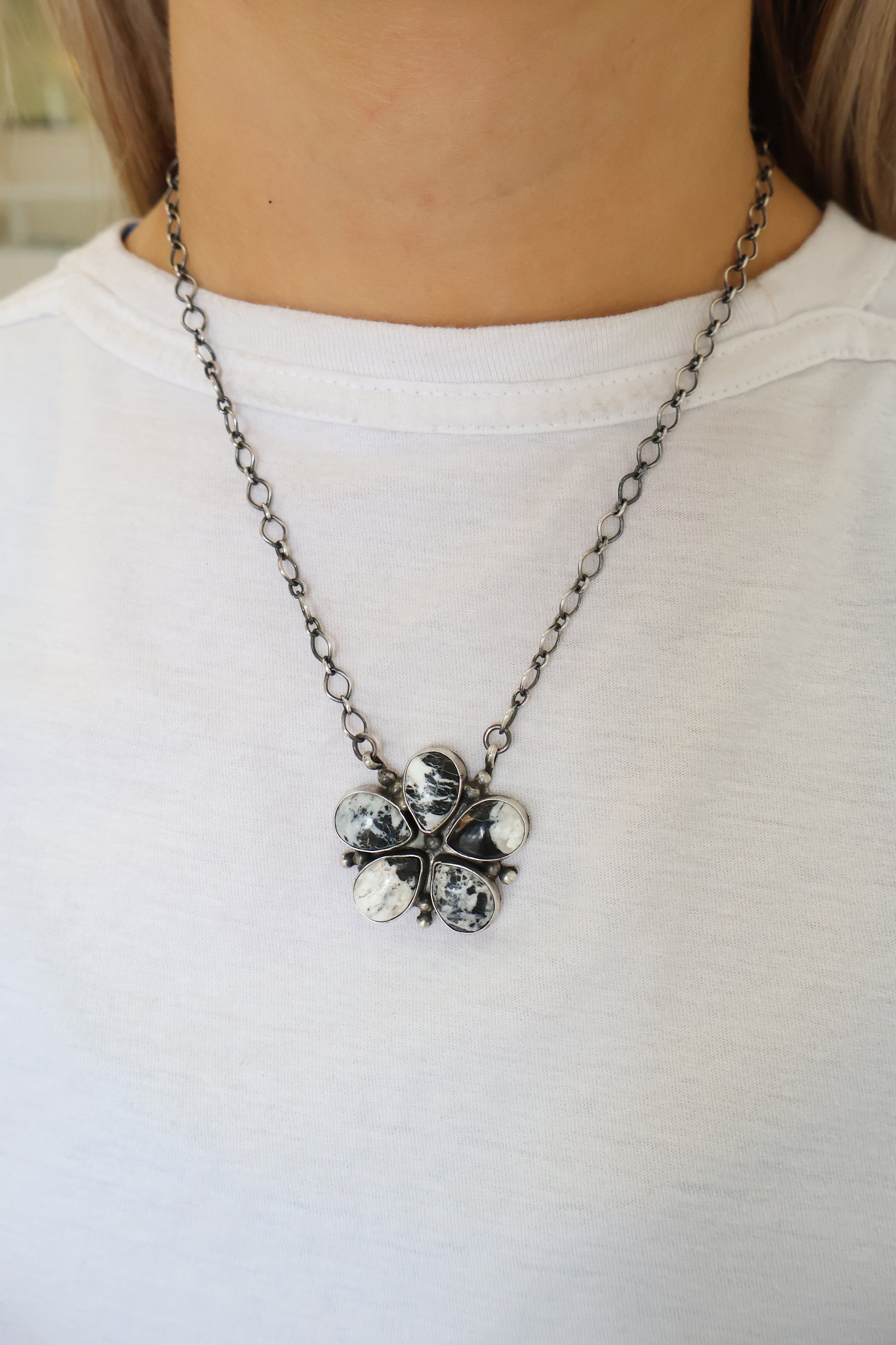 White Buffalo is in fact NOT turquoise. Although White Buffalo is often sold as turquoise, it's classification is actually magnesite and alumite. Its unique coloring comes from the presence of Calcite mineral. The only mine known to be home to White Buffalo is The Dry Creek Mine in Tonopah, NV. It was first discovered by the Otteson family in 1993. The name derives from the Native American belief that white buffaloes are pure and rare like the white buffalo stone. The white stone is surrounded by black and brown flint-like chert which creates beautiful patterns, and sometimes in rare pieces, a spider-web matrix. The stone appears in veins, is as hard as turquoise (Mohs hardness scale of 5.5 to 7.5) and cuts and polishes like turquoise.