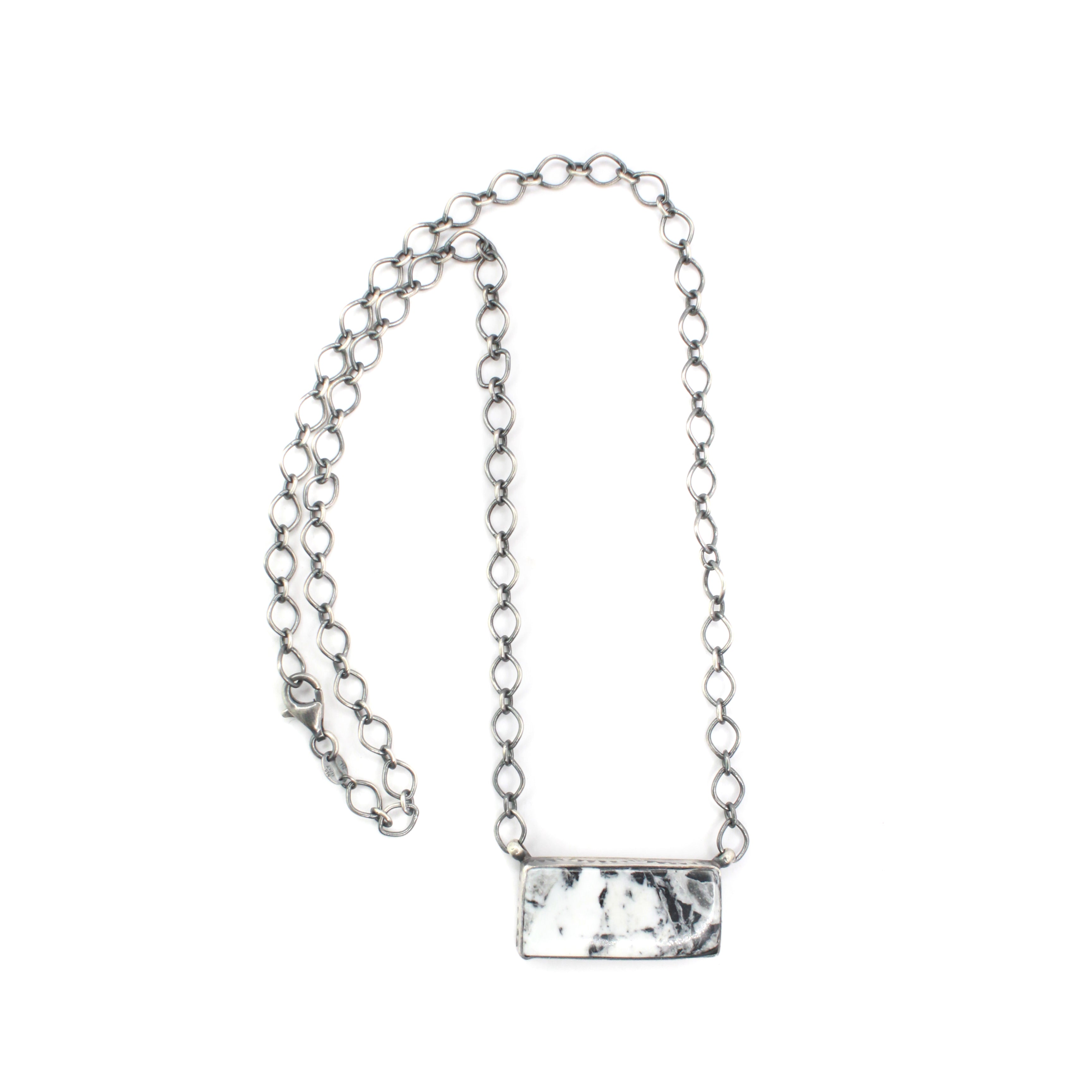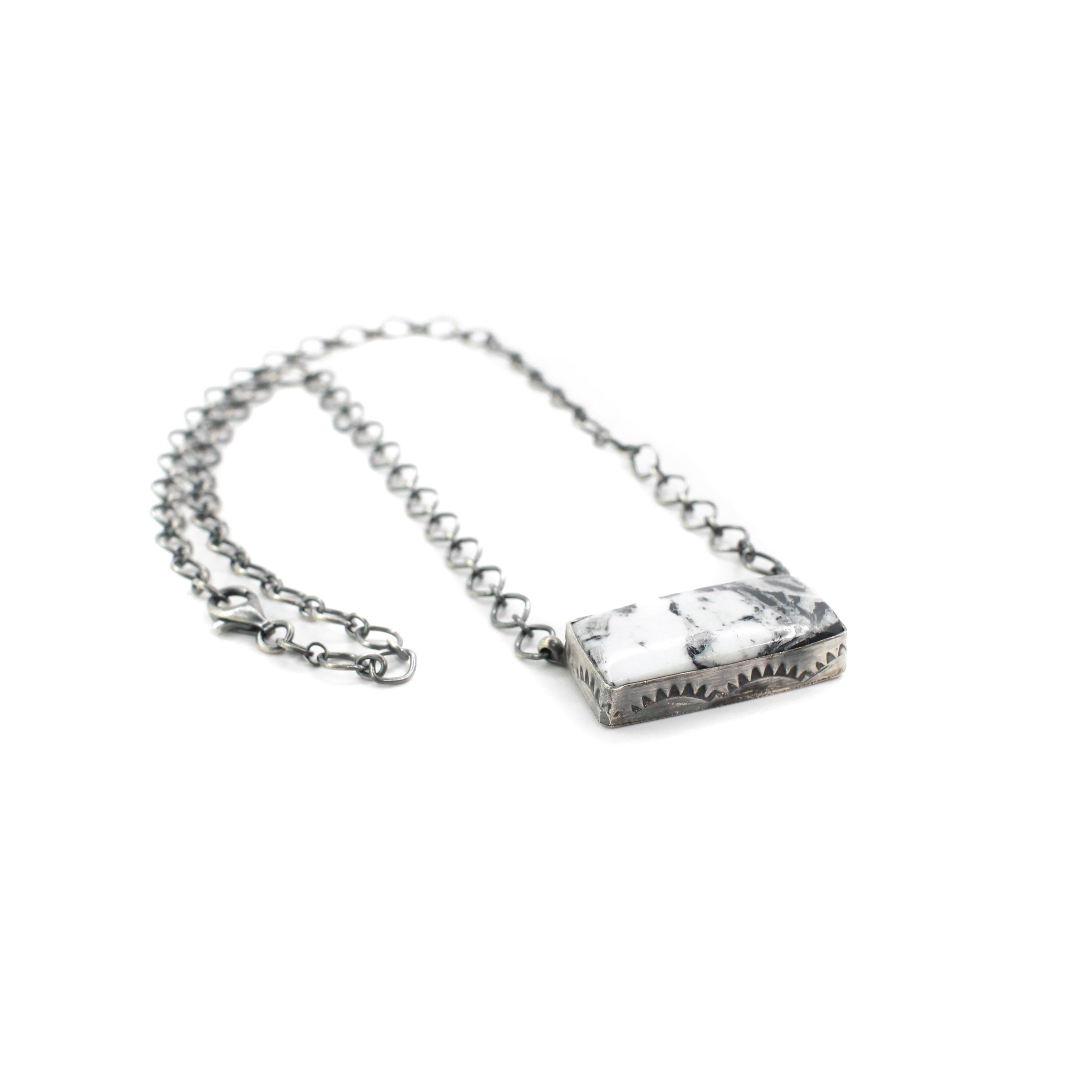 White Buffalo is in fact NOT turquoise. Although White Buffalo is often sold as turquoise, it's classification is actually magnesite and alumite. Its unique coloring comes from the presence of Calcite mineral. The only mine known to be home to White Buffalo is The Dry Creek Mine in Tonopah, NV. It was first discovered by the Otteson family in 1993. The name derives from the Native American belief that white buffaloes are pure and rare like the white buffalo stone. The white stone is surrounded by black and brown flint-like chert which creates beautiful patterns, and sometimes in rare pieces, a spider-web matrix. The stone appears in veins, is as hard as turquoise (Mohs hardness scale of 5.5 to 7.5) and cuts and polishes like turquoise.