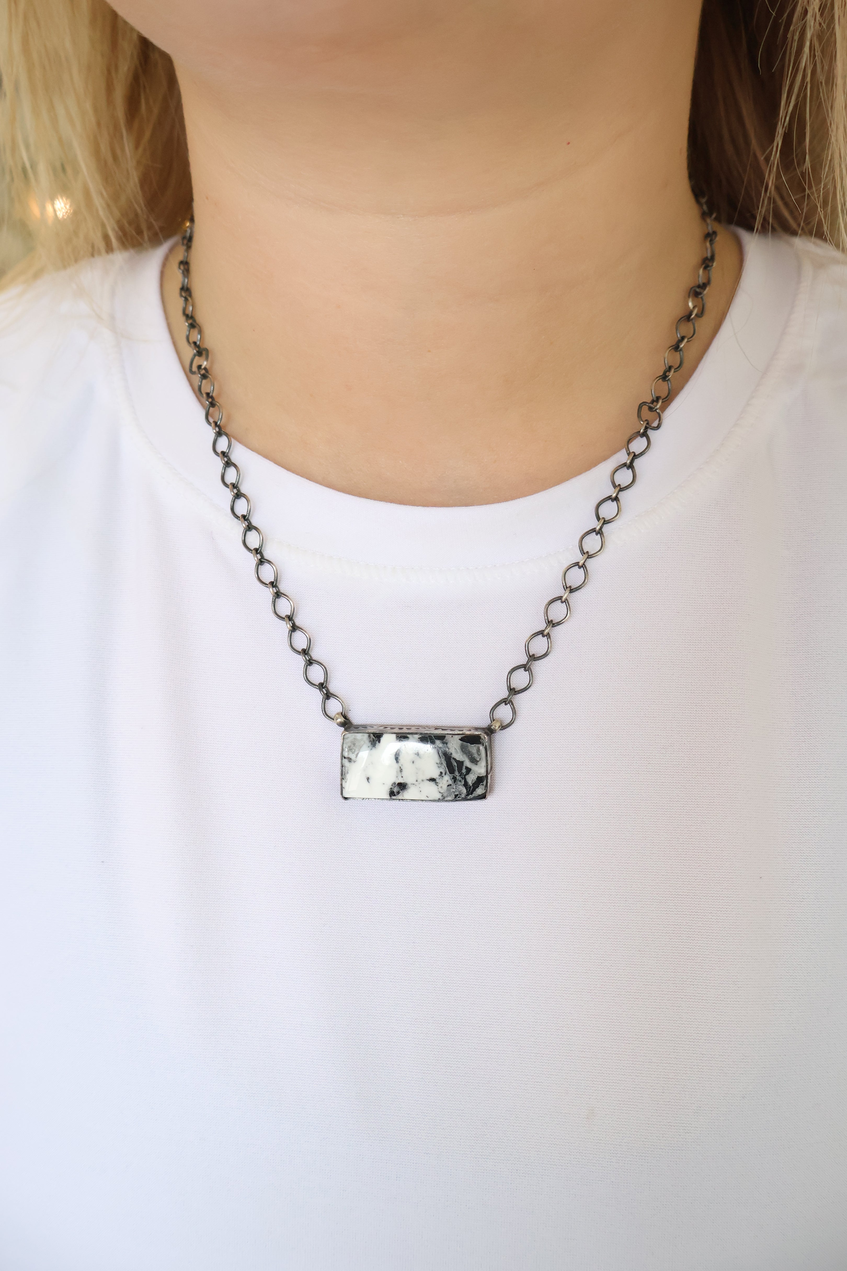 The length listed for bar necklaces is measured from clasp to hook, including the width of the bar. This total length does not directly reflect how the necklace will sit when worn. To more accurately determine where the necklace will sit, subtract the 'bar width' measurement from the 'length end to end" measurement.
