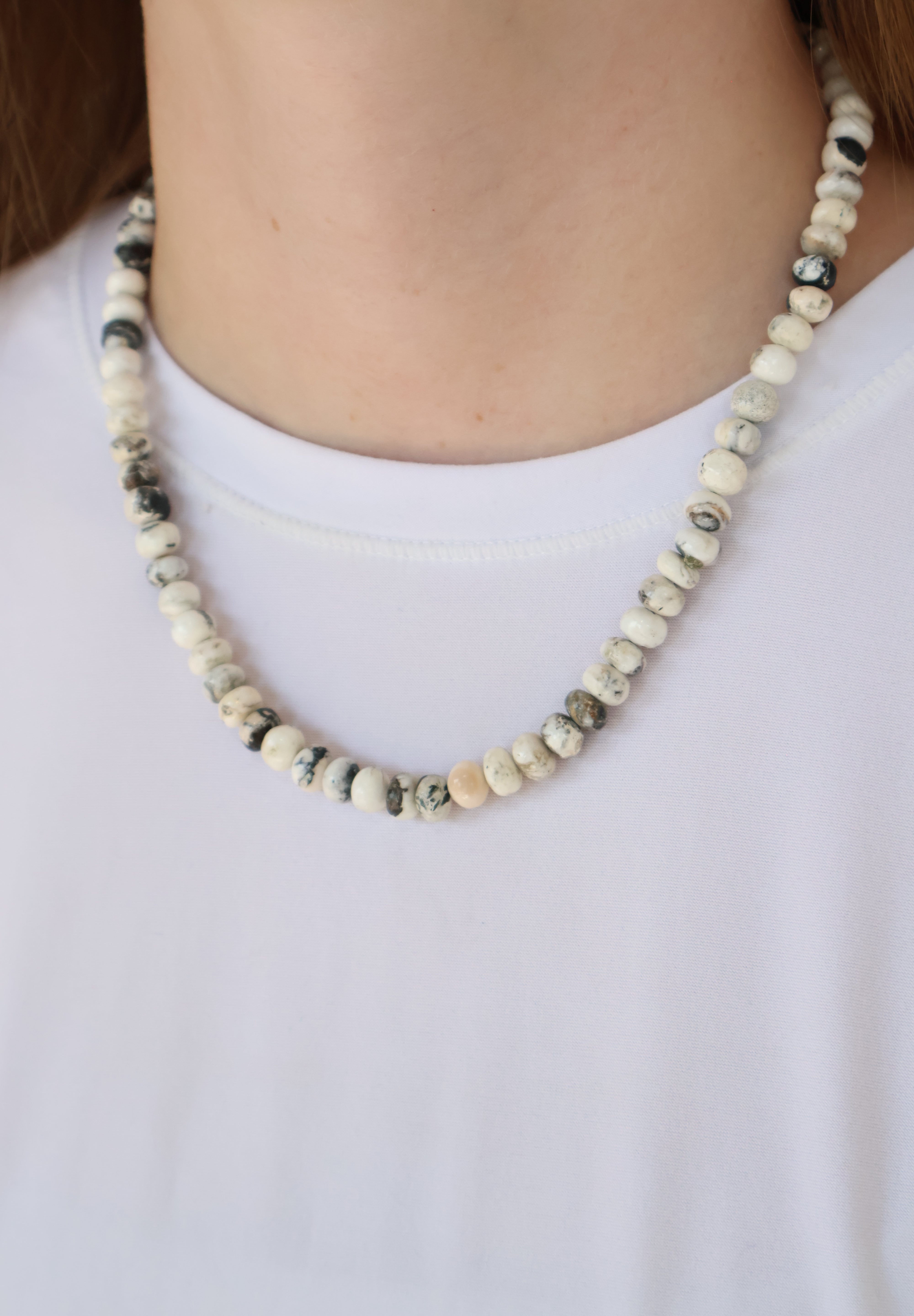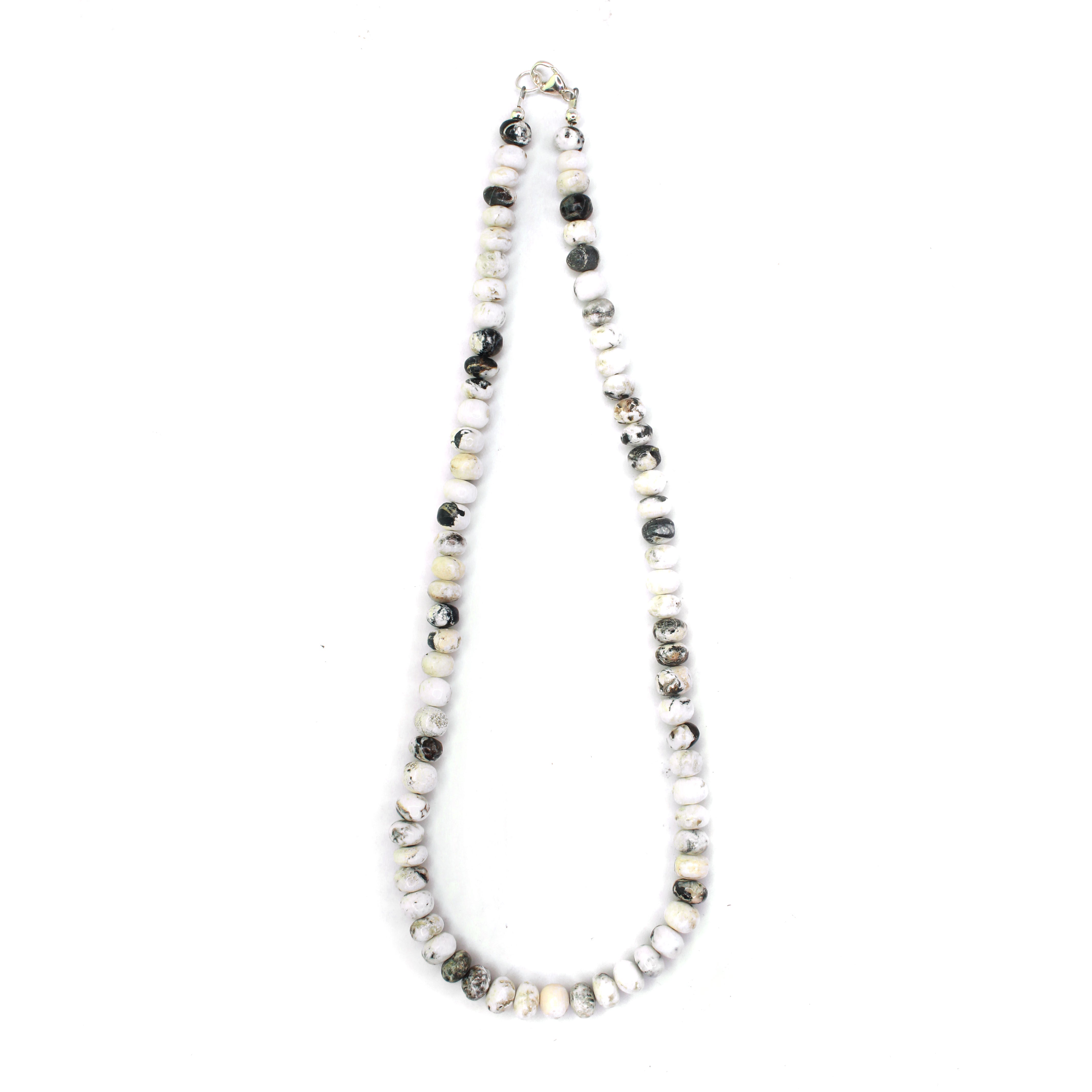 White Buffalo is in fact NOT turquoise. Although White Buffalo is often sold as turquoise, it's classification is actually magnesite and alumite. Its unique coloring comes from the presence of Calcite mineral. The only mine known to be home to White Buffalo is The Dry Creek Mine in Tonopah, NV. It was first discovered by the Otteson family in 1993. The name derives from the Native American belief that white buffaloes are pure and rare like the white buffalo stone. The white stone is surrounded by black and brown flint-like chert which creates beautiful patterns, and sometimes in rare pieces, a spider-web matrix. The stone appears in veins, is as hard as turquoise (Mohs hardness scale of 5.5 to 7.5) and cuts and polishes like turquoise.