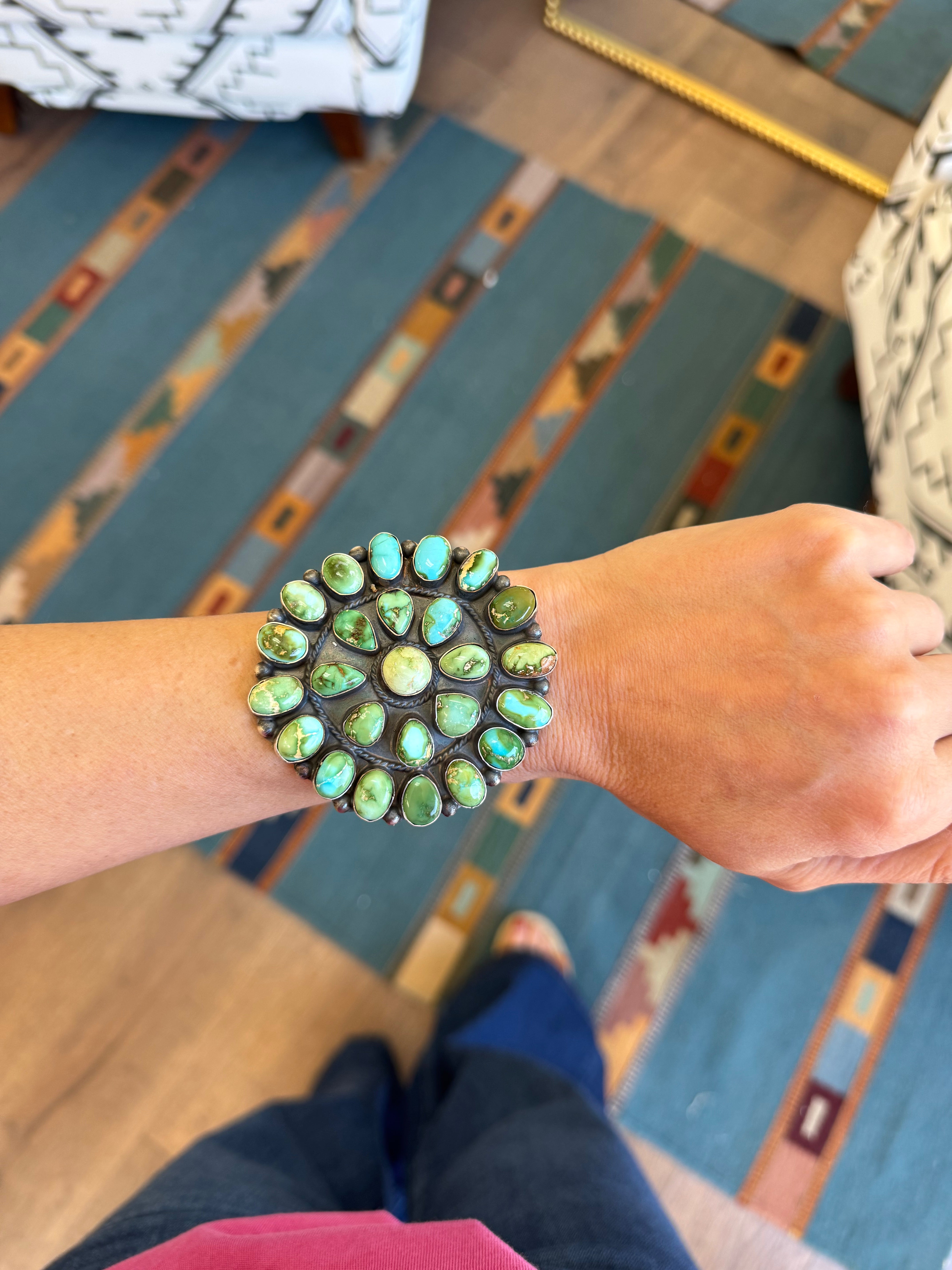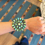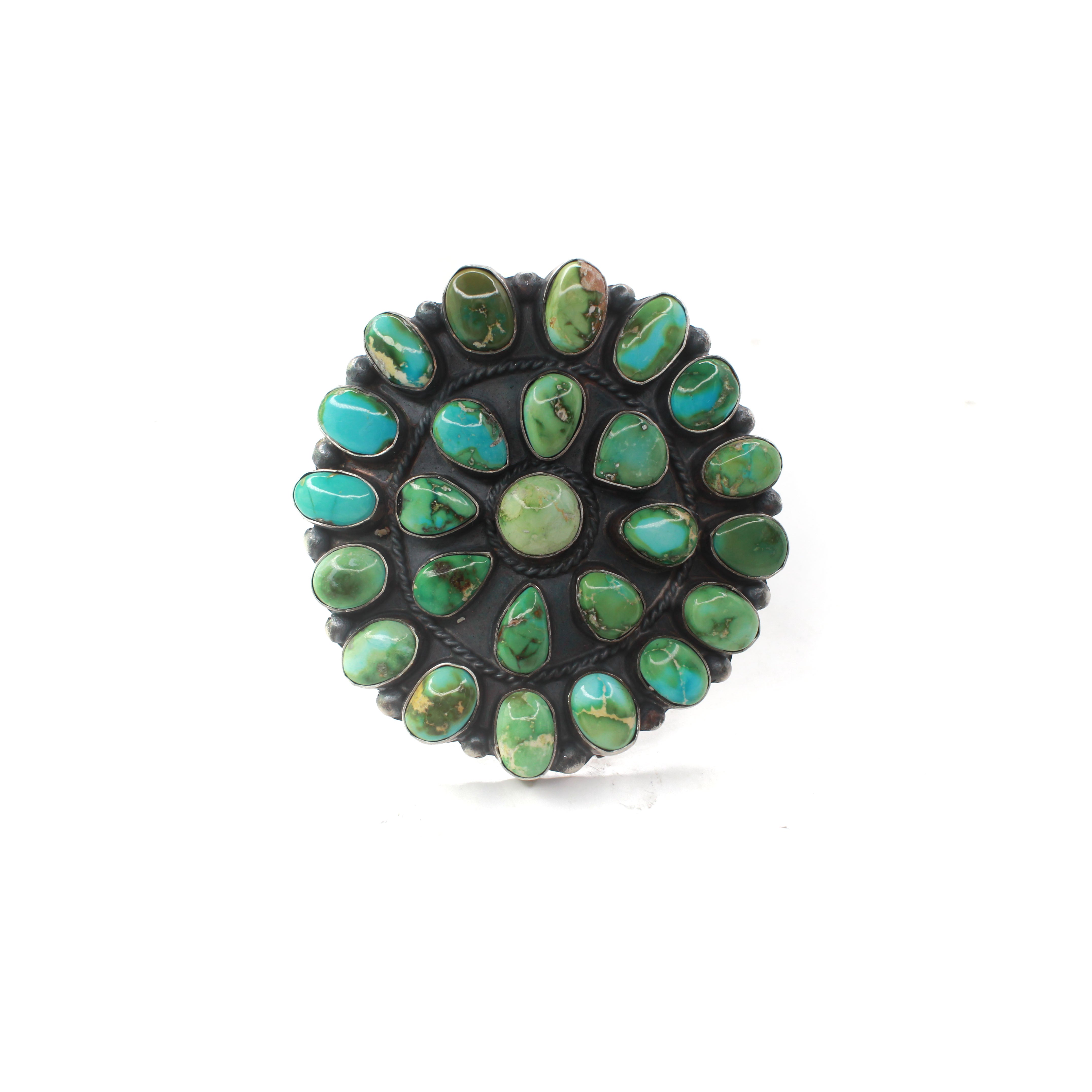Sonoran turquoise, mined from the Campitos Mountain near Cananea, Sonora, Mexico. This region produces several distinctive types, including Sonoran Gold, known for its vibrant colors like aqua blue, lime, and two-tone blue and green with a golden-brown matrix; Sonoran Rose, a natural bright blue turquoise; and Sonoran Blue, valued for its hardness, shiny pyrite flakes, and black oxide veins.