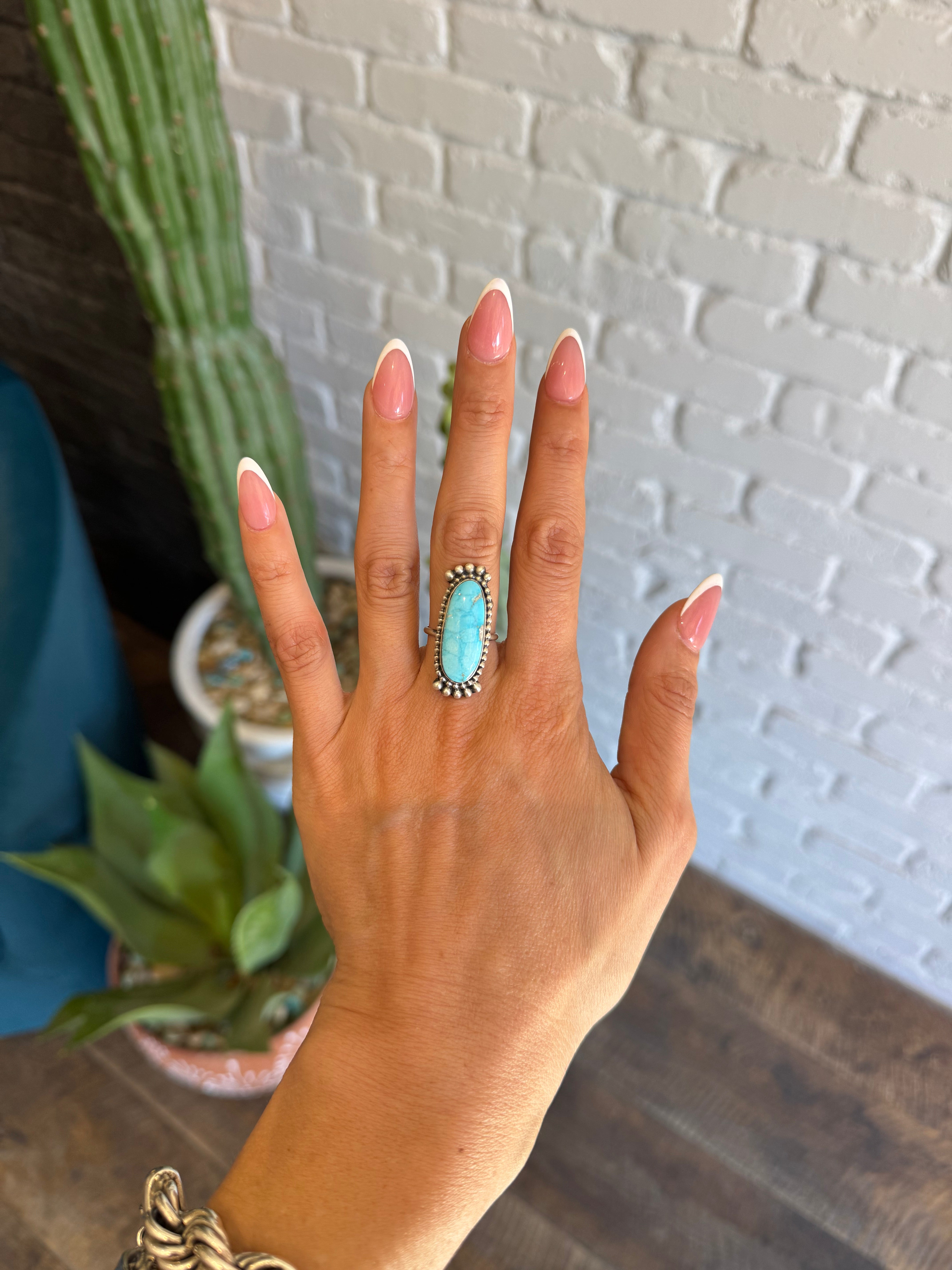 Sonoran turquoise, mined from the Campitos Mountain near Cananea, Sonora, Mexico. This region produces several distinctive types, including Sonoran Gold, known for its vibrant colors like aqua blue, lime, and two-tone blue and green with a golden-brown matrix; Sonoran Rose, a natural bright blue turquoise; and Sonoran Blue, valued for its hardness, shiny pyrite flakes, and black oxide veins.