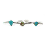 Sonoran turquoise, mined from the Campitos Mountain near Cananea, Sonora, Mexico. This region produces several distinctive types, including Sonoran Gold, known for its vibrant colors like aqua blue, lime, and two-tone blue and green with a golden-brown matrix; Sonoran Rose, a natural bright blue turquoise; and Sonoran Blue, valued for its hardness, shiny pyrite flakes, and black oxide veins.