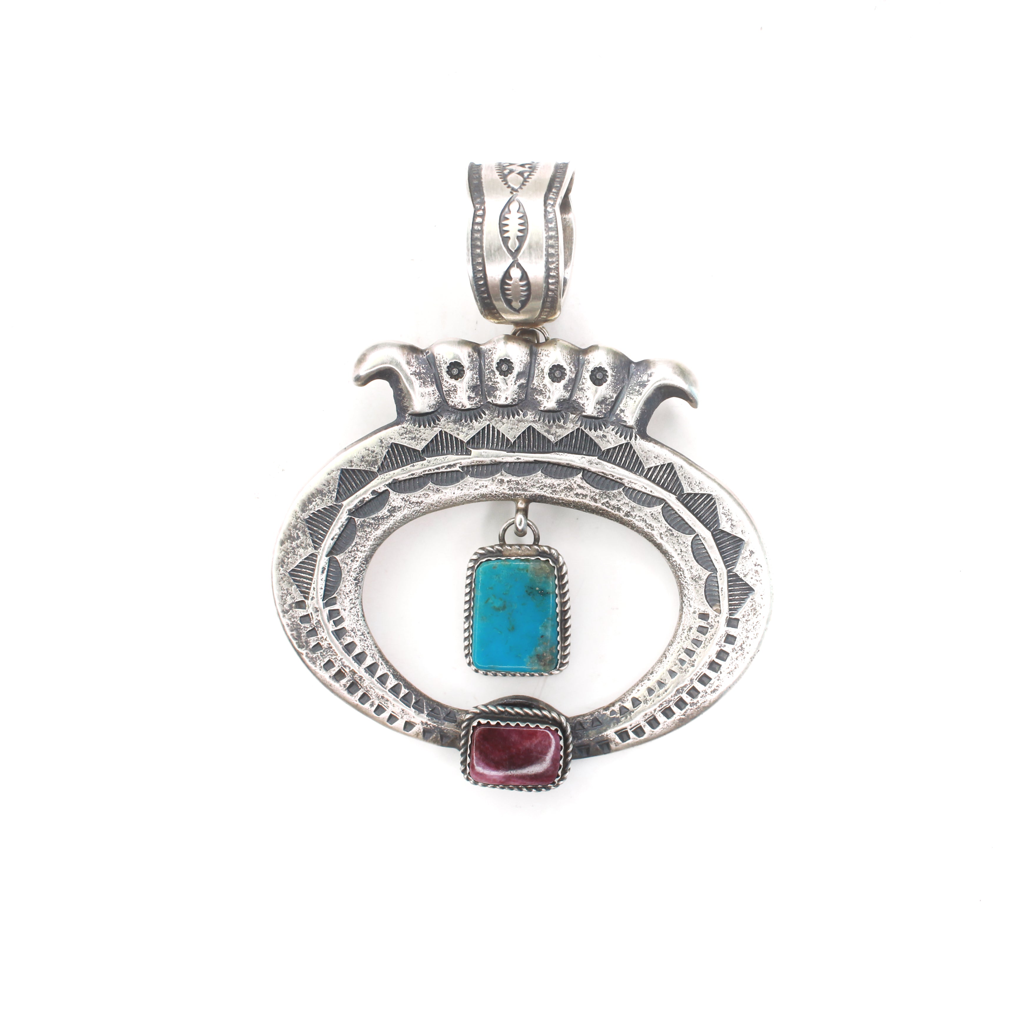 Michael Calladitto is renowned for his traditional Navajo-style jewelry, characterized by the use of sterling silver and turquoise, featuring intricately stamped designs. He has a deep appreciation for turquoise, believing that the stone enhances his creativity and skill at the bench. Most of the decorative stamps he employs in his jewelry are handcrafted from tempered steel sourced from old car engines. Michael repurposes components like piston rods and valve stems, meticulously cutting designs into the steel with tiny files and other tools to create his unique stamps.