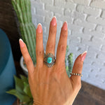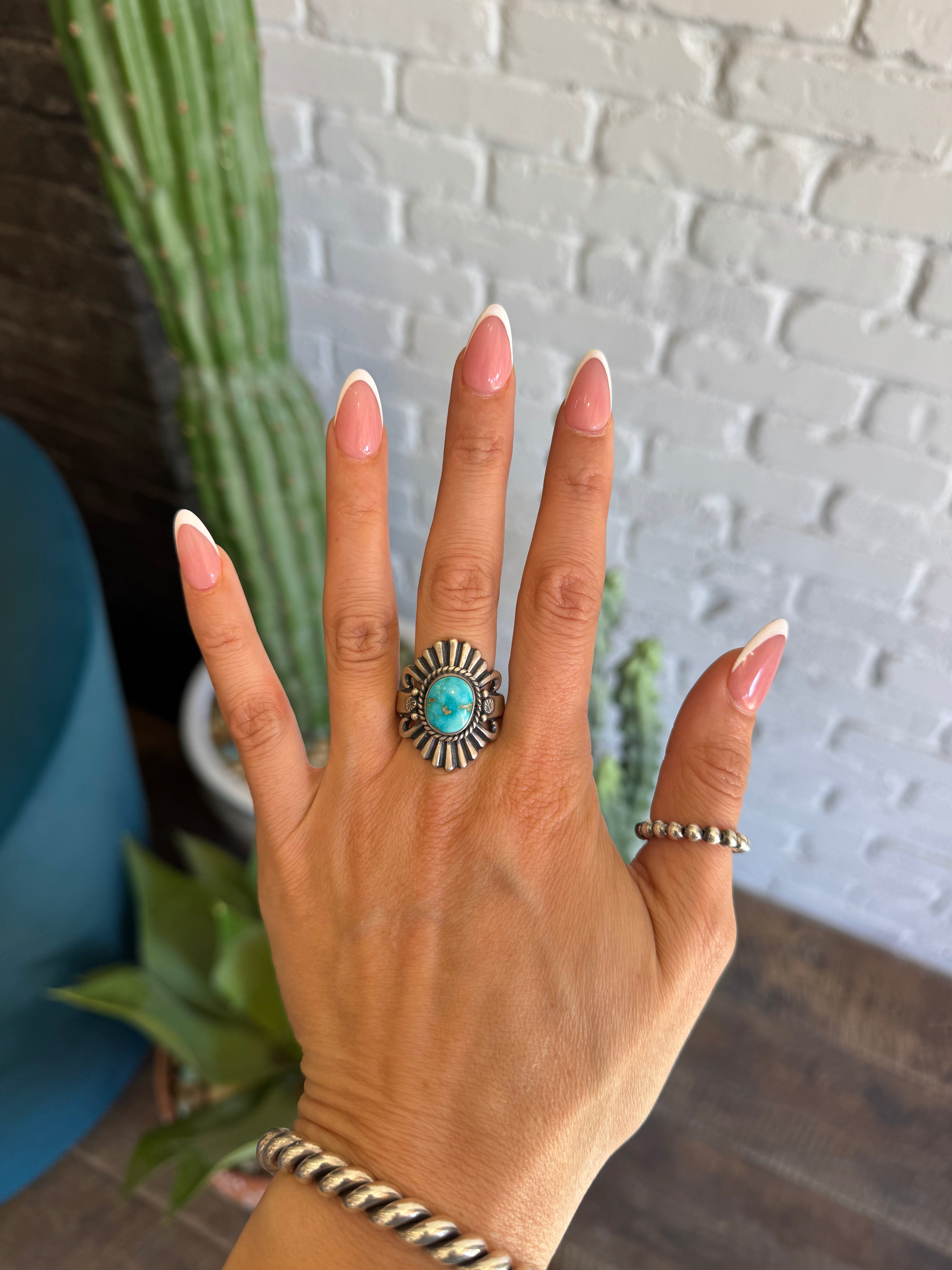 Sonoran turquoise, mined from the Campitos Mountain near Cananea, Sonora, Mexico. This region produces several distinctive types, including Sonoran Gold, known for its vibrant colors like aqua blue, lime, and two-tone blue and green with a golden-brown matrix; Sonoran Rose, a natural bright blue turquoise; and Sonoran Blue, valued for its hardness, shiny pyrite flakes, and black oxide veins.