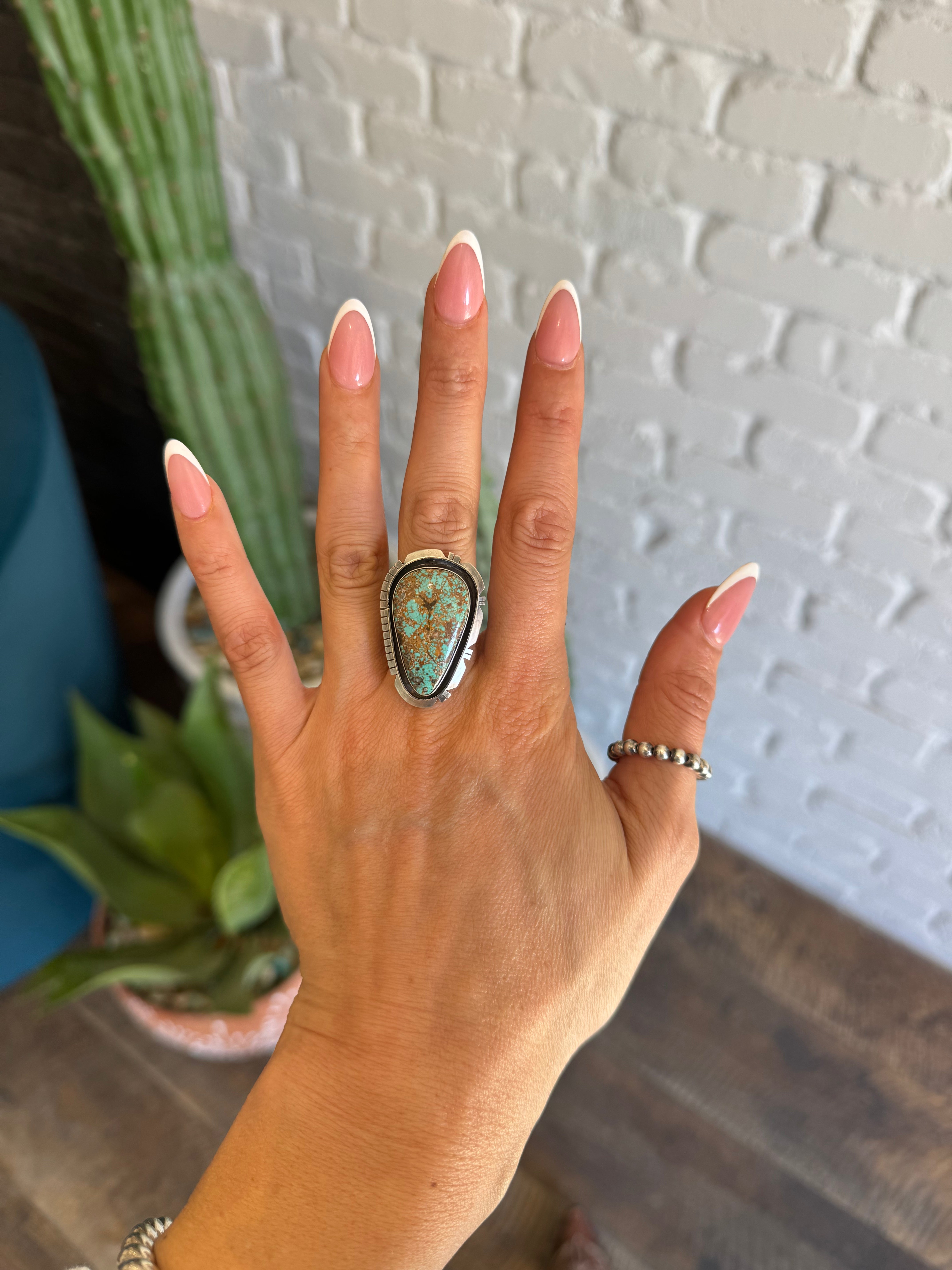 Eli Skeets is renowned as a master silversmith, distinguished by his hallmark oxidized silver borders that beautifully frame stunning turquoise stones. His craftsmanship results in remarkable pieces that are true works of art. One standout creation is a statement ring that not only captivates the eye but is also destined to be a cherished treasure for generations to come.