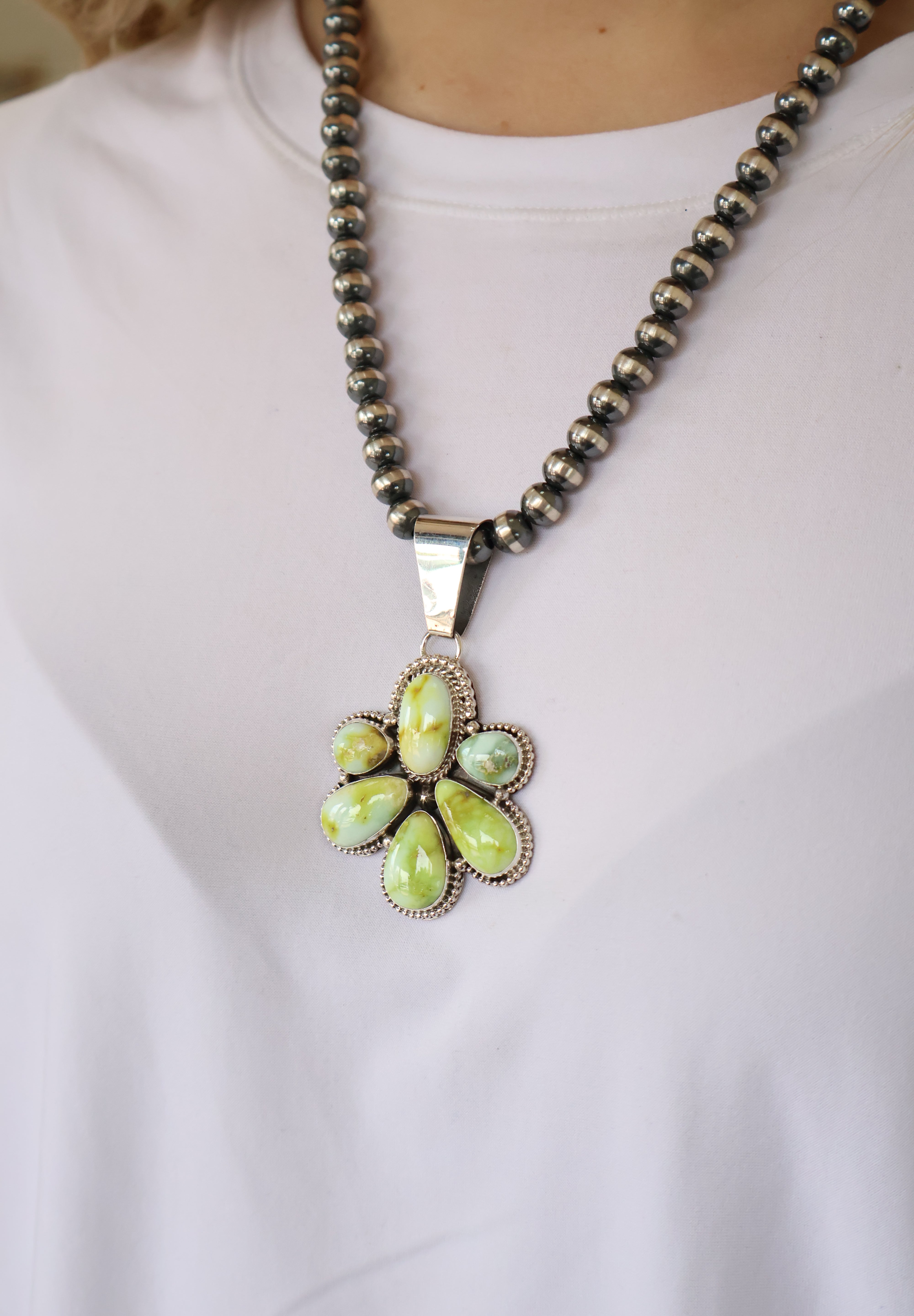 Pictured on 8mm, 20" Navajo Pearls Not Included