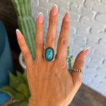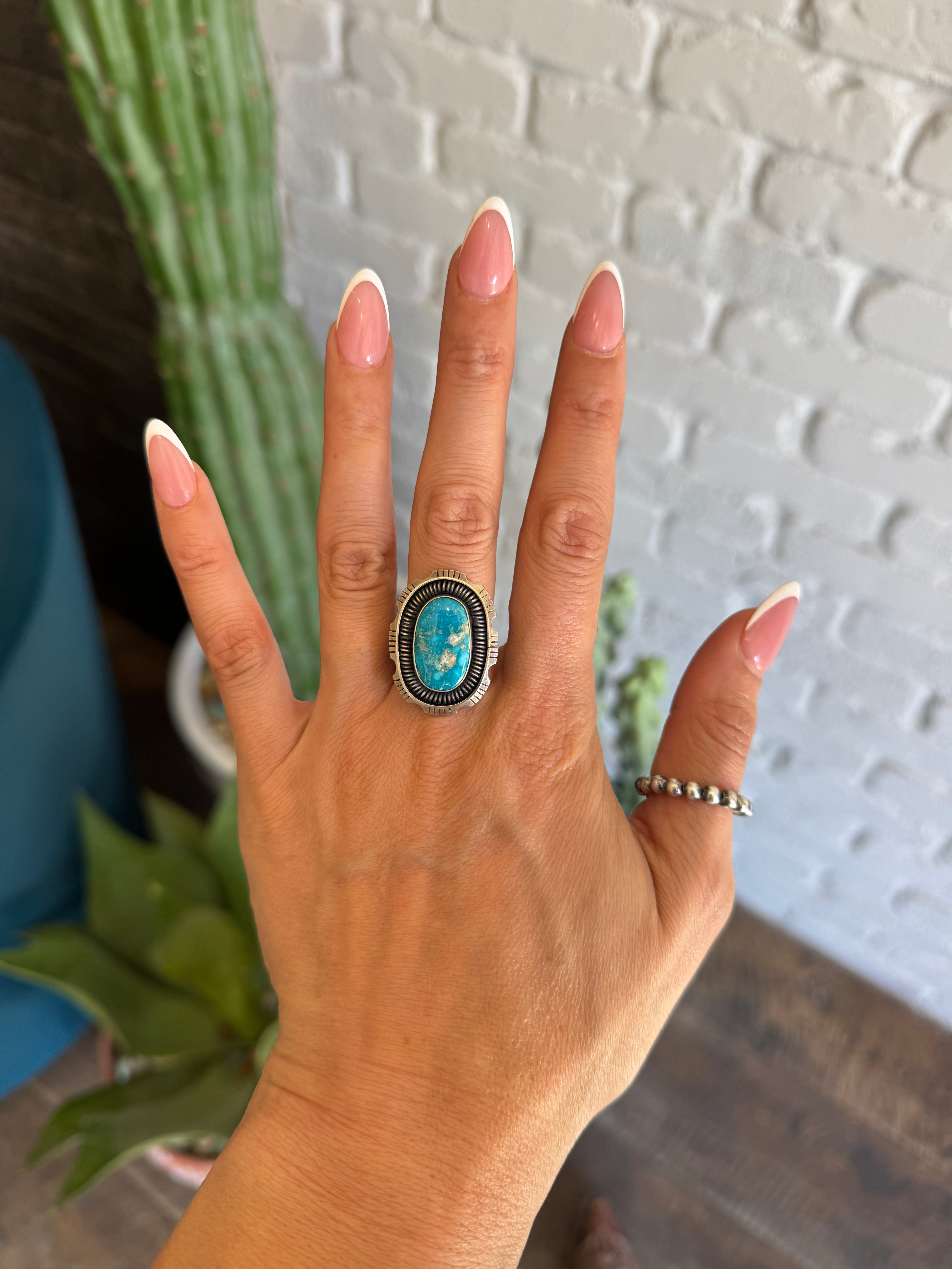 Eli Skeets is renowned as a master silversmith, distinguished by his hallmark oxidized silver borders that beautifully frame stunning turquoise stones. His craftsmanship results in remarkable pieces that are true works of art. One standout creation is a statement ring that not only captivates the eye but is also destined to be a cherished treasure for generations to come.