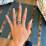 Sonoran turquoise, mined from the Campitos Mountain near Cananea, Sonora, Mexico. This region produces several distinctive types, including Sonoran Gold, known for its vibrant colors like aqua blue, lime, and two-tone blue and green with a golden-brown matrix; Sonoran Rose, a natural bright blue turquoise; and Sonoran Blue, valued for its hardness, shiny pyrite flakes, and black oxide veins.