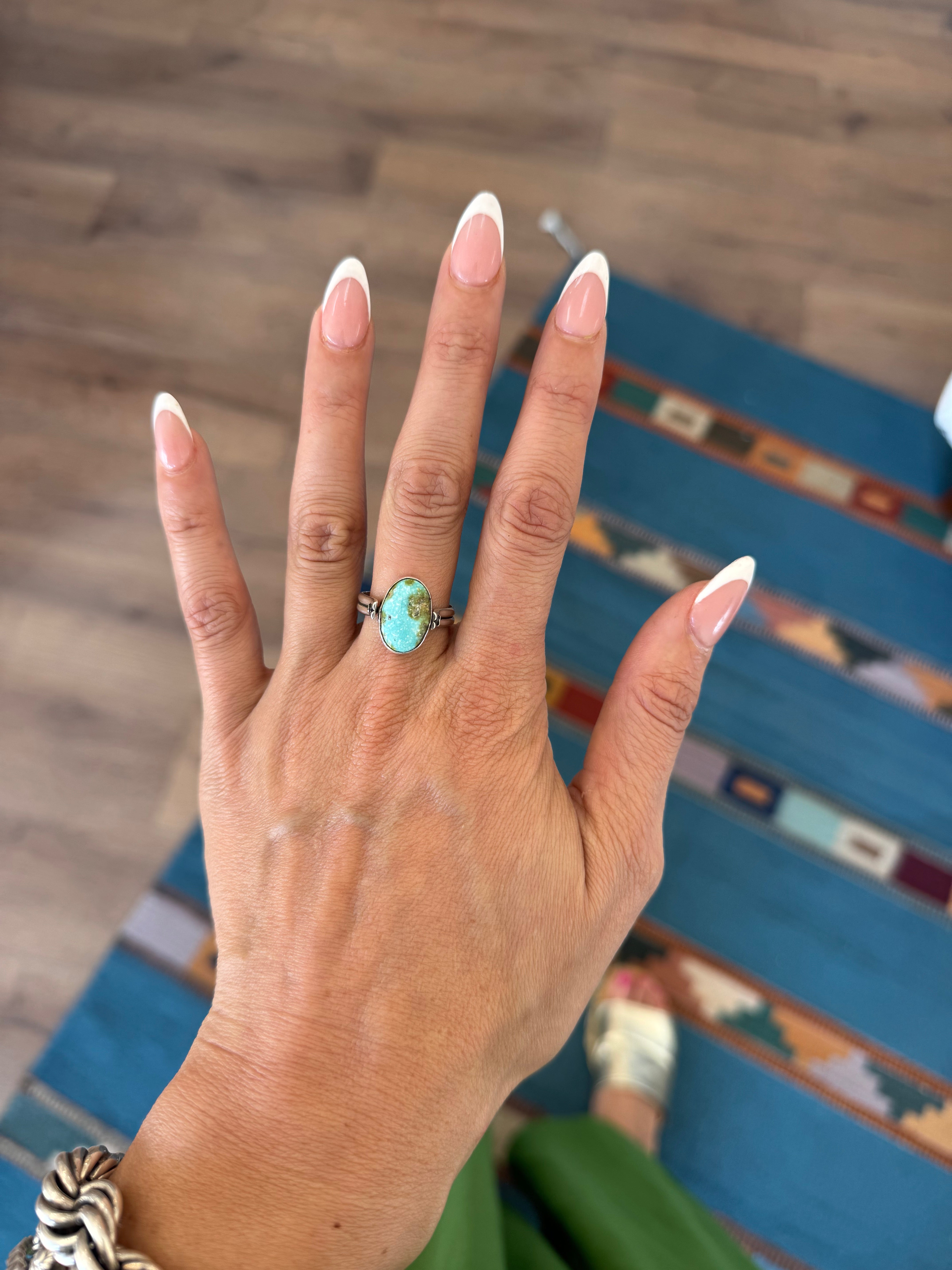 Sonoran turquoise, mined from the Campitos Mountain near Cananea, Sonora, Mexico. This region produces several distinctive types, including Sonoran Gold, known for its vibrant colors like aqua blue, lime, and two-tone blue and green with a golden-brown matrix; Sonoran Rose, a natural bright blue turquoise; and Sonoran Blue, valued for its hardness, shiny pyrite flakes, and black oxide veins.