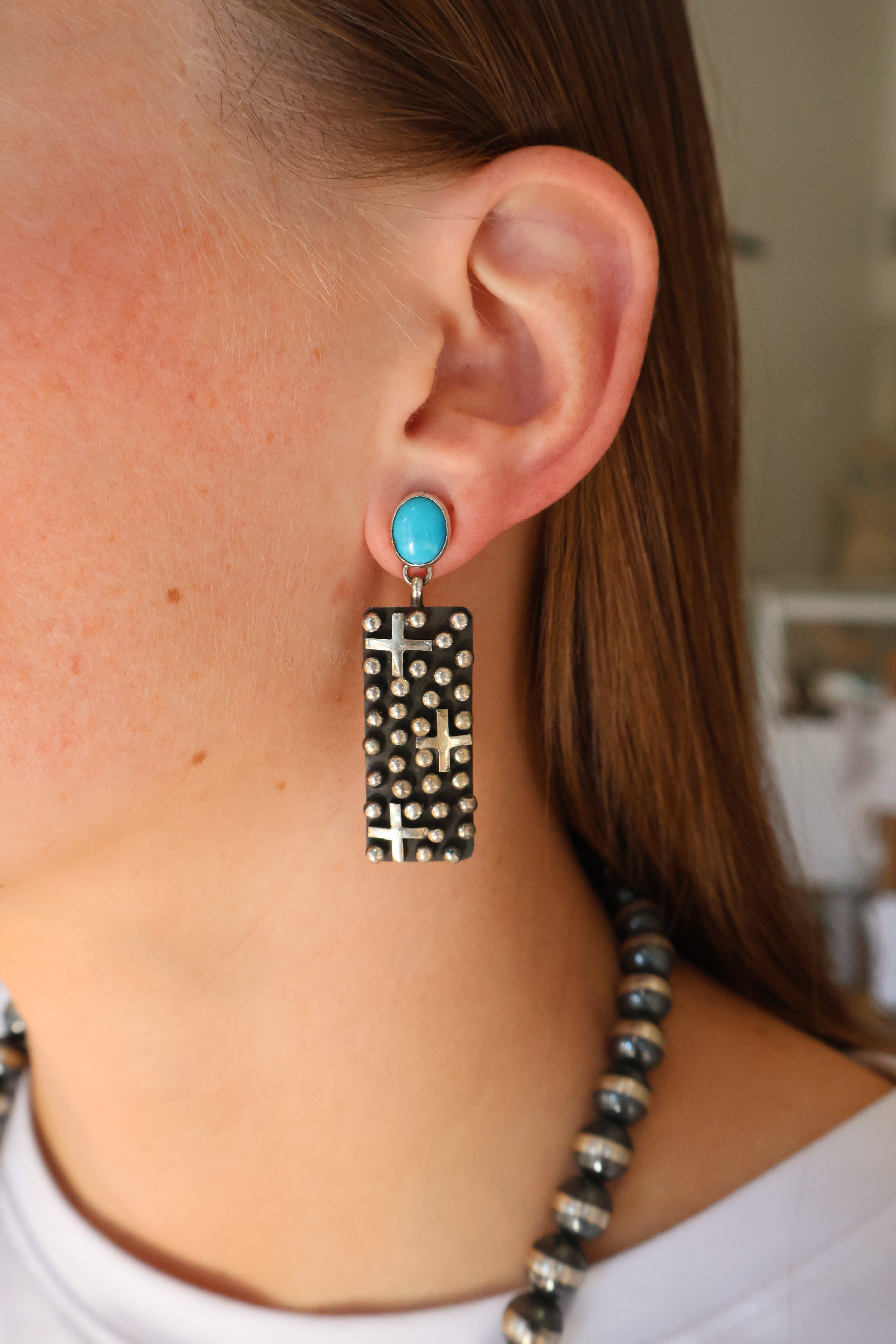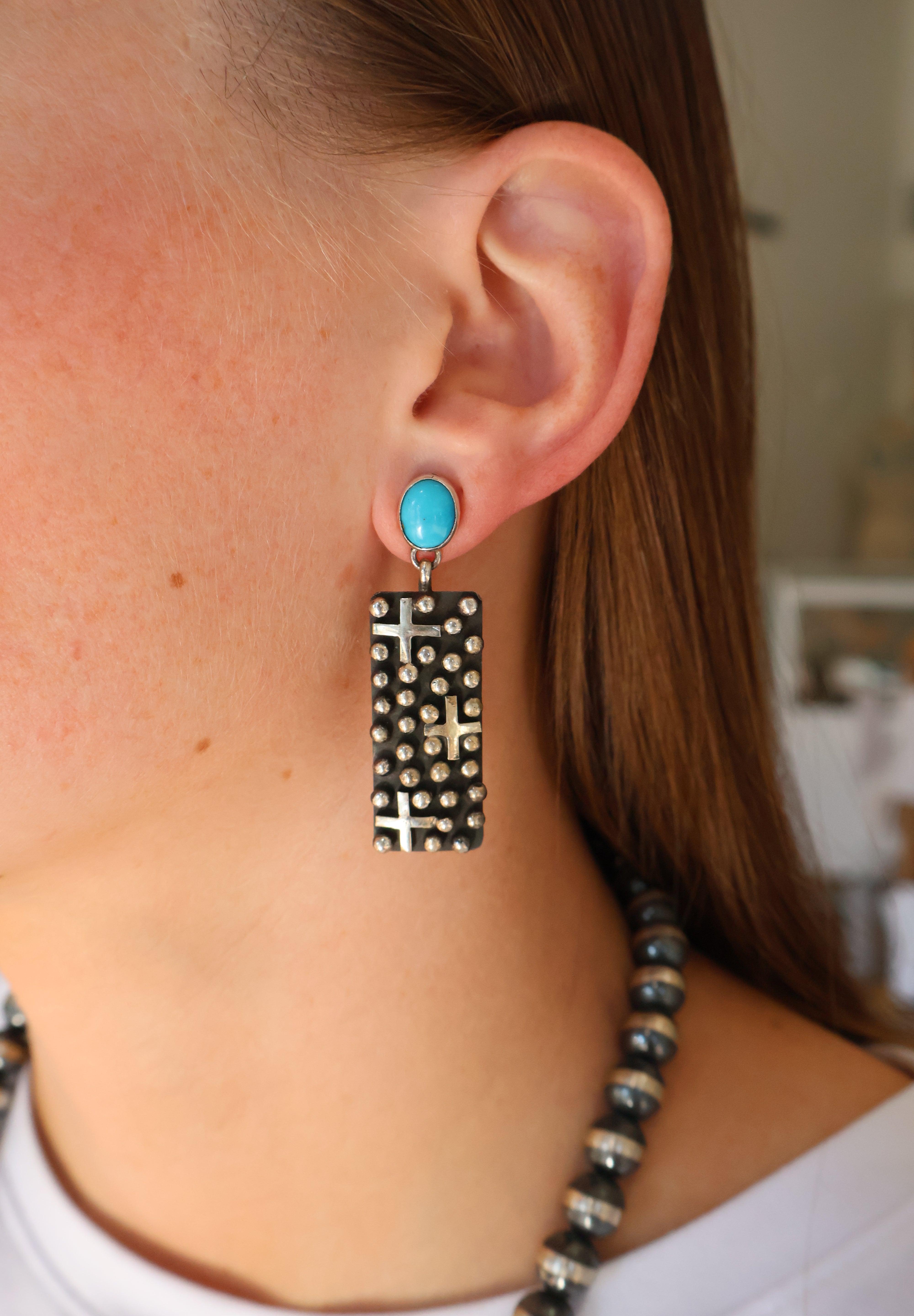Geneva Apachito, born in 1969 in Socorro, New Mexico, was raised in Alamo. She learned the art of silversmithing from her mother, Genevieve Apachito. In addition to crafting stunning cluster earrings and rings, Geneva also hand-makes the cones that complete the Bonecutter neckwear, showcasing her dedication to traditional techniques and artistry.
