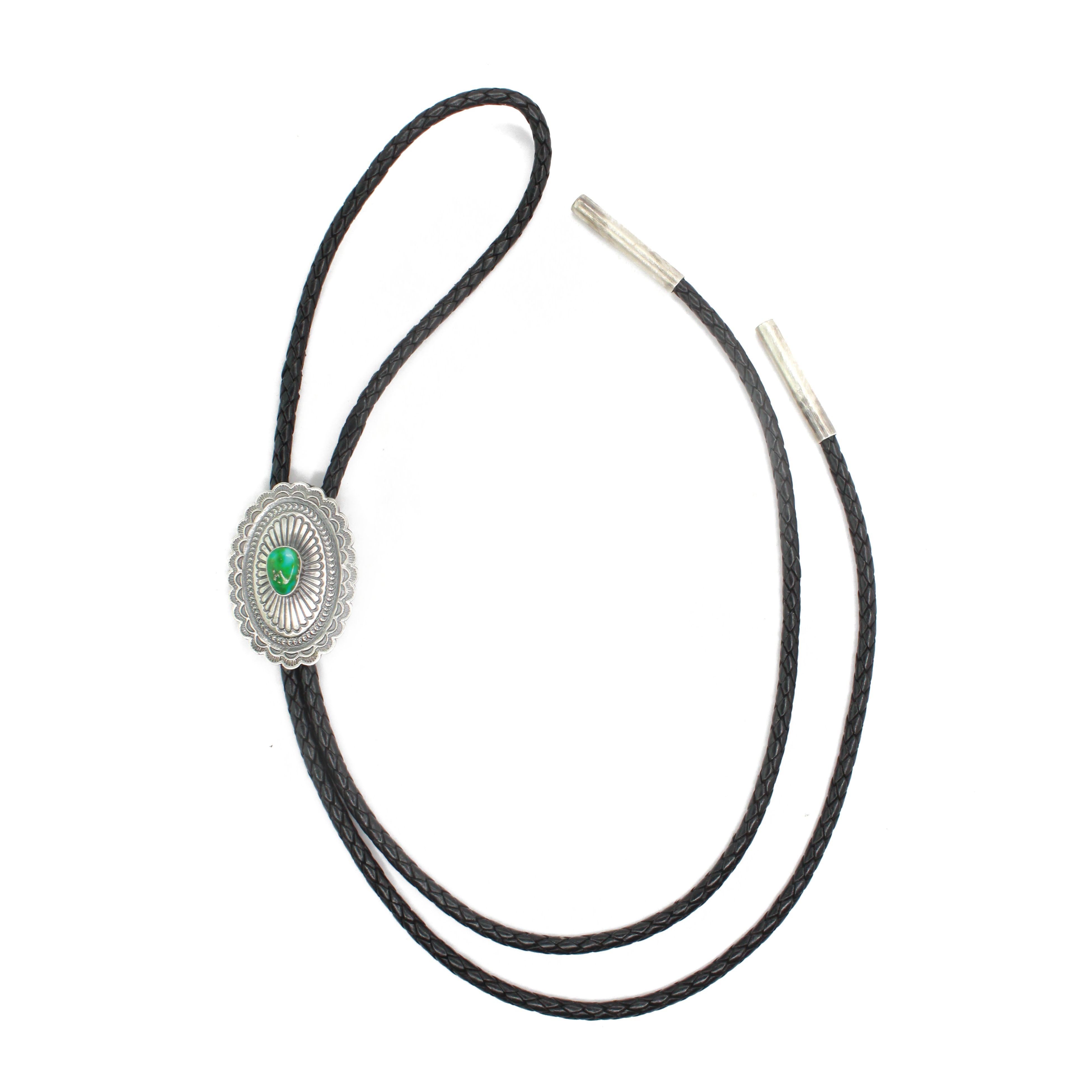 Length end to End Measurements listed for bolos is the entire length of leather cord including any silver tips/embellishments. The 'Cluster Size' or 'The Concho Size' listed is the total height and width of piece that slides.
