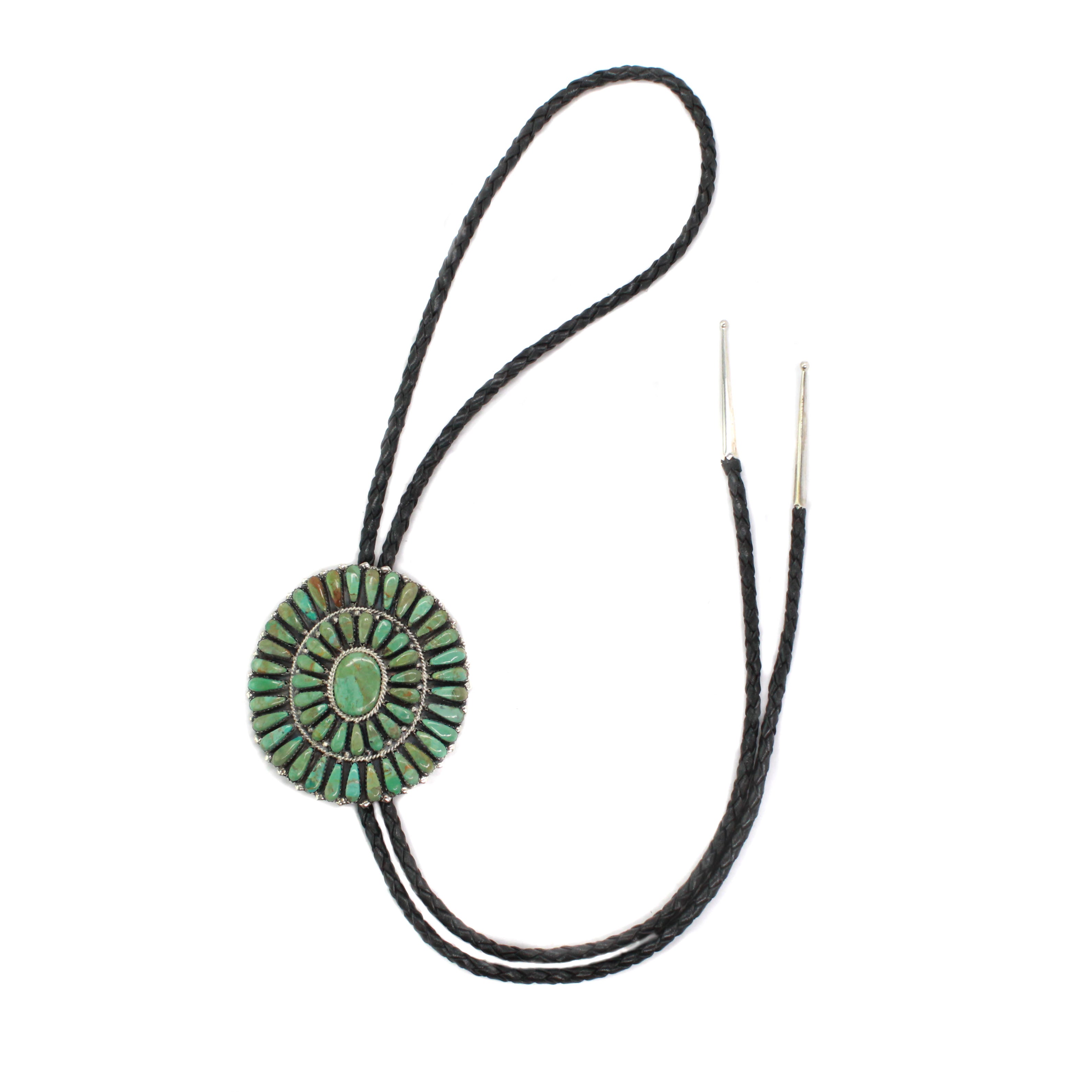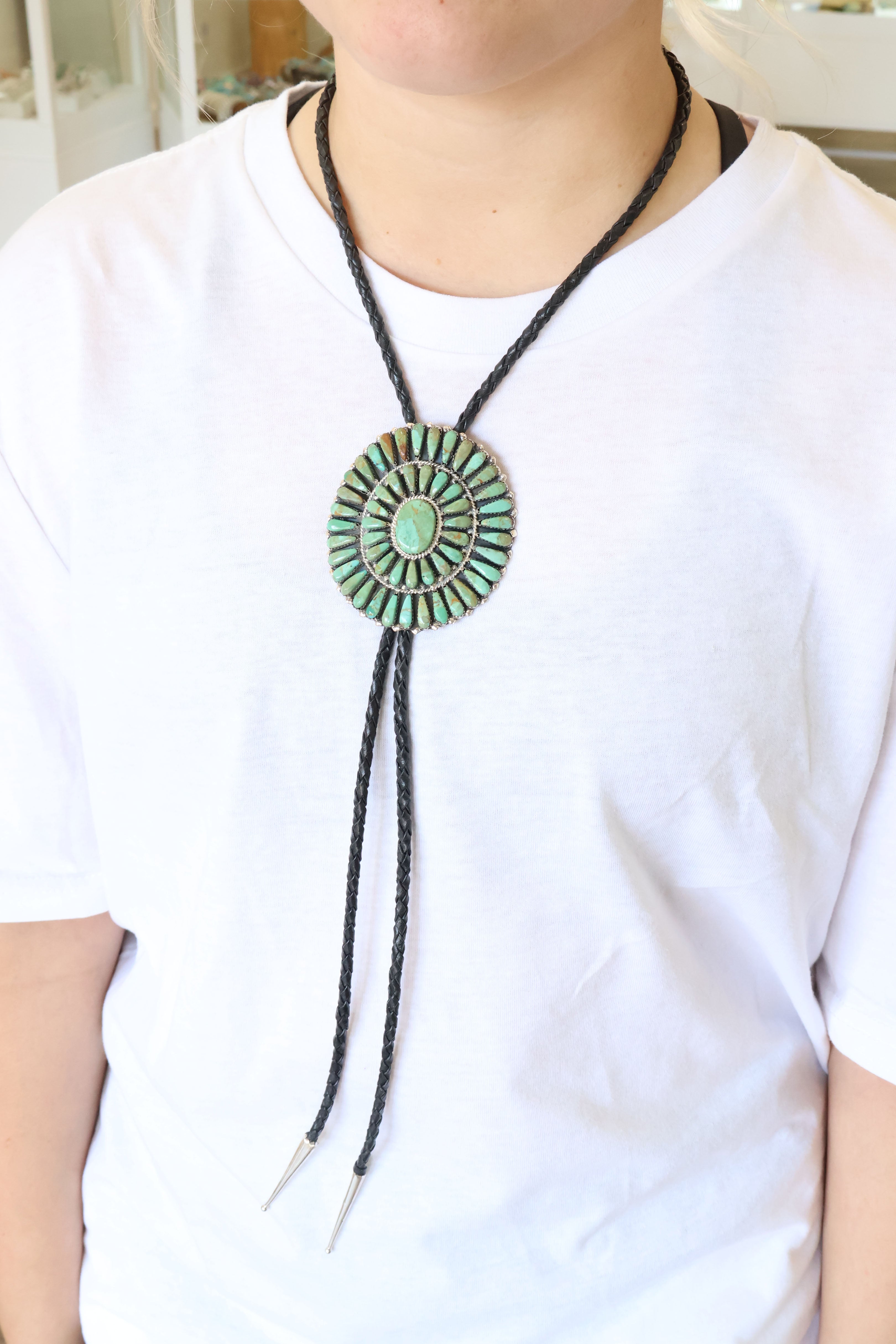 Length end to End Measurements listed for bolos is the entire length of leather cord including any silver tips/embellishments. The 'Cluster Size' or 'The Concho Size' listed is the total height and width of piece that slides.