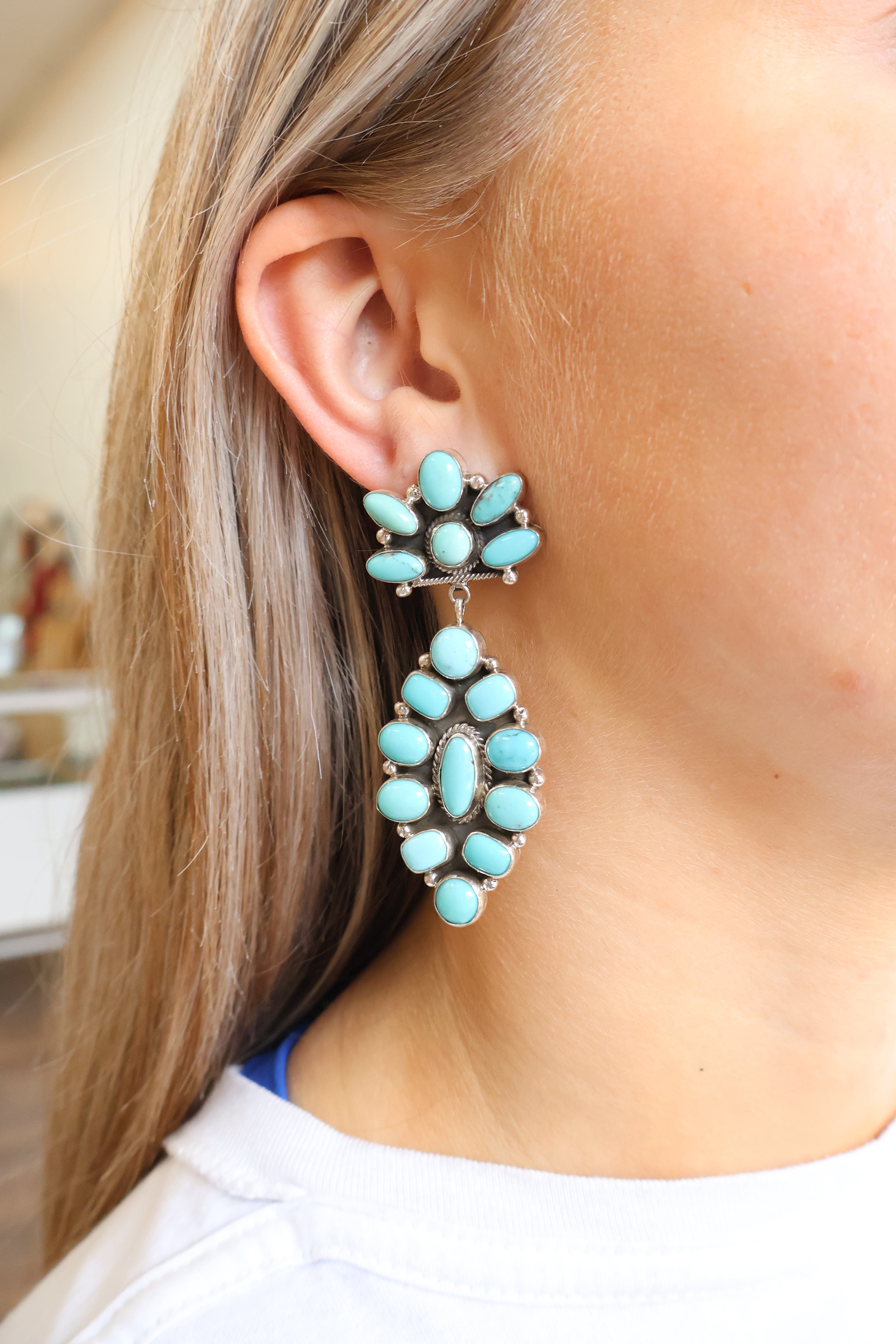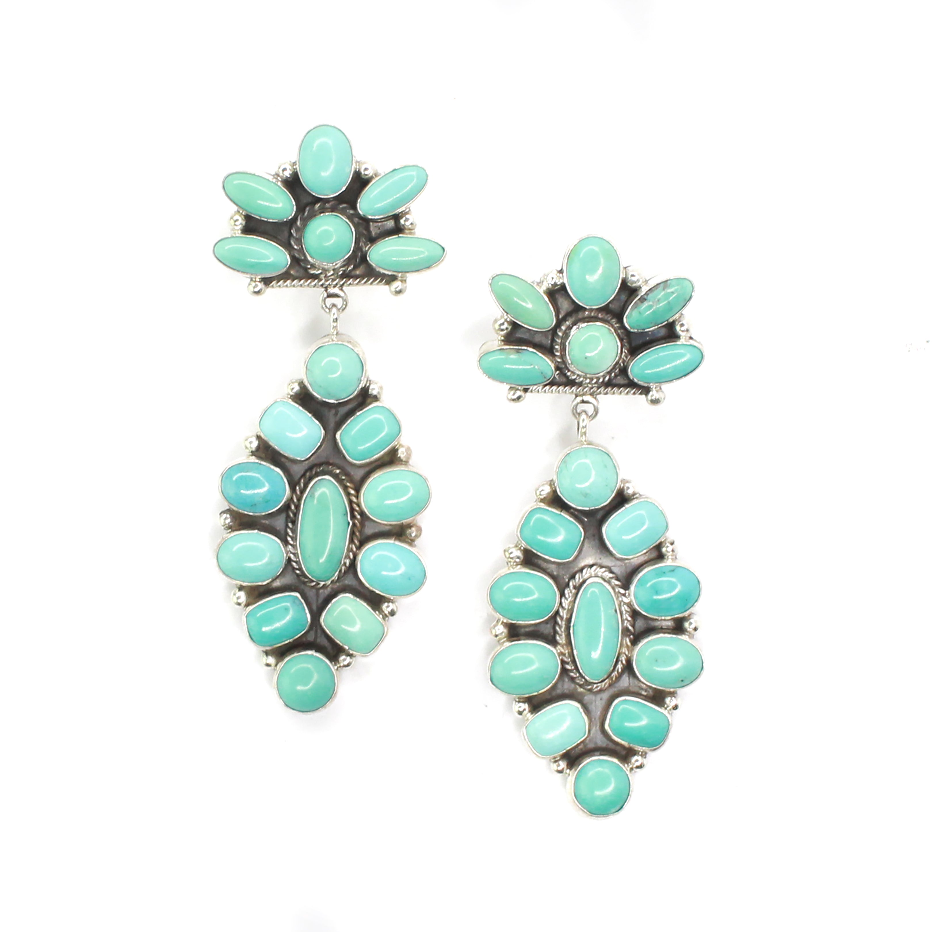 Navajo silversmith Eula Wylie hails from Ganado, Arizona, located on the Navajo Reservation. She is renowned for her exquisite use of Sonoran Beauty Turquoise clusters, elegantly wrapped in delicate twist wire designs and set against a backdrop of oxidized sterling silver. Eula previously crafted jewelry for Atkins Trading Company.