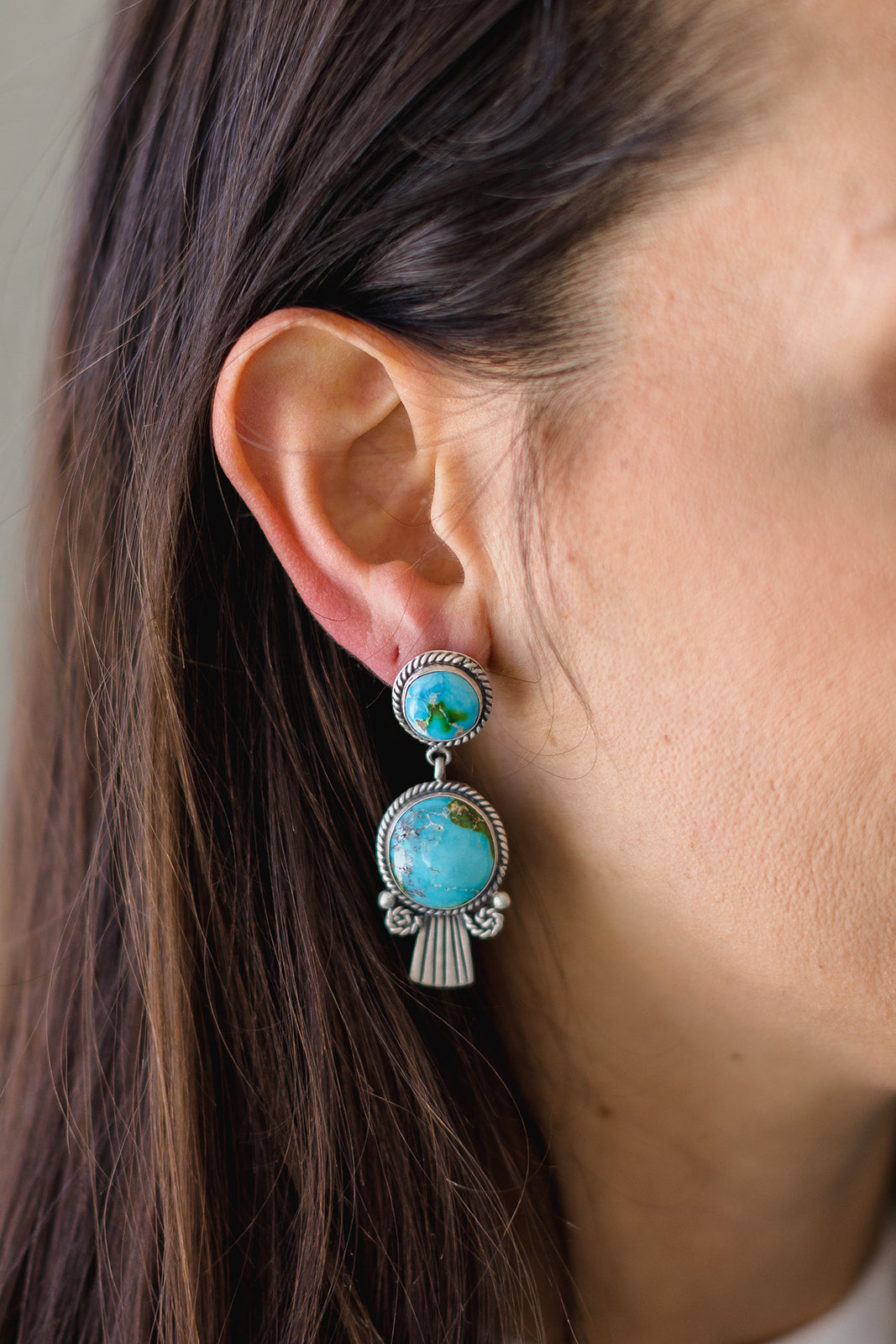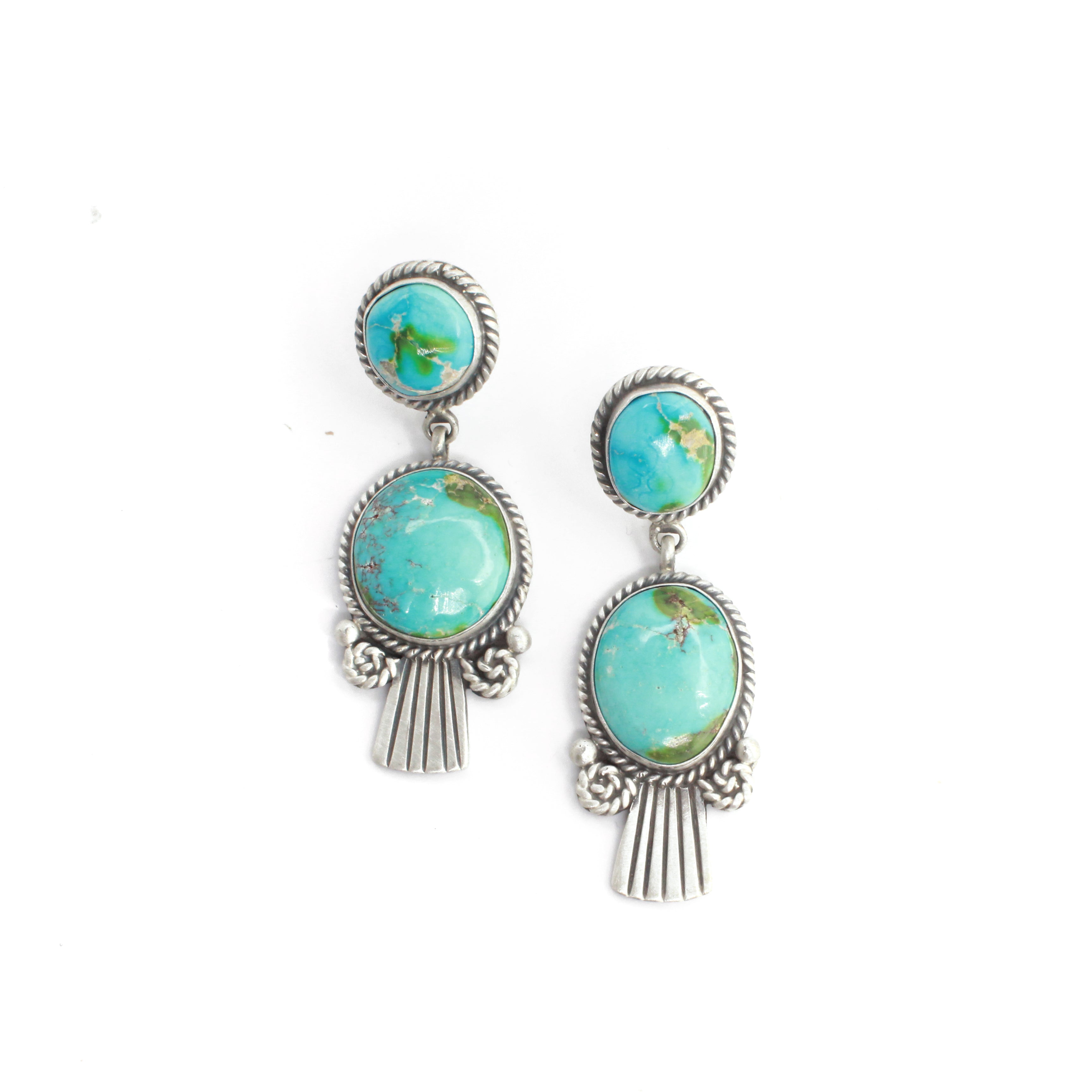 Navajo silversmith Eula Wylie hails from Ganado, Arizona, located on the Navajo Reservation. She is renowned for her exquisite use of Sonoran Beauty Turquoise clusters, elegantly wrapped in delicate twist wire designs and set against a backdrop of oxidized sterling silver. Eula previously crafted jewelry for Atkins Trading Company.