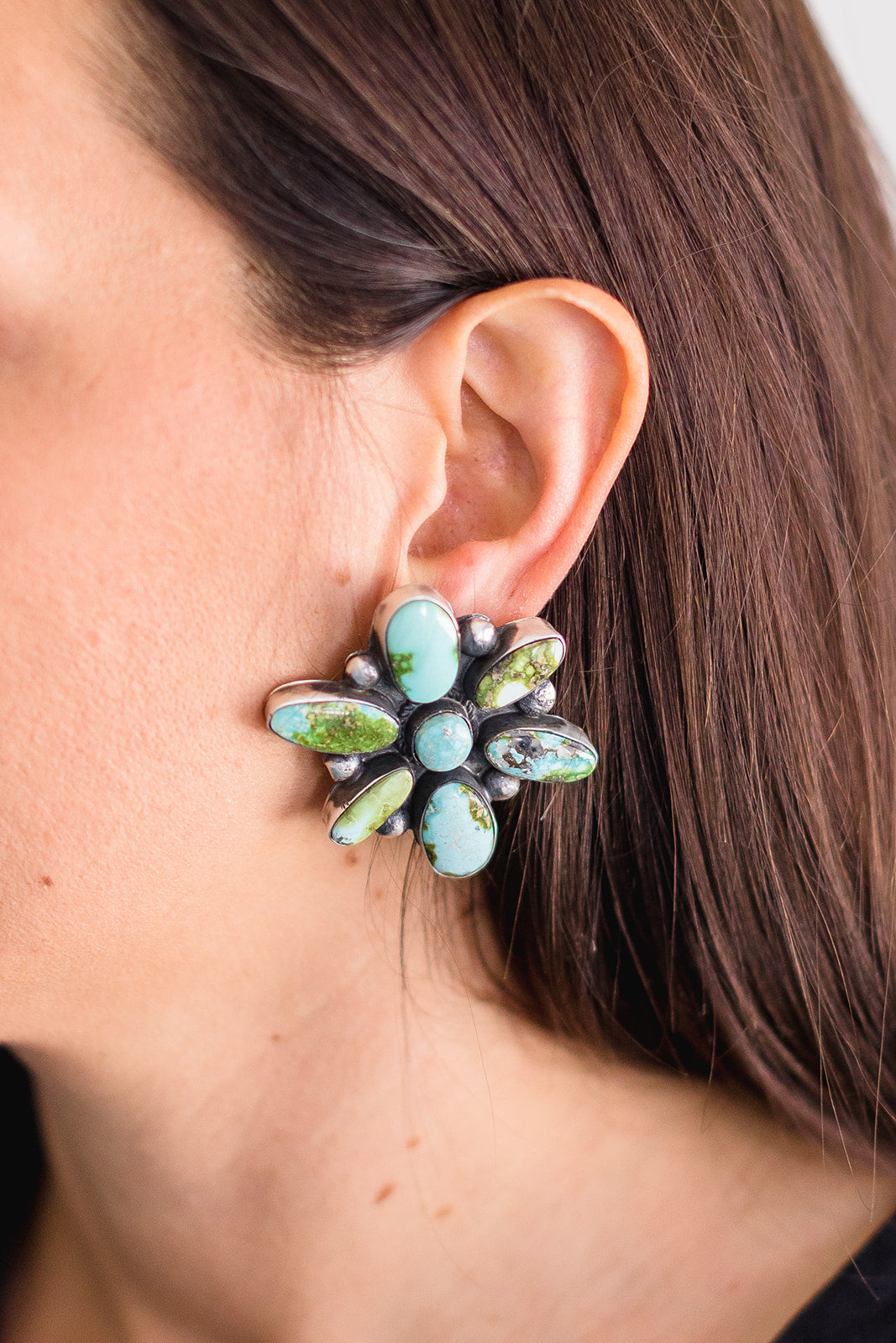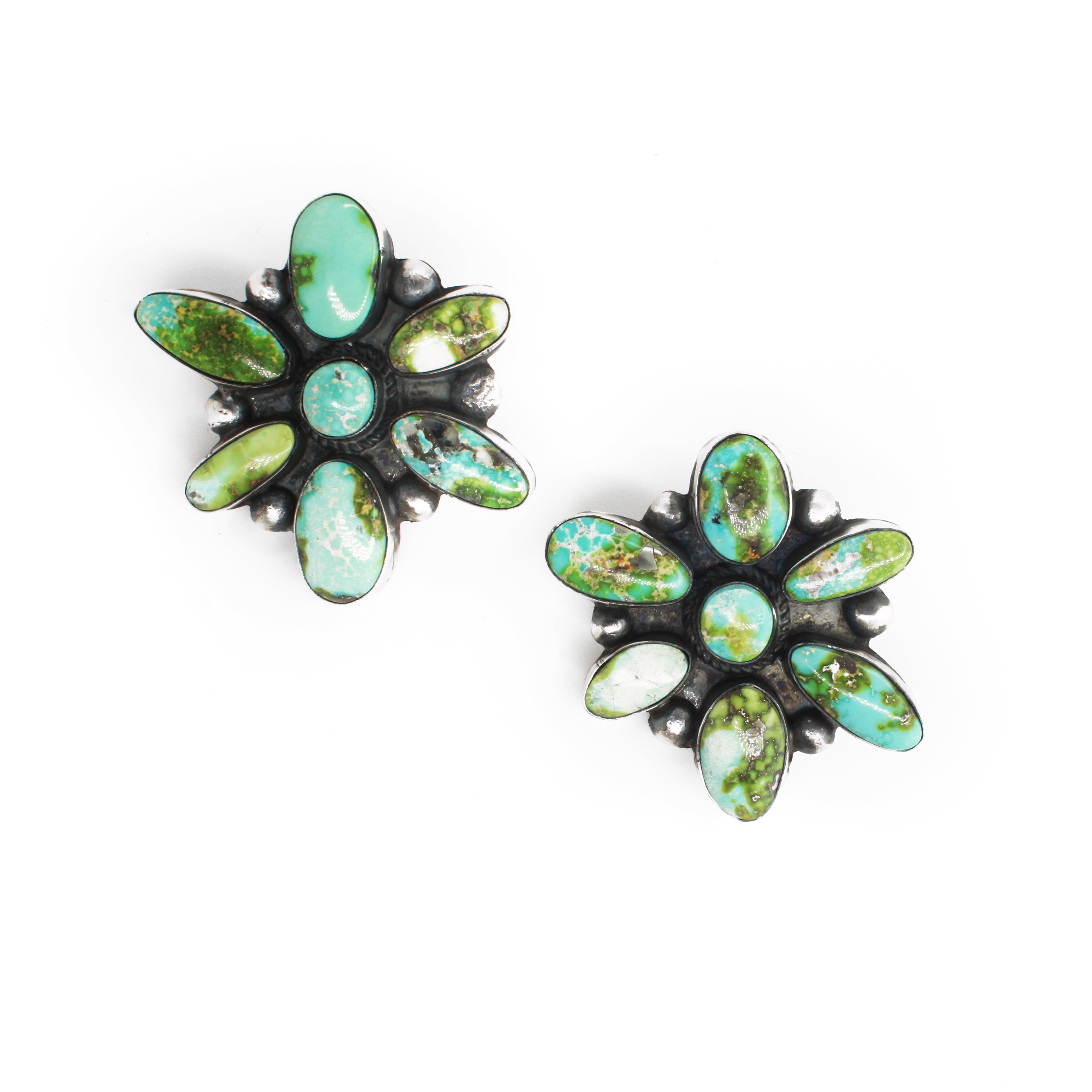 Sonoran turquoise, mined from the Campitos Mountain near Cananea, Sonora, Mexico. This region produces several distinctive types, including Sonoran Gold, known for its vibrant colors like aqua blue, lime, and two-tone blue and green with a golden-brown matrix; Sonoran Rose, a natural bright blue turquoise; and Sonoran Blue, valued for its hardness, shiny pyrite flakes, and black oxide veins.