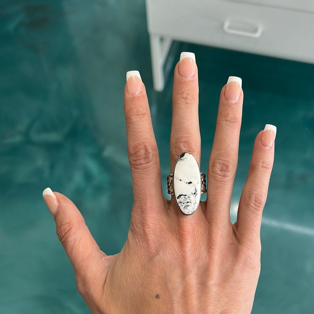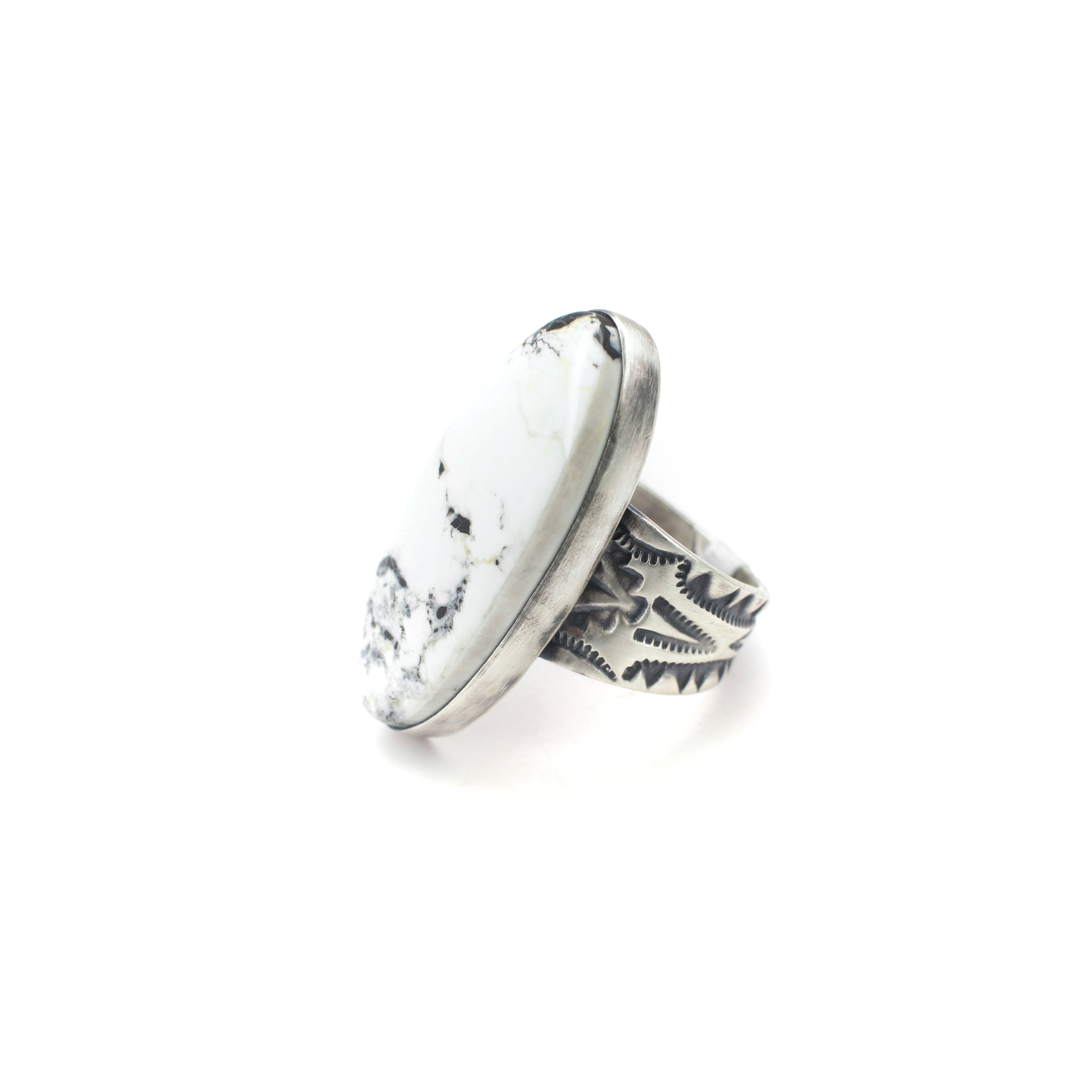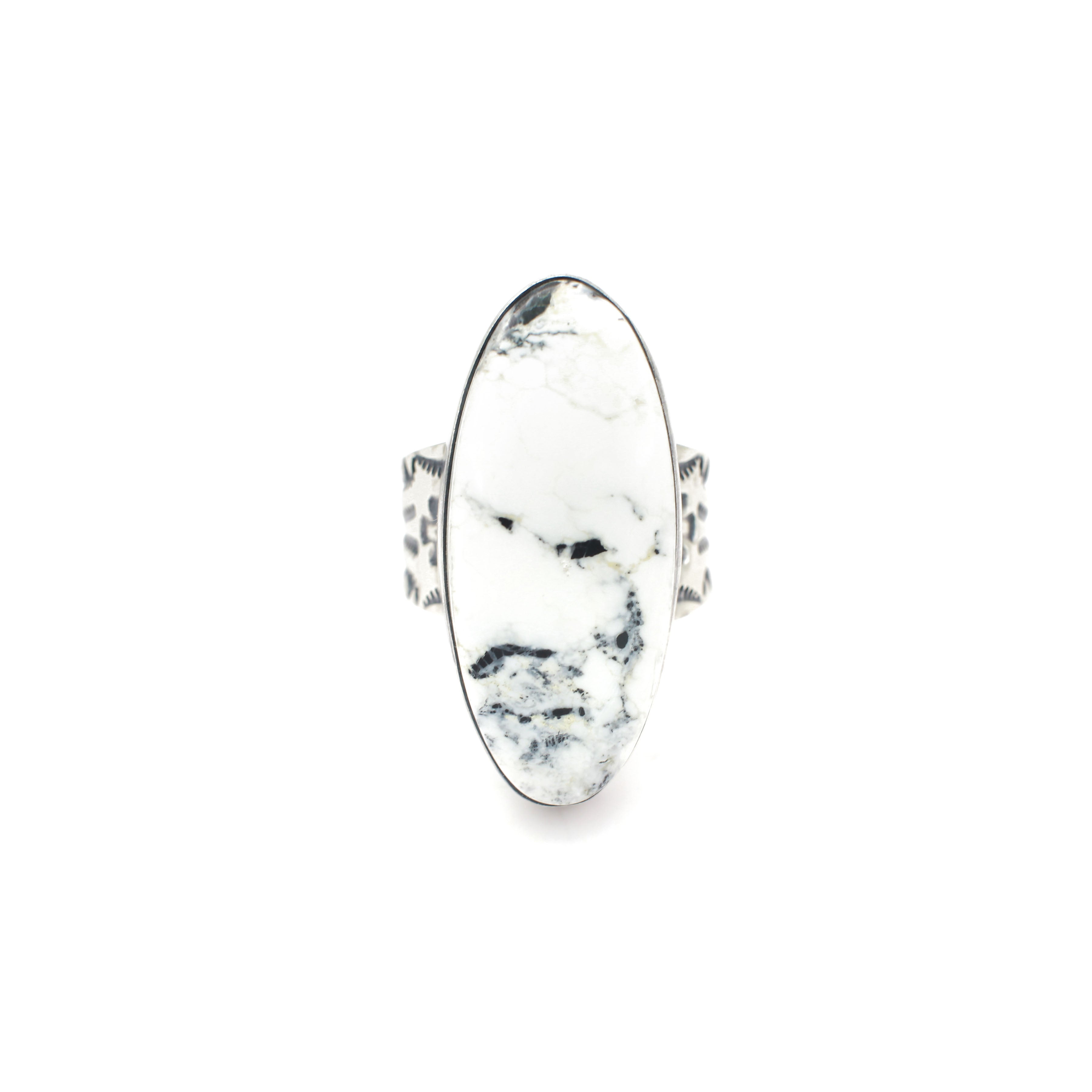 White Buffalo is in fact NOT turquoise. Although White Buffalo is often sold as turquoise, it's classification is actually magnesite and alumite. Its unique coloring comes from the presence of Calcite mineral. The only mine known to be home to White Buffalo is The Dry Creek Mine in Tonopah, NV. It was first discovered by the Otteson family in 1993. The name derives from the Native American belief that white buffaloes are pure and rare like the white buffalo stone. The white stone is surrounded by black and brown flint-like chert which creates beautiful patterns, and sometimes in rare pieces, a spider-web matrix. The stone appears in veins, is as hard as turquoise (Mohs hardness scale of 5.5 to 7.5) and cuts and polishes like turquoise.