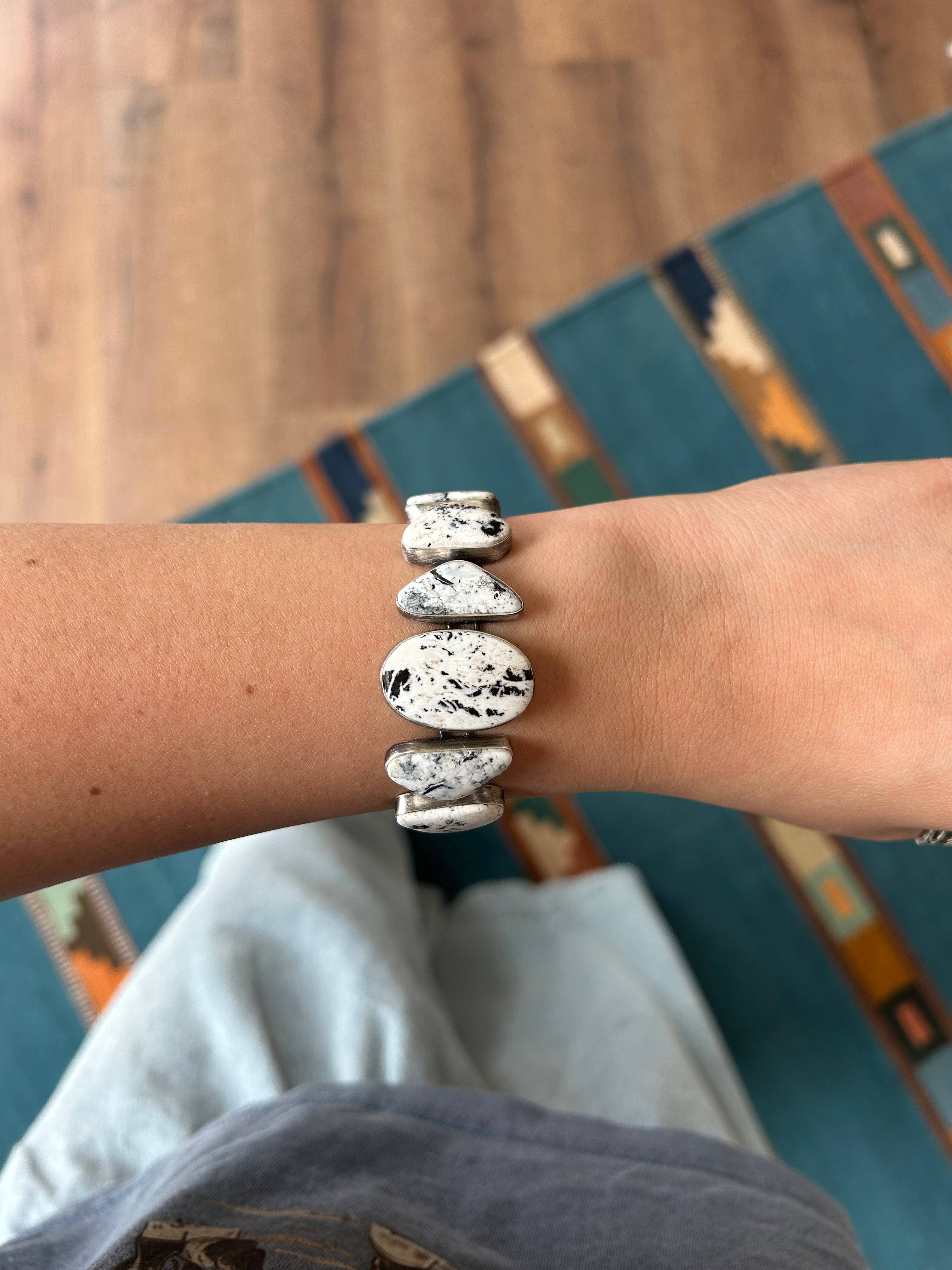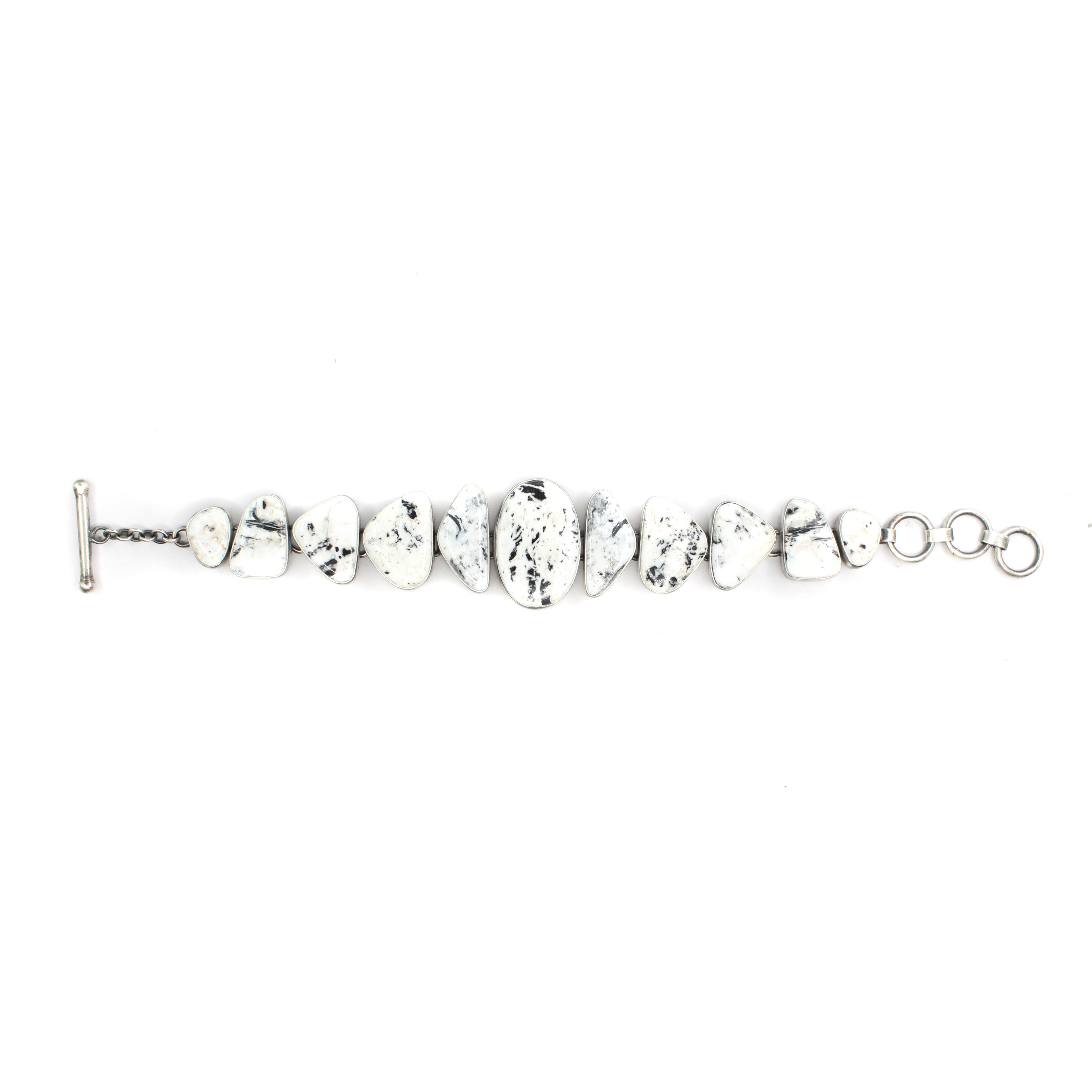 White Buffalo is in fact NOT turquoise. Although White Buffalo is often sold as turquoise, it's classification is actually magnesite and alumite. Its unique coloring comes from the presence of Calcite mineral. The only mine known to be home to White Buffalo is The Dry Creek Mine in Tonopah, NV. It was first discovered by the Otteson family in 1993. The name derives from the Native American belief that white buffaloes are pure and rare like the white buffalo stone. The white stone is surrounded by black and brown flint-like chert which creates beautiful patterns, and sometimes in rare pieces, a spider-web matrix. The stone appears in veins, is as hard as turquoise (Mohs hardness scale of 5.5 to 7.5) and cuts and polishes like turquoise.