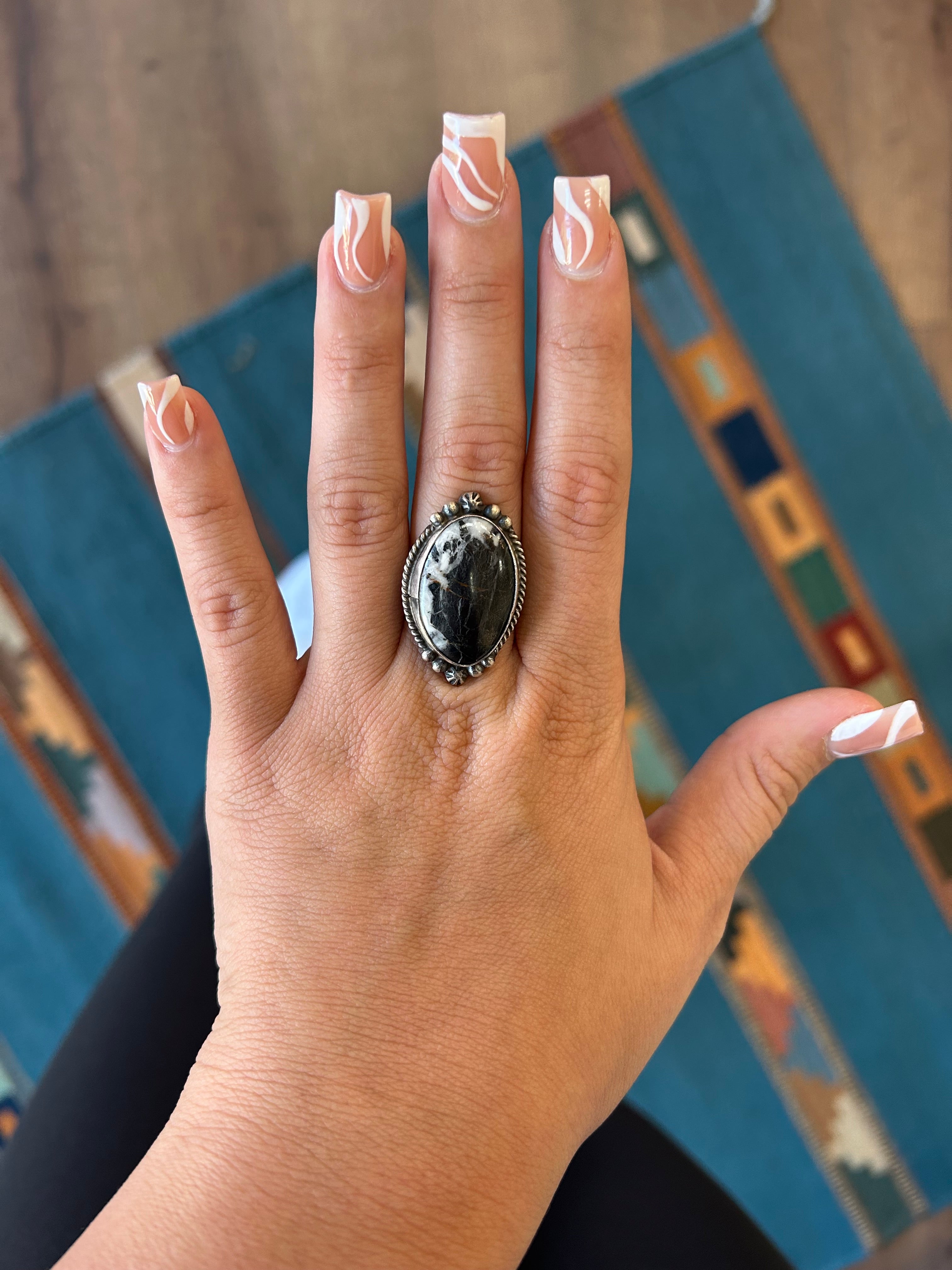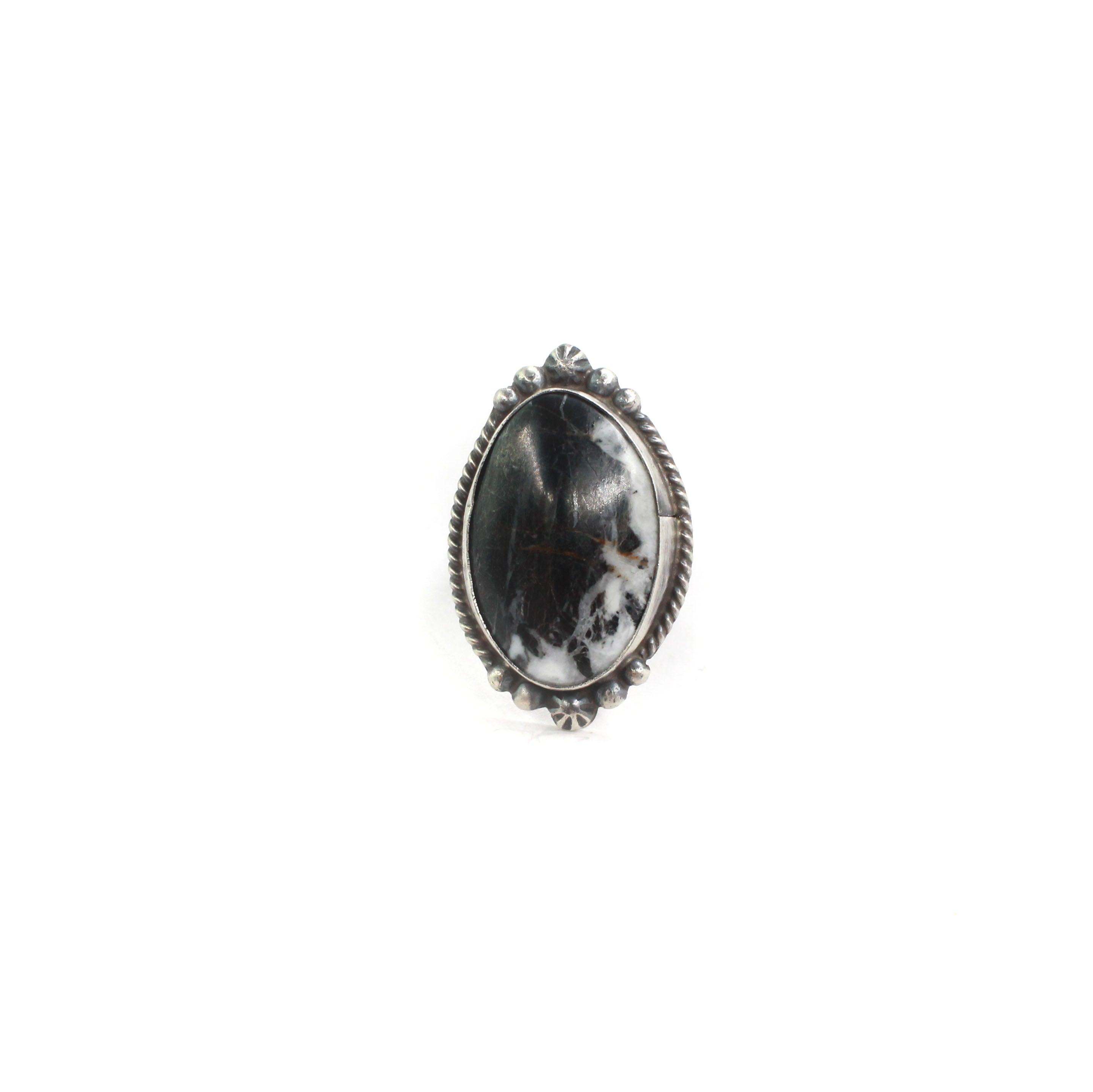 White Buffalo is in fact NOT turquoise. Although White Buffalo is often sold as turquoise, it's classification is actually magnesite and alumite. Its unique coloring comes from the presence of Calcite mineral. The only mine known to be home to White Buffalo is The Dry Creek Mine in Tonopah, NV. It was first discovered by the Otteson family in 1993. The name derives from the Native American belief that white buffaloes are pure and rare like the white buffalo stone. The white stone is surrounded by black and brown flint-like chert which creates beautiful patterns, and sometimes in rare pieces, a spider-web matrix. The stone appears in veins, is as hard as turquoise (Mohs hardness scale of 5.5 to 7.5) and cuts and polishes like turquoise.