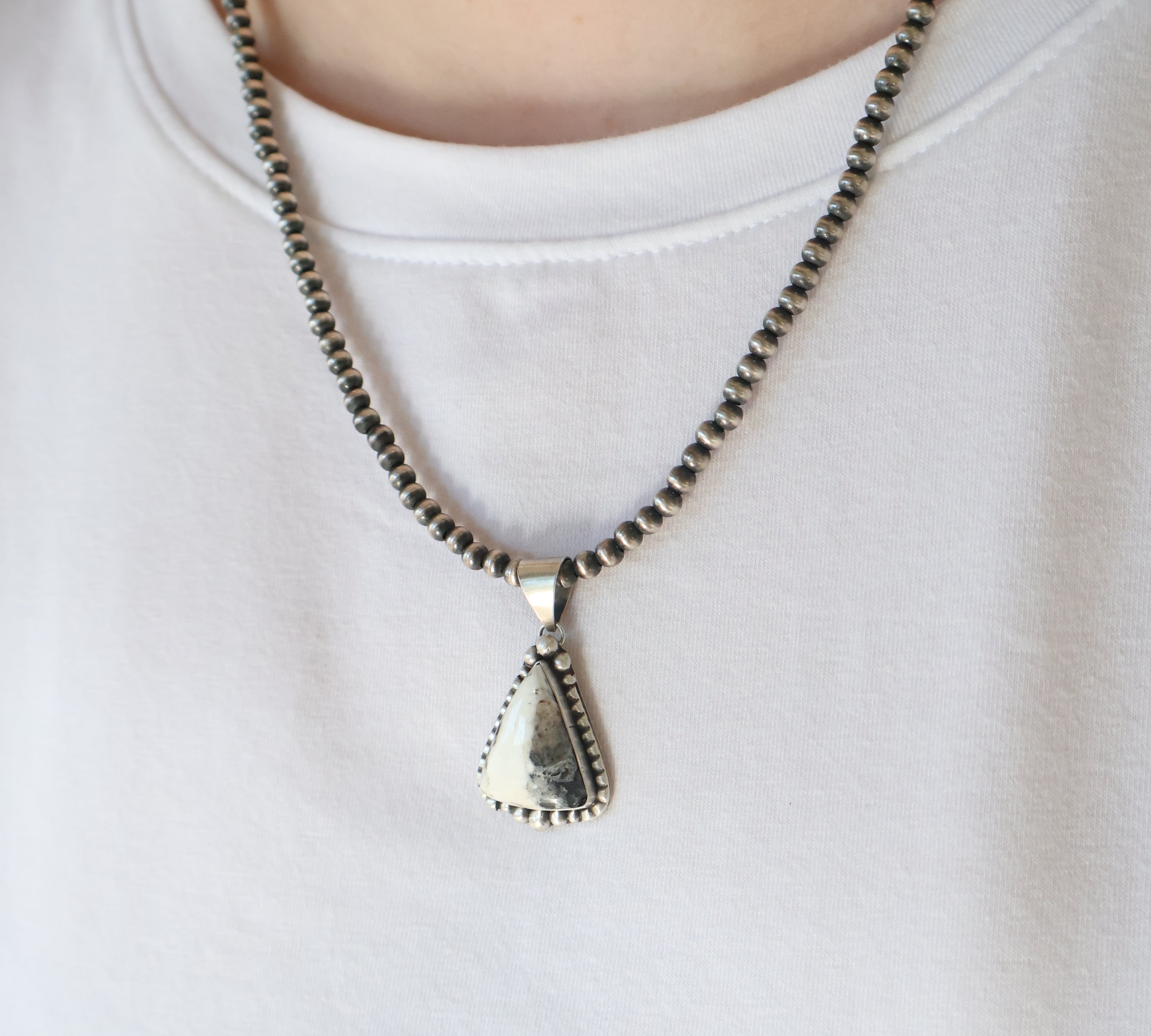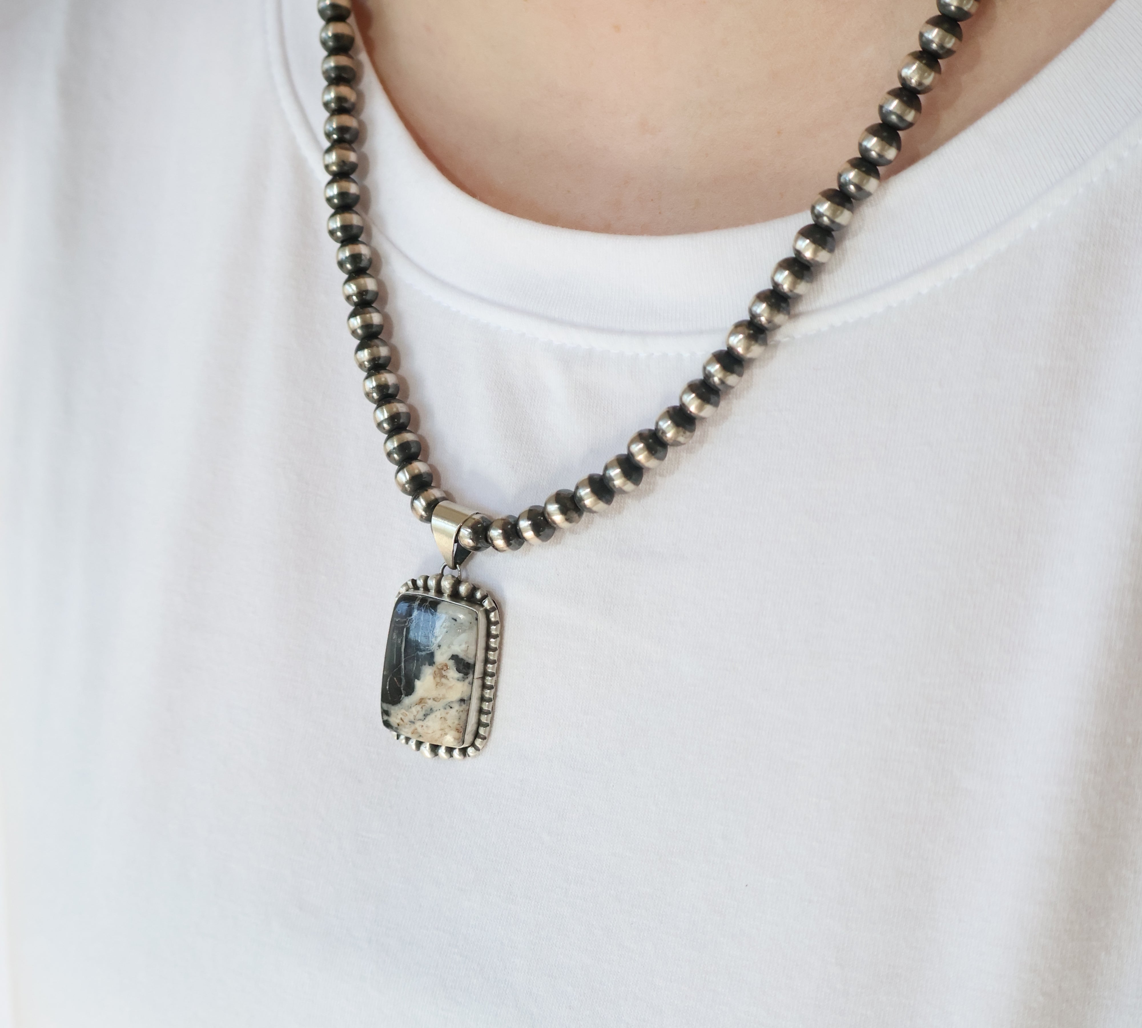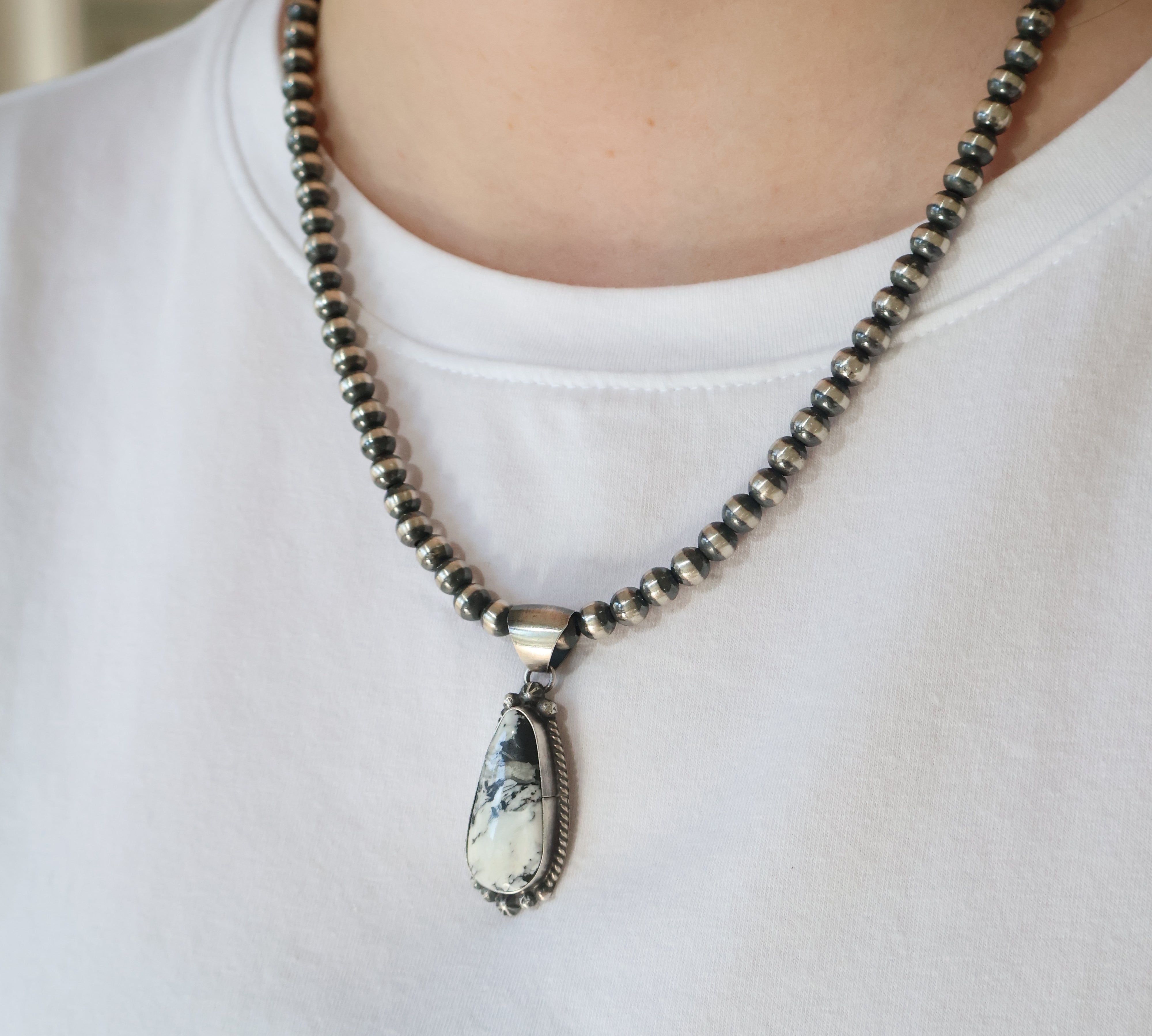 White Buffalo is in fact NOT turquoise. Although White Buffalo is often sold as turquoise, it's classification is actually magnesite and alumite. Its unique coloring comes from the presence of Calcite mineral. The only mine known to be home to White Buffalo is The Dry Creek Mine in Tonopah, NV. It was first discovered by the Otteson family in 1993. The name derives from the Native American belief that white buffaloes are pure and rare like the white buffalo stone. The white stone is surrounded by black and brown flint-like chert which creates beautiful patterns, and sometimes in rare pieces, a spider-web matrix. The stone appears in veins, is as hard as turquoise (Mohs hardness scale of 5.5 to 7.5) and cuts and polishes like turquoise.