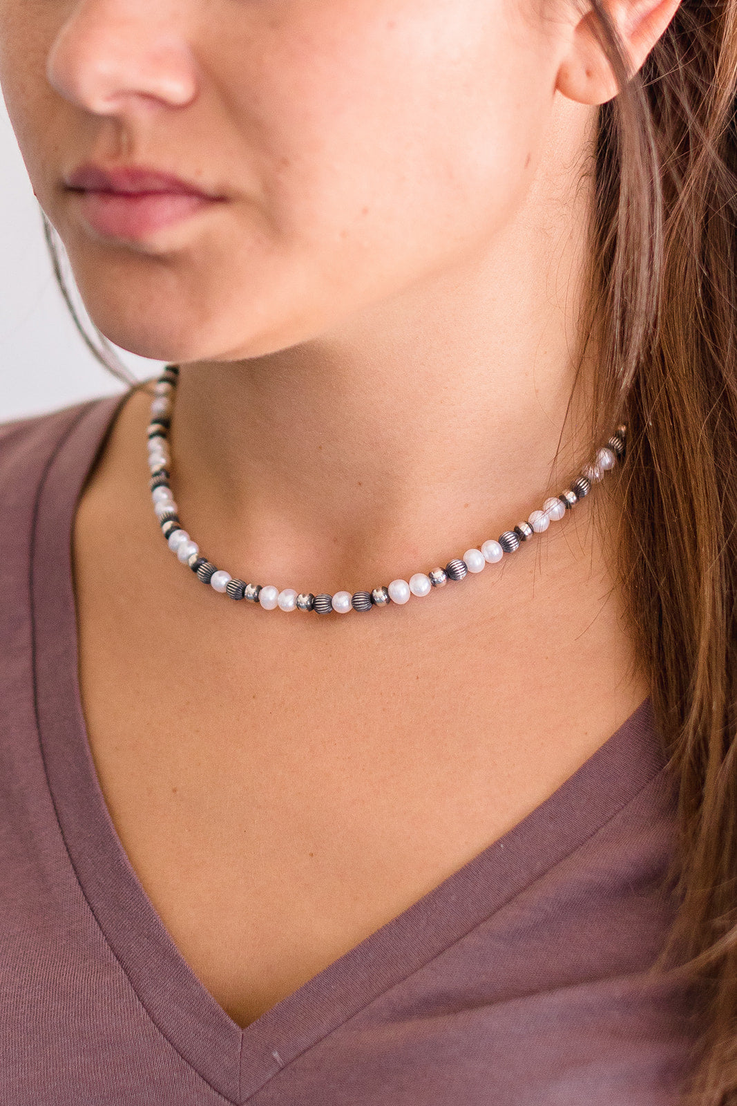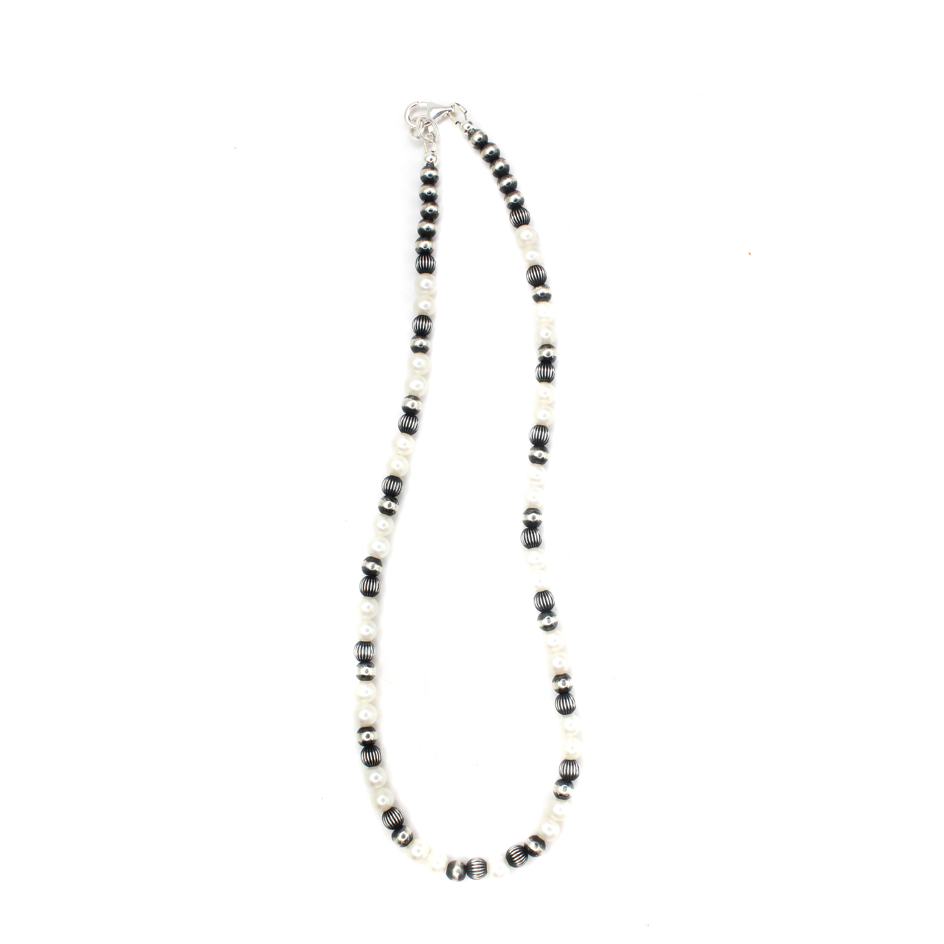 Navajo pearls by Marilyn Platero are a stunning blend of traditional style and contemporary craftsmanship. Known for her impeccable attention to detail, Marilyn strings her pearls on foxtail chain and finishes the ends with soldered clasps for added durability. Her use of machine-made beads provides a uniform and consistent appearance compared to handmade options. The use of machines also allows her to create pearls that range in size from 4mm. Unlike other machine-made beads, Marilyn's have a substantial weight and feel, adding to their quality and appearance. Her beads are oxidized and buffed by hand by Navajo artist Bronson Belone.
