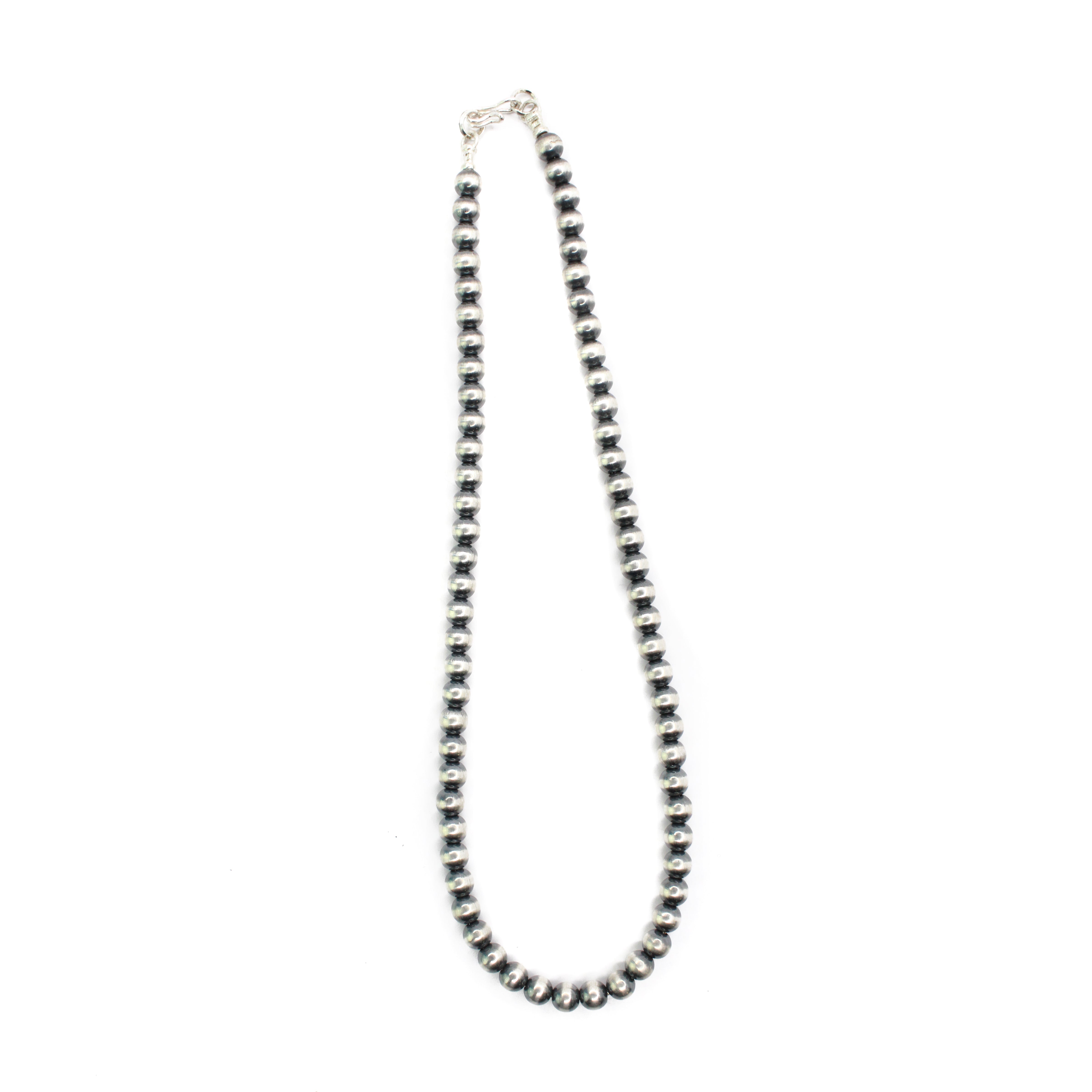 Navajo pearls by Marilyn Platero are a stunning blend of traditional style and contemporary craftsmanship. Known for her impeccable attention to detail, Marilyn strings her pearls on foxtail chain and finishes the ends with soldered clasps for added durability. Her use of machine-made beads provides a uniform and consistent appearance compared to handmade options. The use of machines also allows her to create pearls that range in size from 4mm. Unlike other machine-made beads, Marilyn's have a substantial weight and feel, adding to their quality and appearance. Her beads are oxidized and buffed by hand by Navajo artist Bronson Belone.