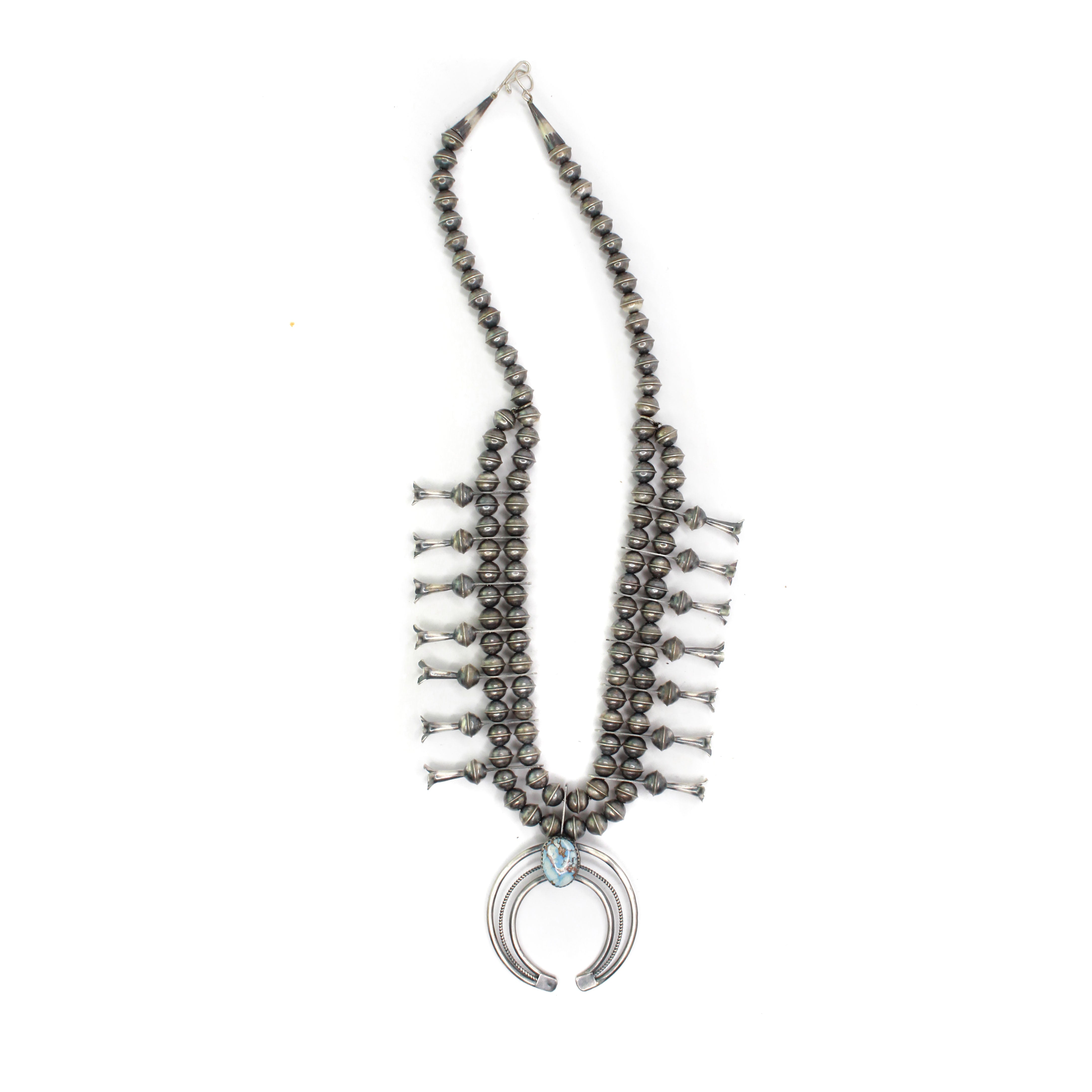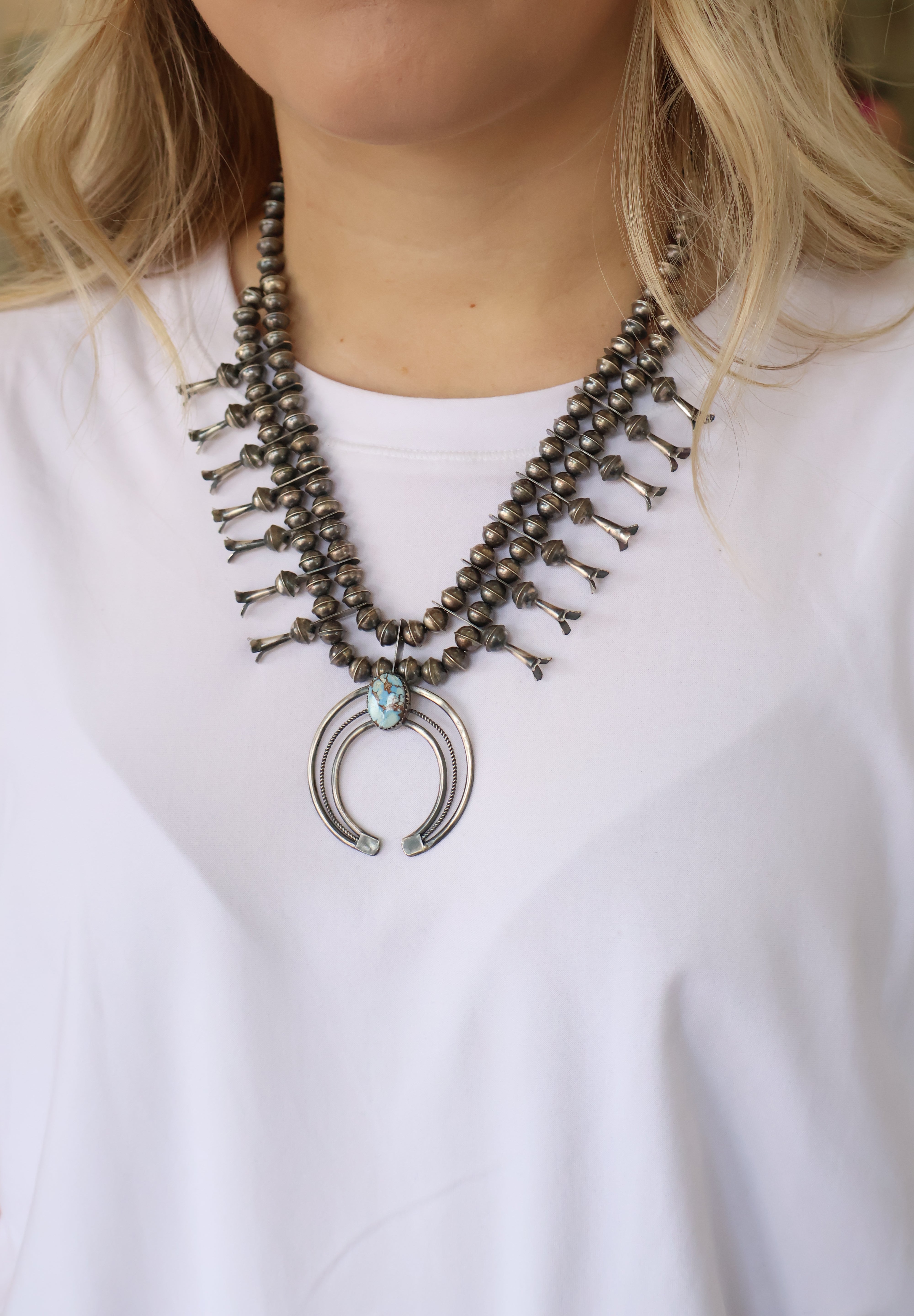 The 'end to end' length listed for Squash Blossom necklaces is measured from clasp to hook and does not include the 'drop' of the Naja. For a more accurate length reference, model photos are provided. Additionally, Naja measurements are also included to give a complete view of the necklace's dimensions.