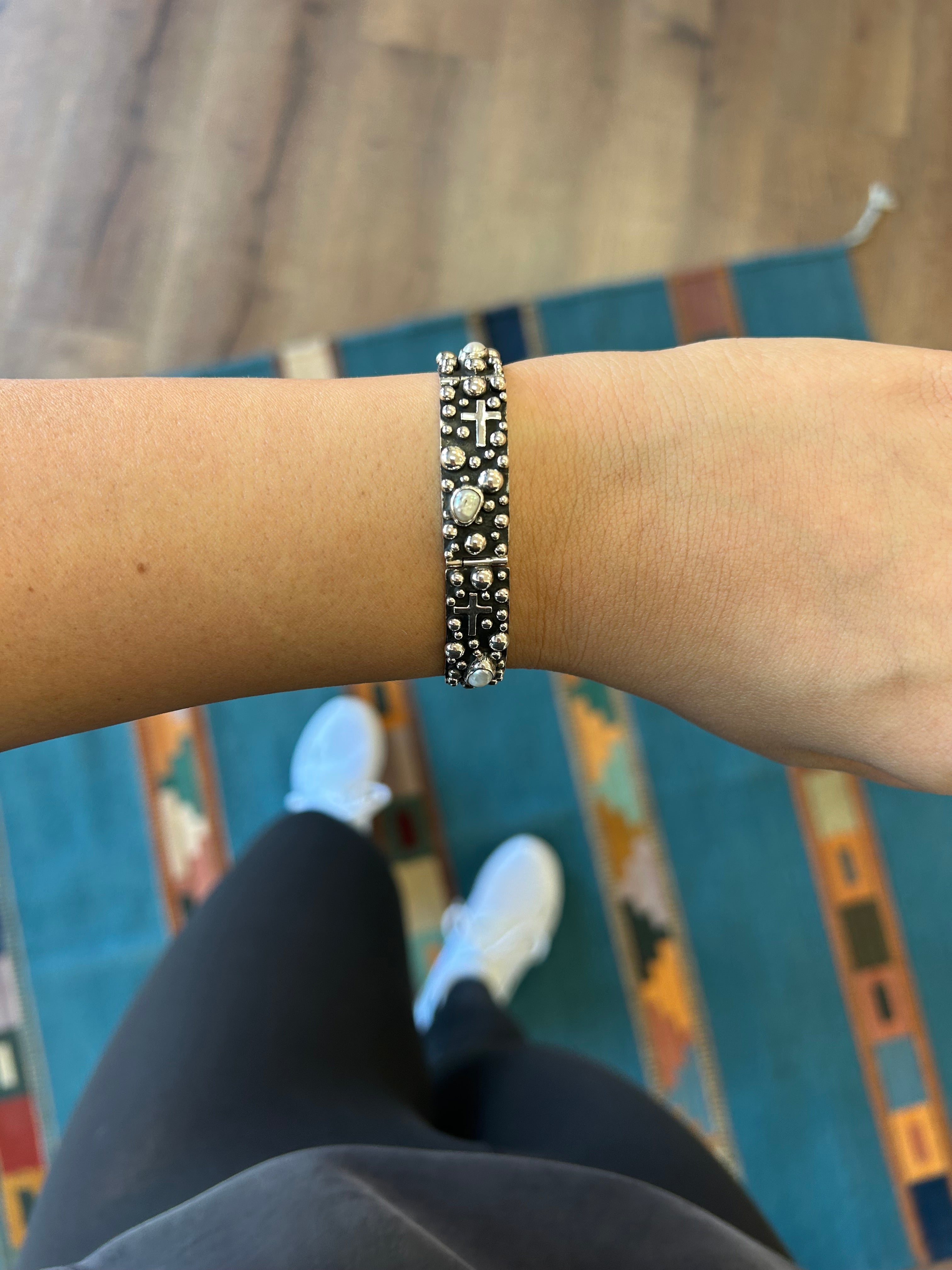 Akee Douglas, a skilled Navajo silversmith from Gallup, New Mexico, draws deeply from his cultural heritage and early exposure to Native American jewelry. His journey in silversmithing reflects a dedicated pursuit of excellence, resulting in finely crafted designs that honor traditional artistry. Known for his distinct style, Akee uses oxidized backgrounds to create bold contrasts that highlight the vibrant beauty of high-quality stones, showcasing his unique vision and reverence for his craft.