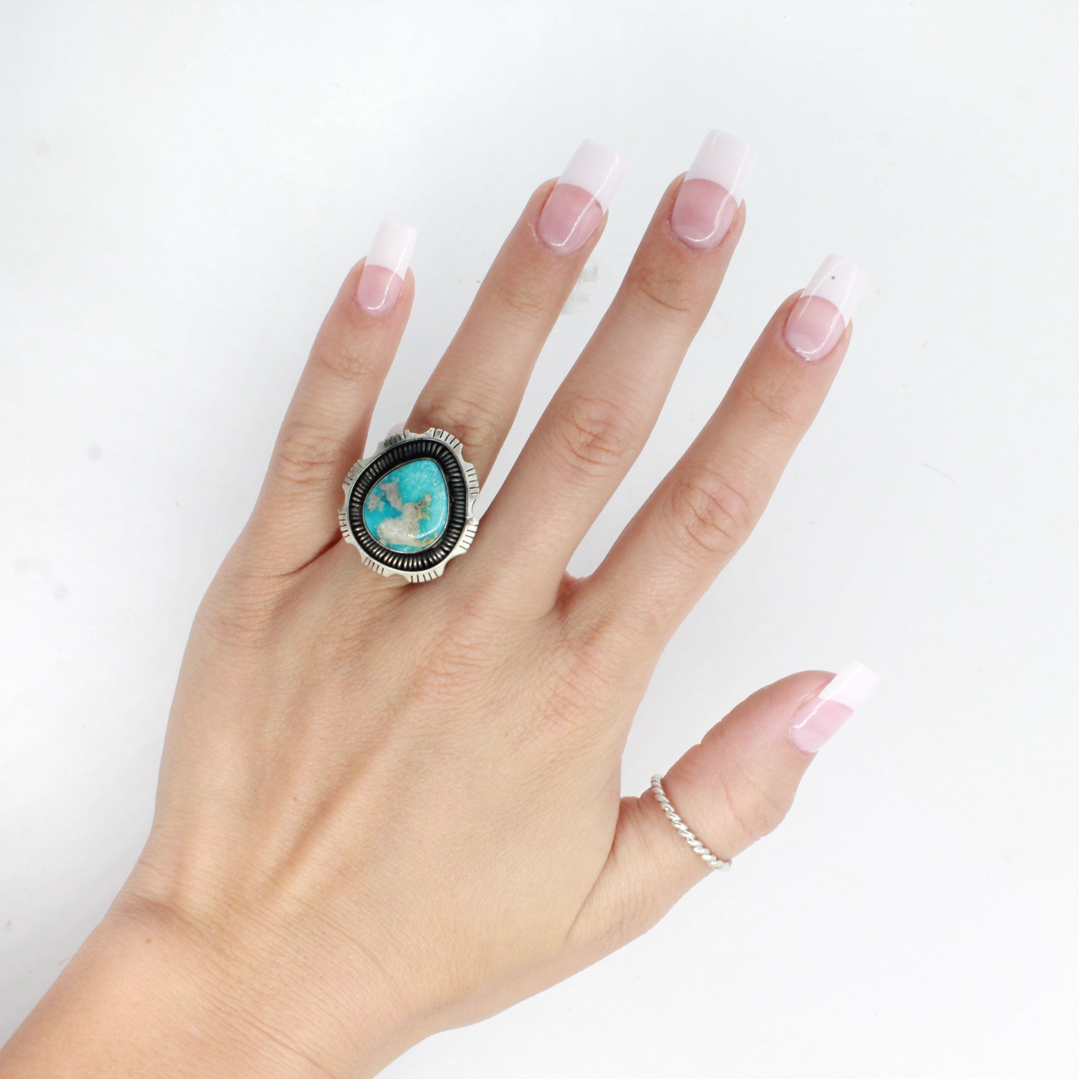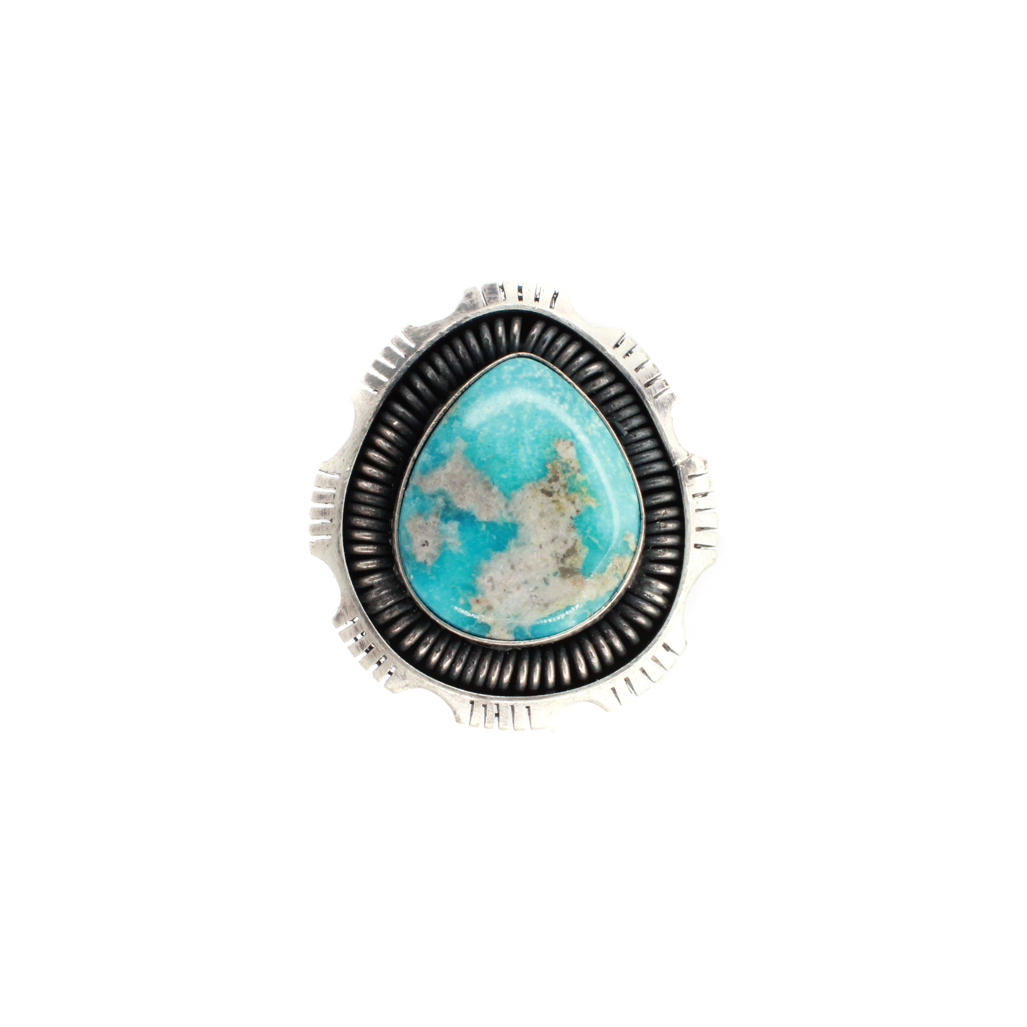Eli Skeets is renowned as a master silversmith, distinguished by his hallmark oxidized silver borders that beautifully frame stunning turquoise stones. His craftsmanship results in remarkable pieces that are true works of art. One standout creation is a statement ring that not only captivates the eye but is also destined to be a cherished treasure for generations to come.