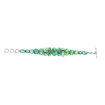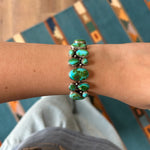 Loretta has a special fondness for turquoise, as it reminds her of her grandmother. Her jewelry style combines traditional techniques with a contemporary twist. She explains that her cluster-style pieces symbolize family, with the center representing the grandparents and the surrounding stones representing their children and grandchildren.